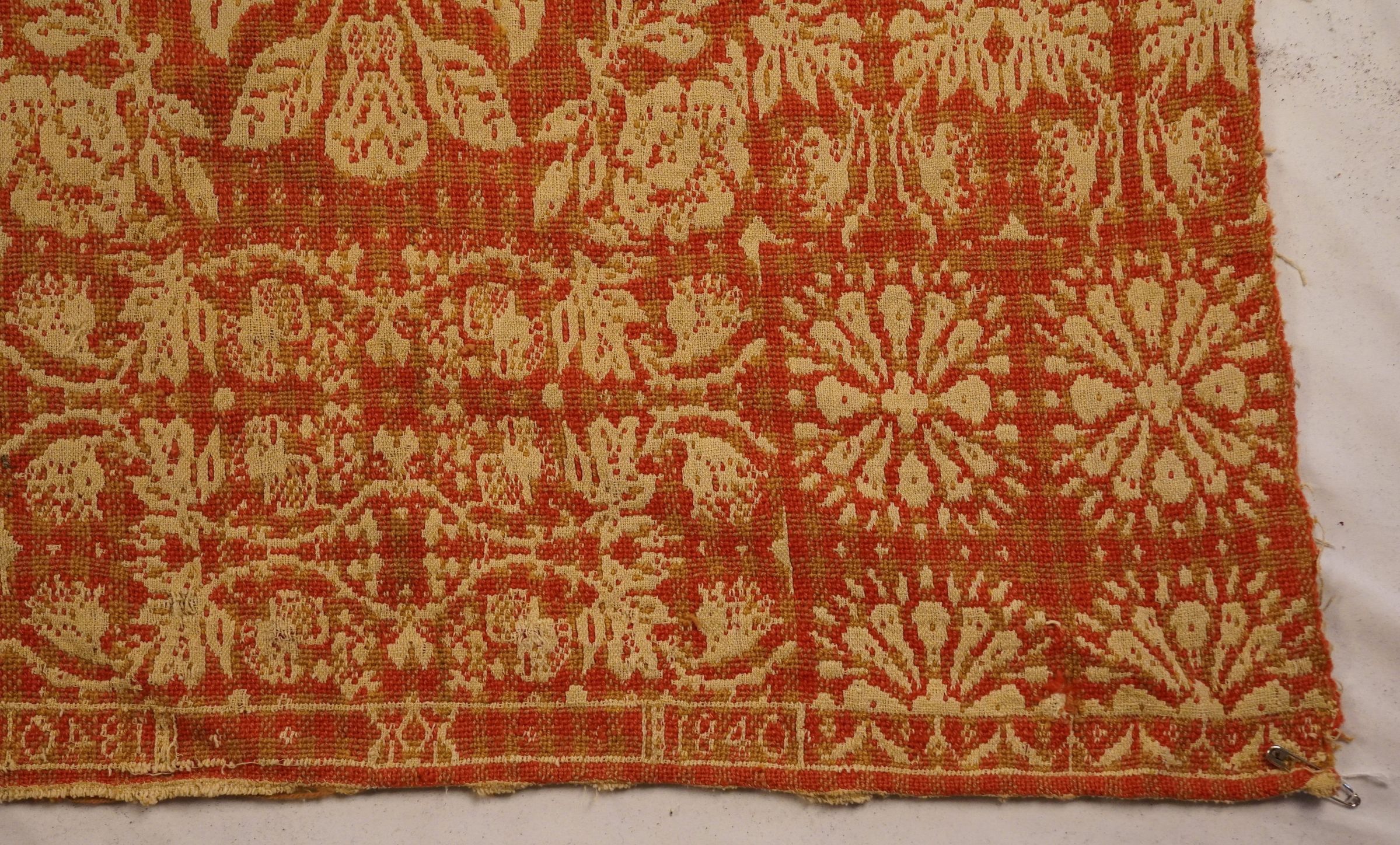 Natural, red, and green figured doubleweave coverlet; two panels joined by a center seam. No fringe; border on four sides.Collection