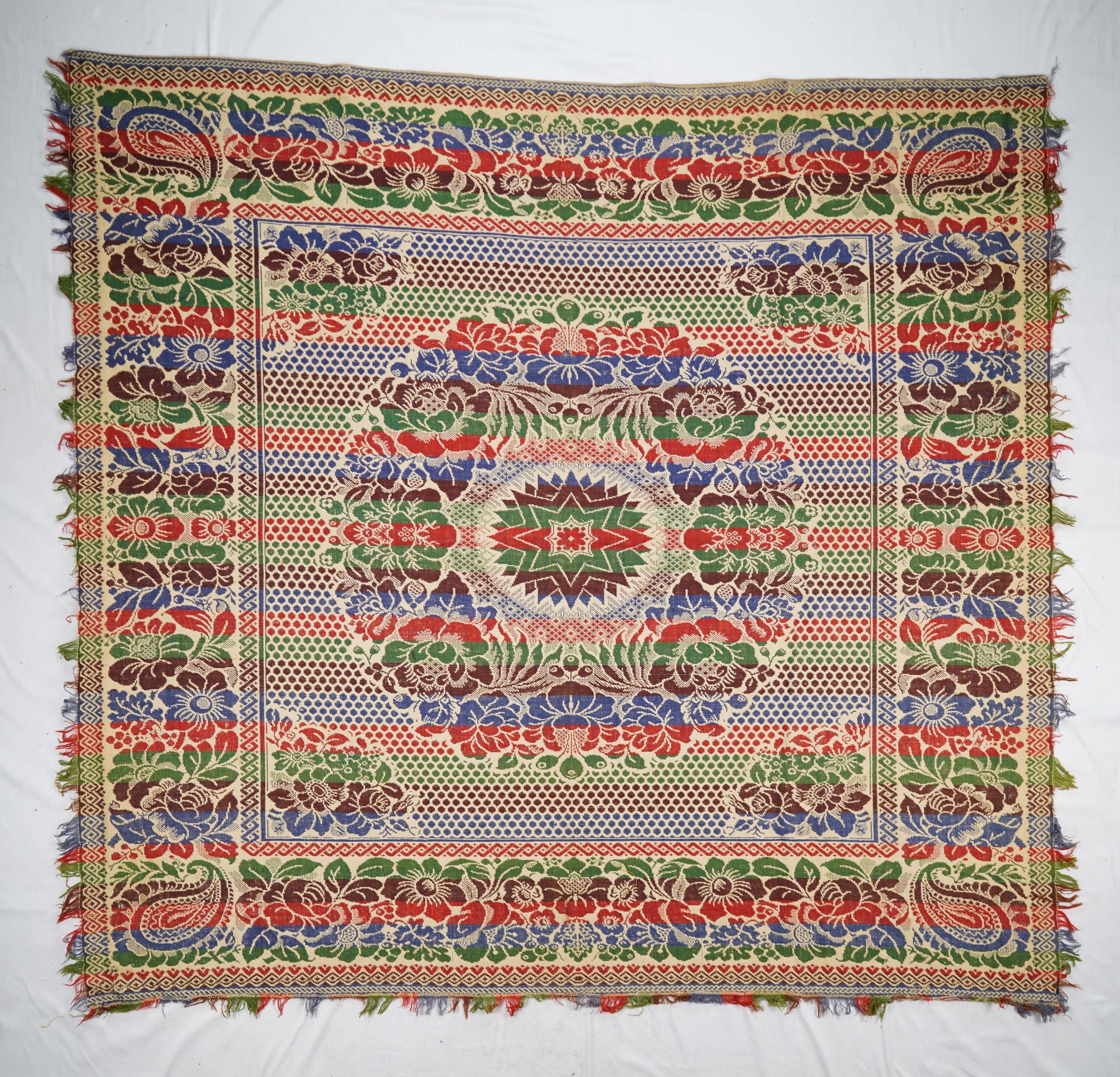 Natural, blue, red, and green figured doubleweave coverlet; seamless. Fringe on three sides; border on four sides.