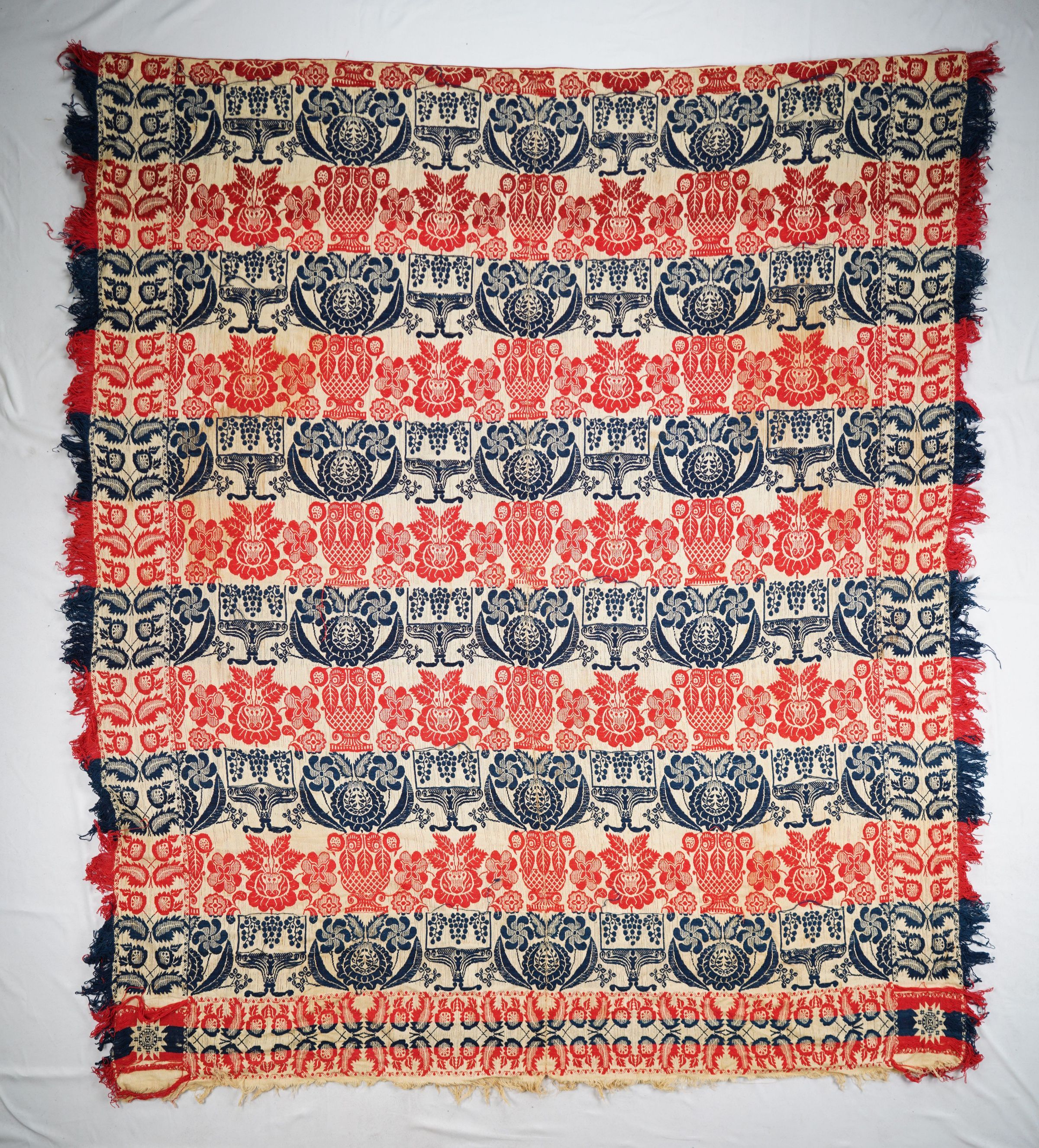 Navy, red, and natural figured tied Beiderwand coverlet; two panels joined by a center seam. Self-fringe and feather/leaf border on three sides; centerfield pattern of large flowers, buds, clovers, grapes, and leaves with vases or urns in alternating rows. Anonymous star logo used by an unidentified weaver in the vicinity of York Co., PA or Maryland.
