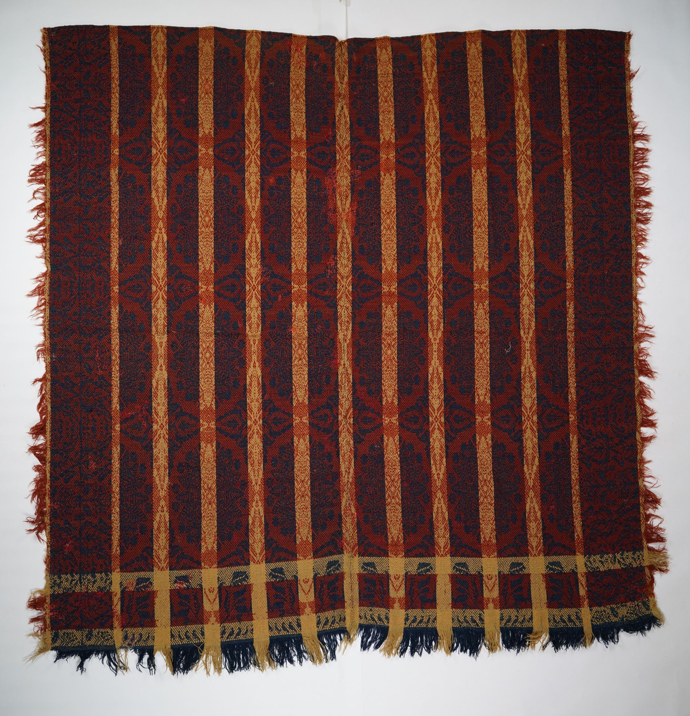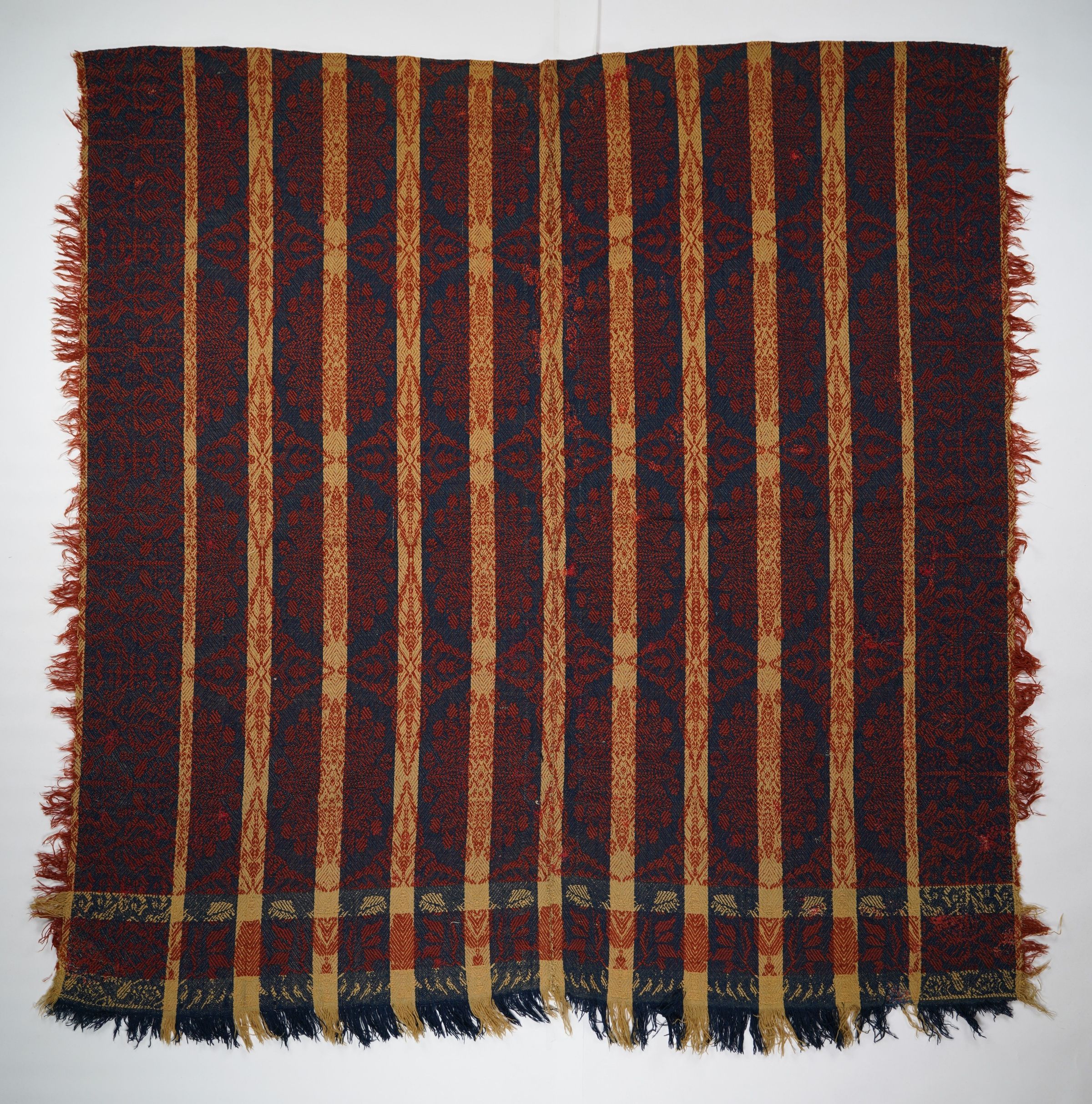 Yellow, red, and navy figured twill coverlet with border and self-fringe on three sides. Two joined panels.