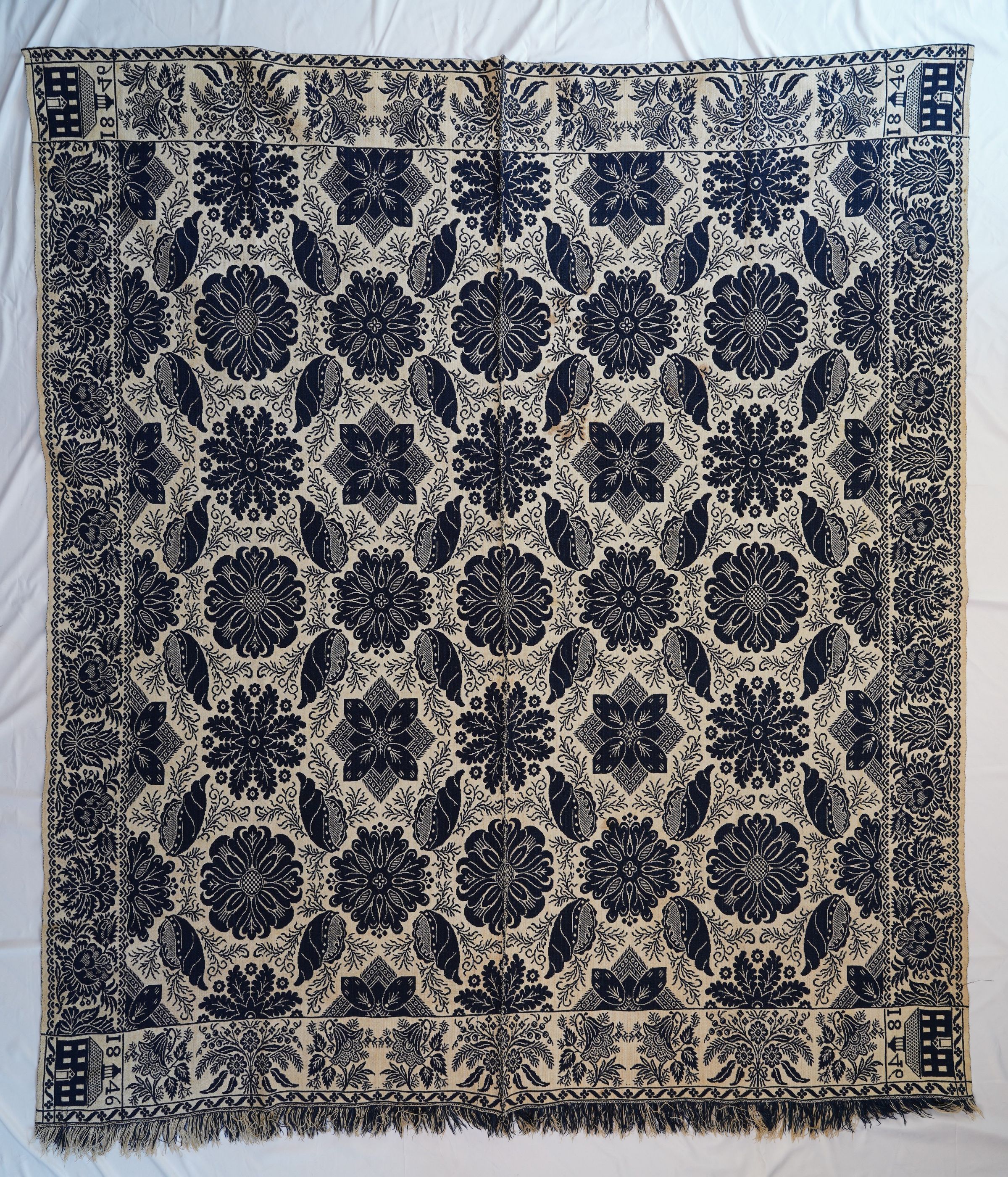 Natural and navy figured double weave coverlet; two panels joined by a center seam. Border on four sides, fringe on bottom.Collection