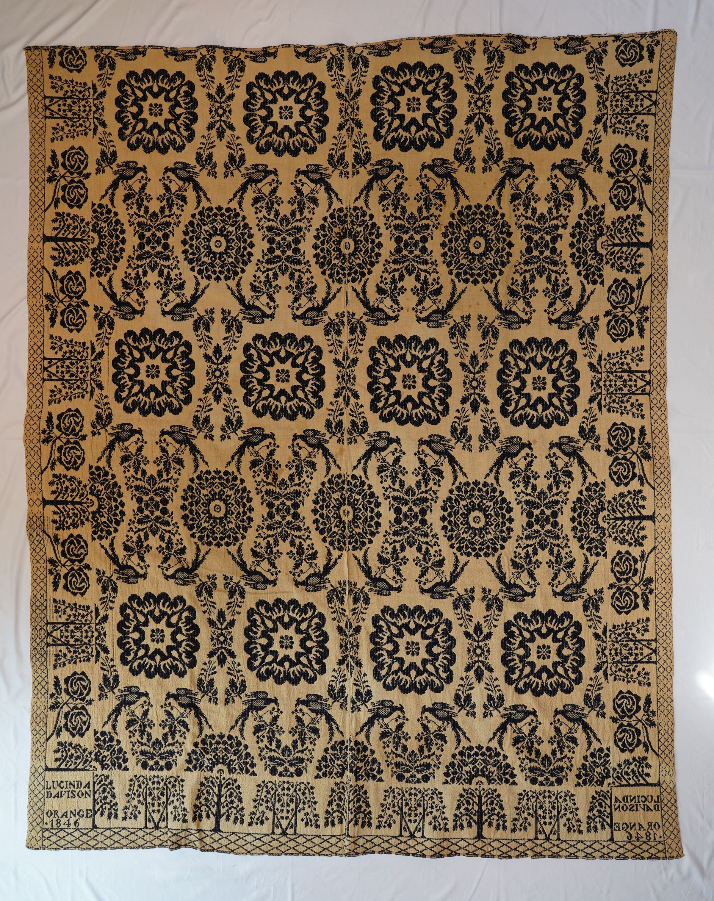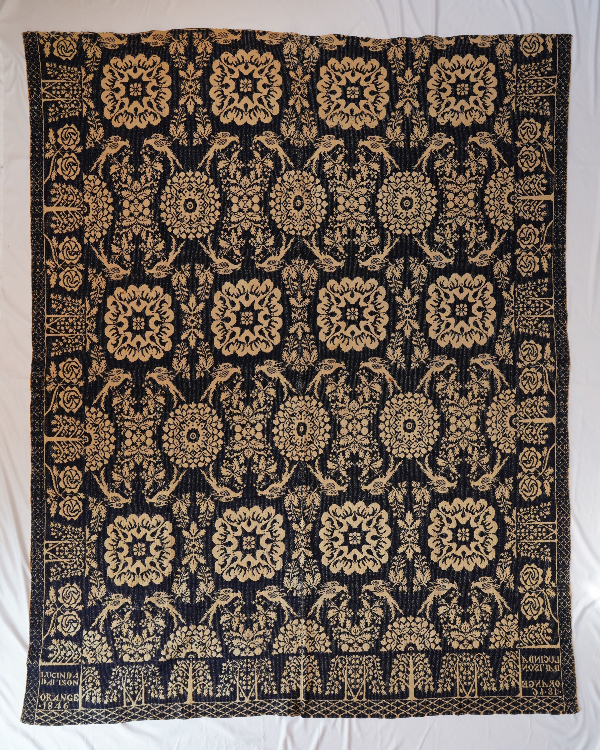 Natural and navy figured double weave coverlet; two panels joined by a center seam. Border on three sides, no fringe.Collection