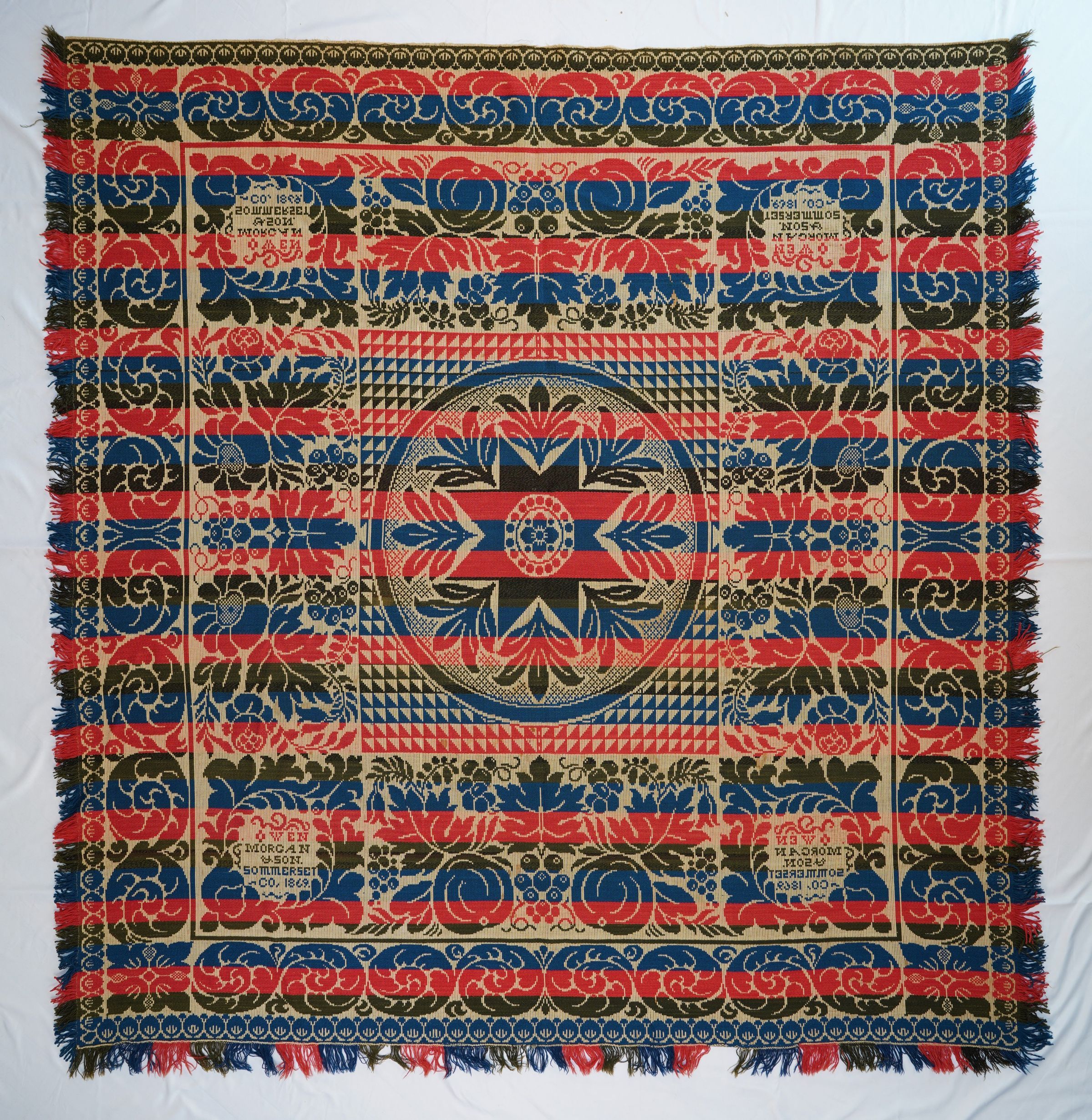 Natural, blue, green, and red figured tied beiderwand coverlet; seamless. Border on four sides, fringe on three sides.Collection