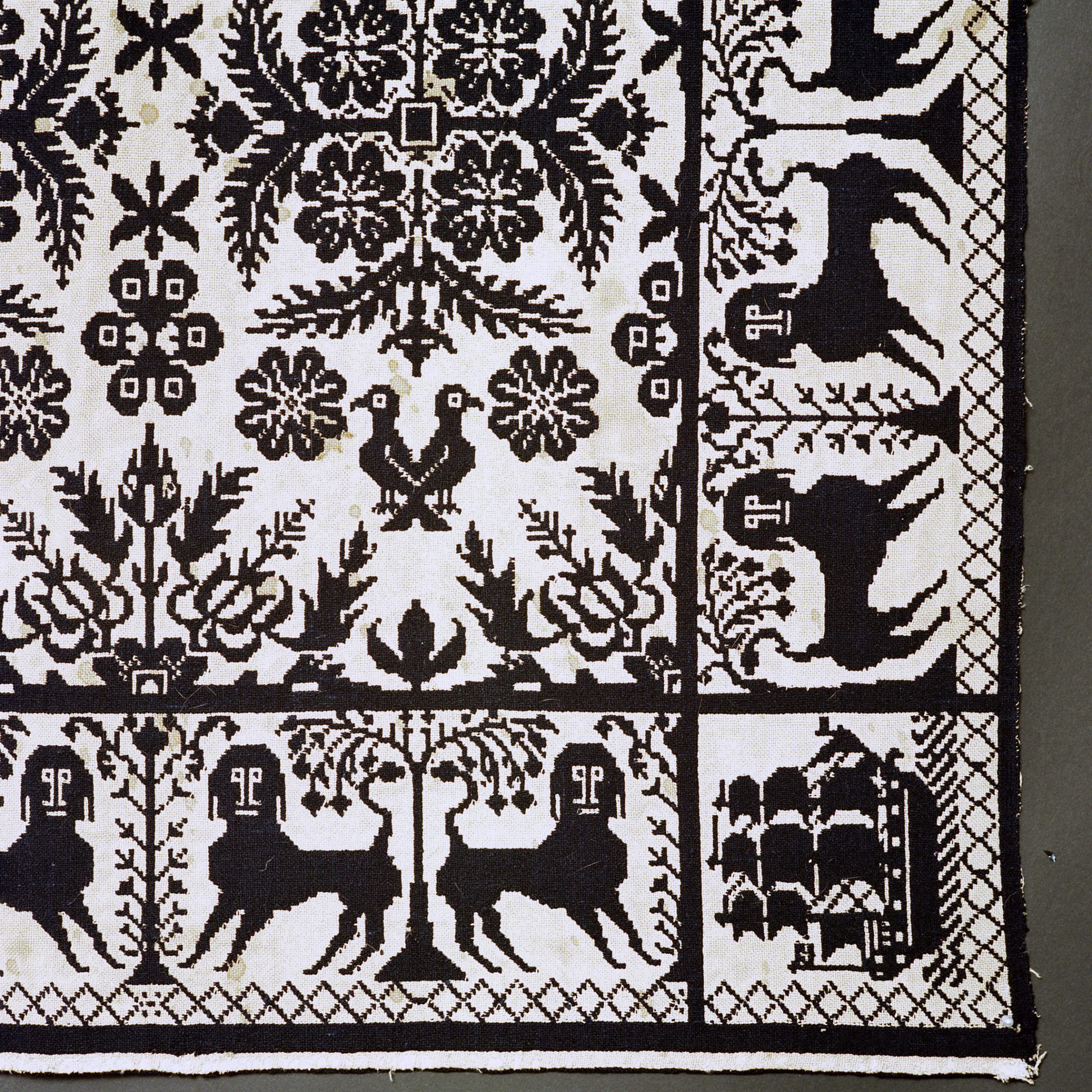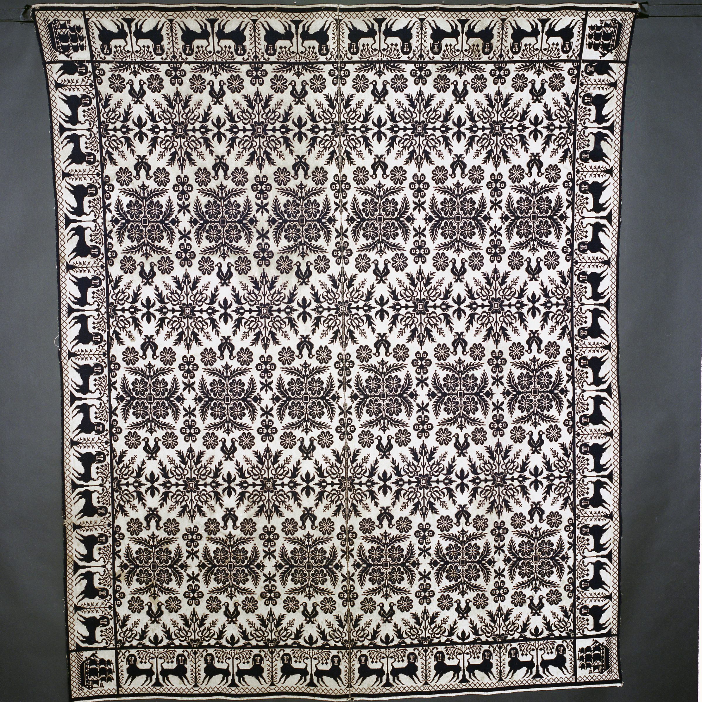 Double weave; navy, natural; two loom widths joined; fringe on 3 sides; single border of dogs and trees; four corner blocks, each with a sailing ship; floral centerfieldCollection