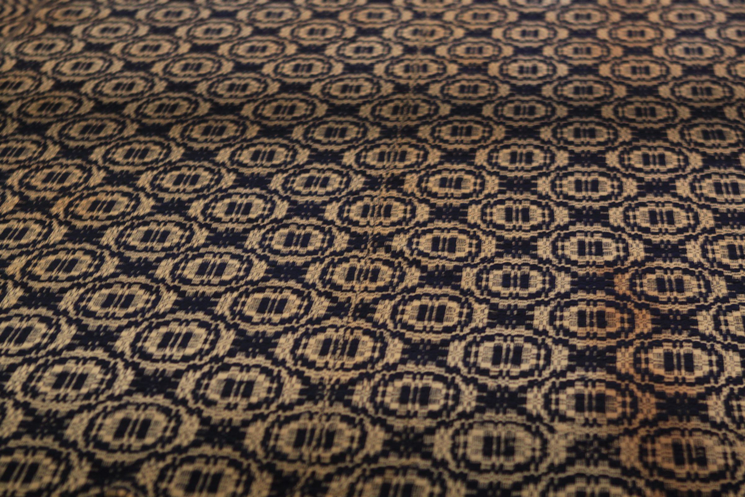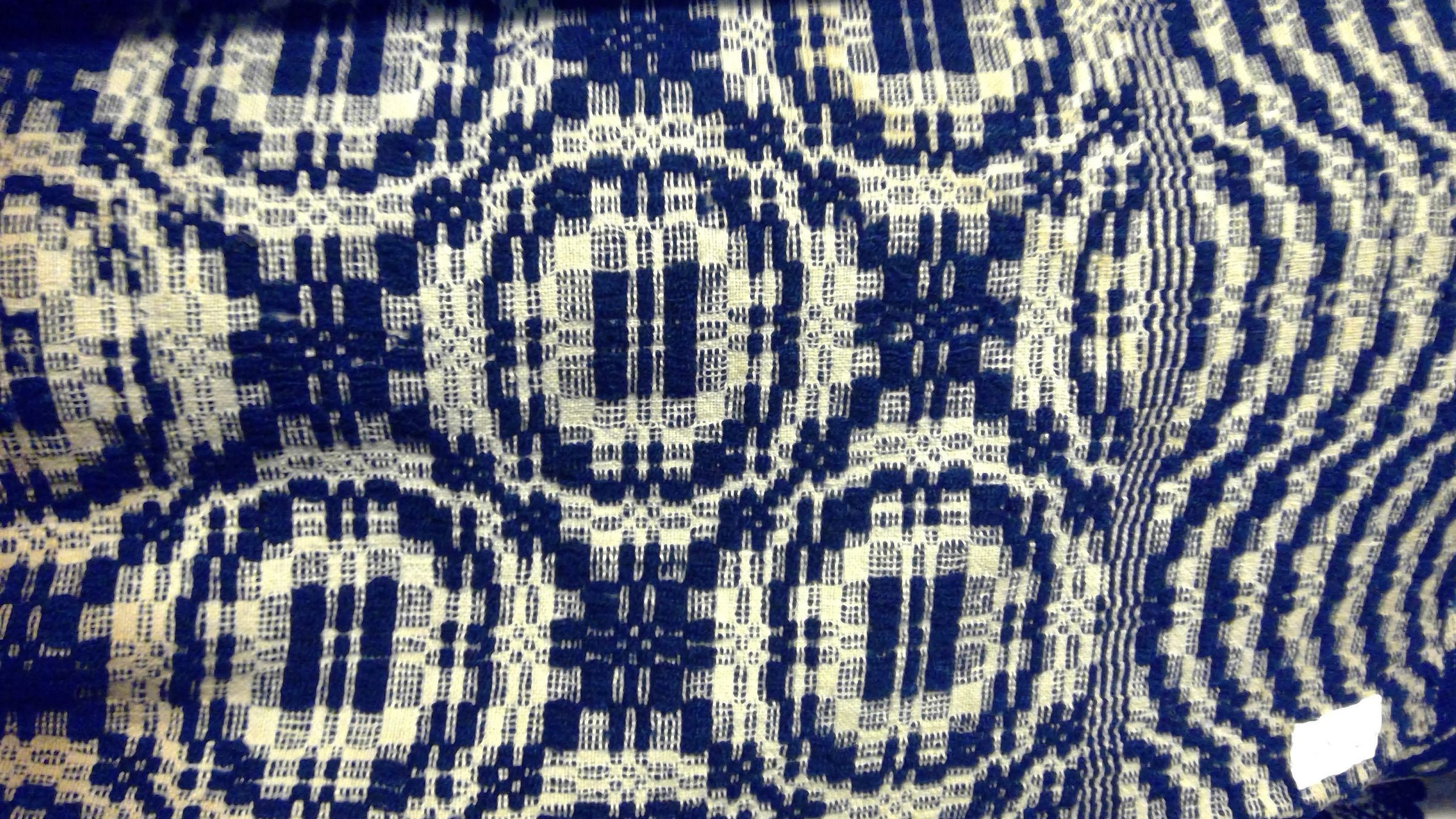 Overshot; navy, natural; two loom widths joined; no fringe; no corner blocks; squiggle border on 3 sides; rows of circles in centerfield. Wheel of fortune pattern.Collection