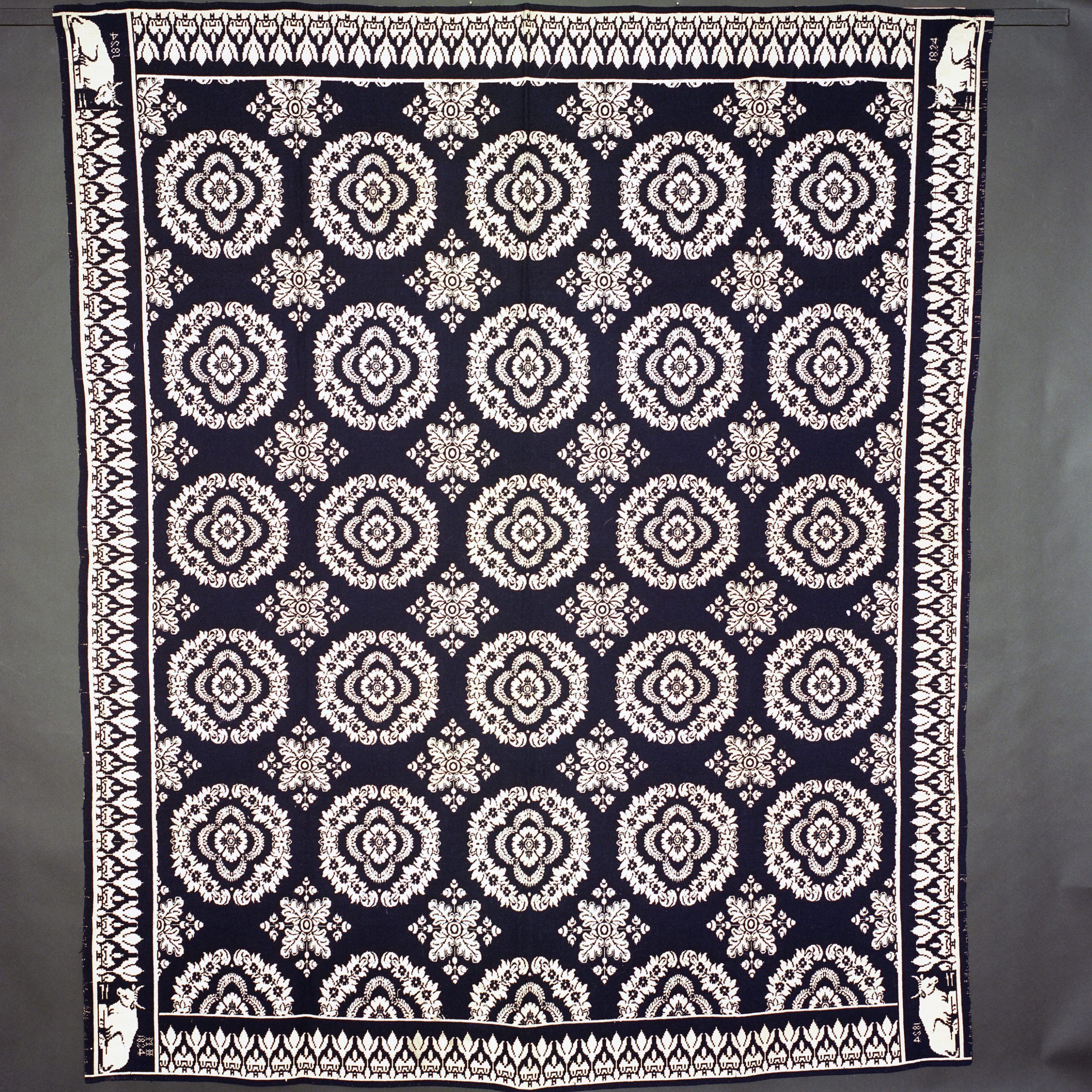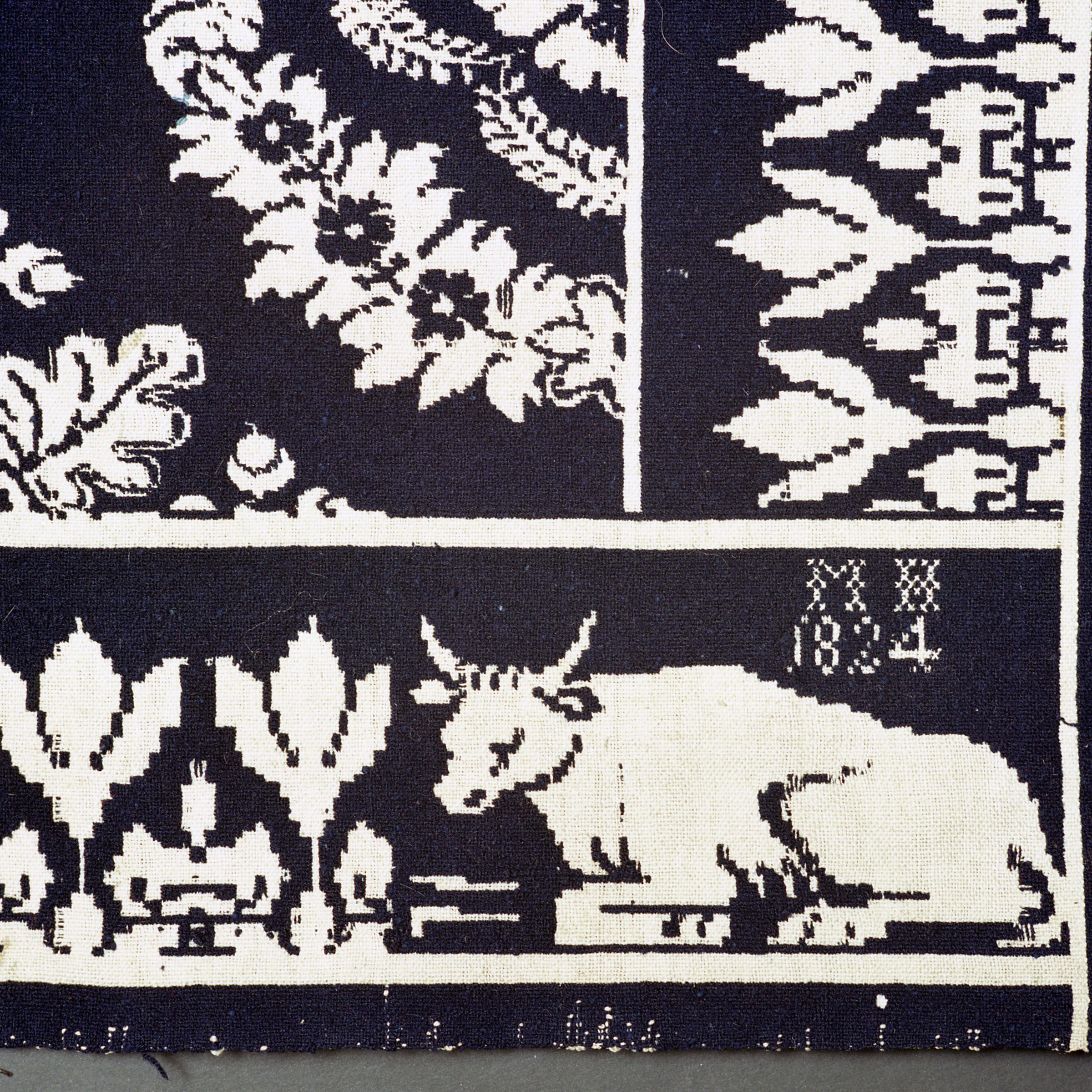 Double weave; seamless; navy, natural; no fringe; corner blocks in all 4 corners that have laying oxen; border on all 4 sides of tulip-like flowers; centerfield of floral wreaths; 5x5 and leaf square between themCollection