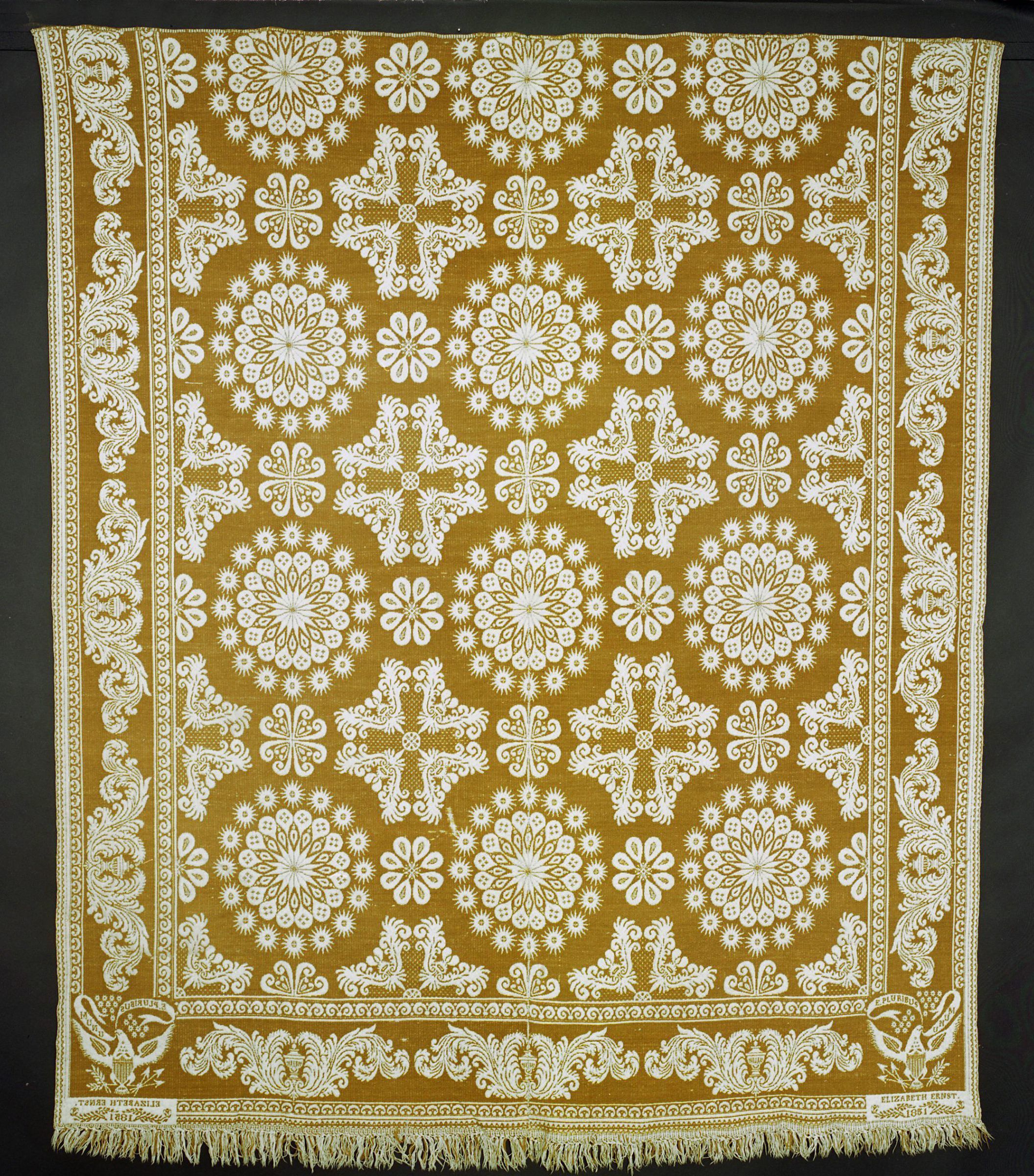 Beiderwand; gold, natural; two loom widths joined; fringe on one side; border on 3 sides; bottom border on larger scale, urns with feathers swirling from each side; 2 corner blocks with eagles with shield bodies holding wheat, arrows, and E P Unum banner; centerfield of pin dotted crosses; circular flowers surrounded by starsCollection