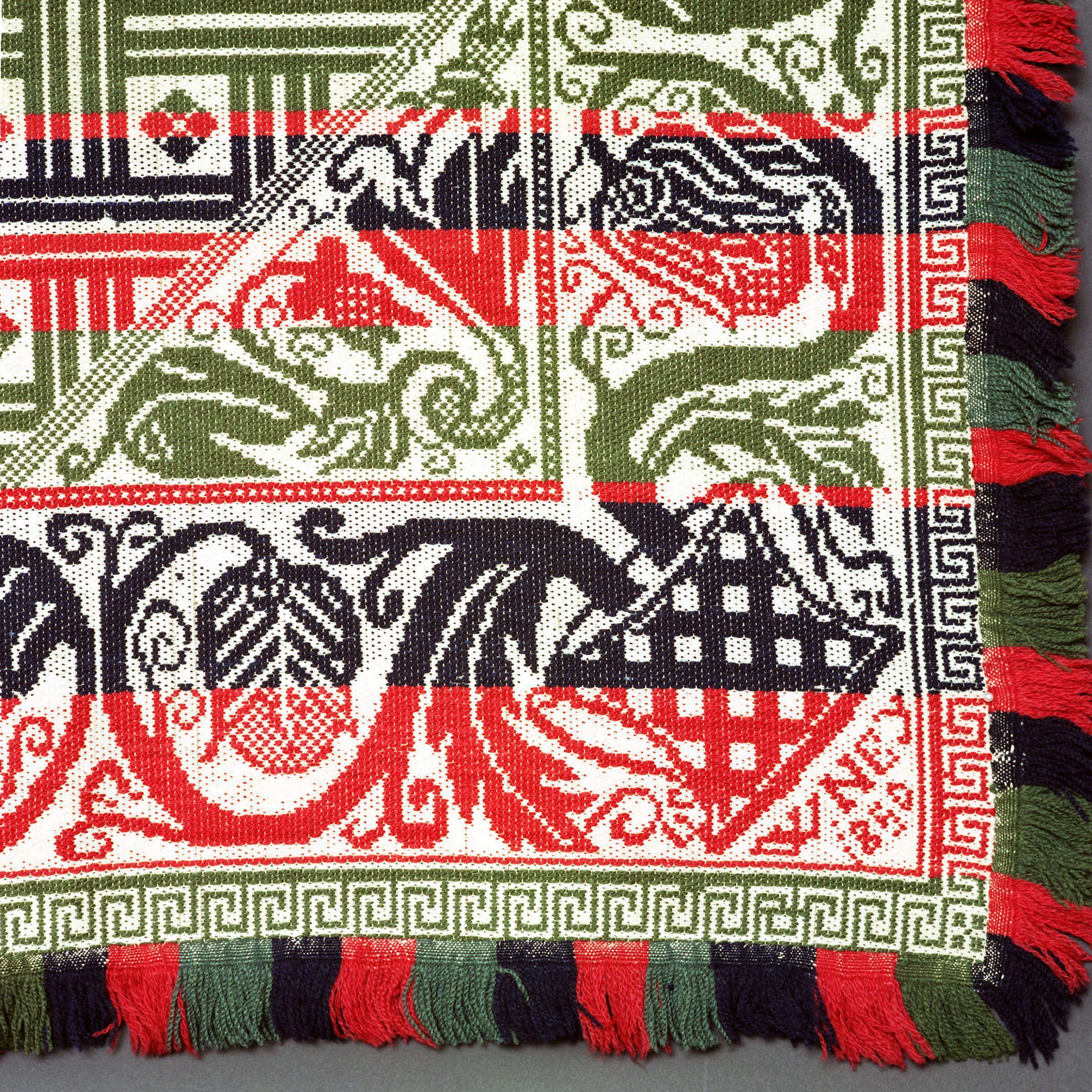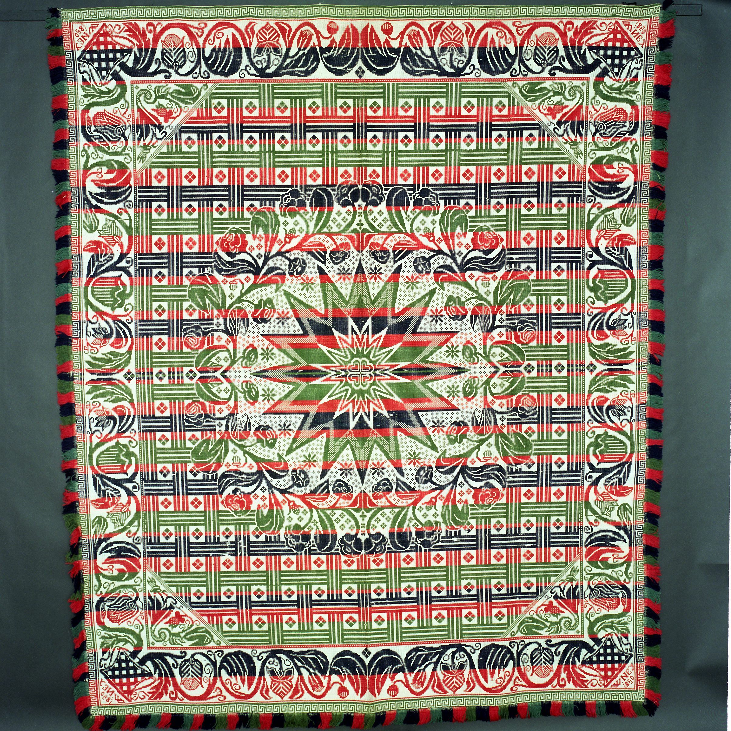Beiderwand; navy, red, green, natural; seamless; fringe on 3 sides; 4 corner blocks with flowerpot and inscription; floral border on all 4 sides; large star for center medallion; line and diamond pattern on the rest of the centerfieldCollection