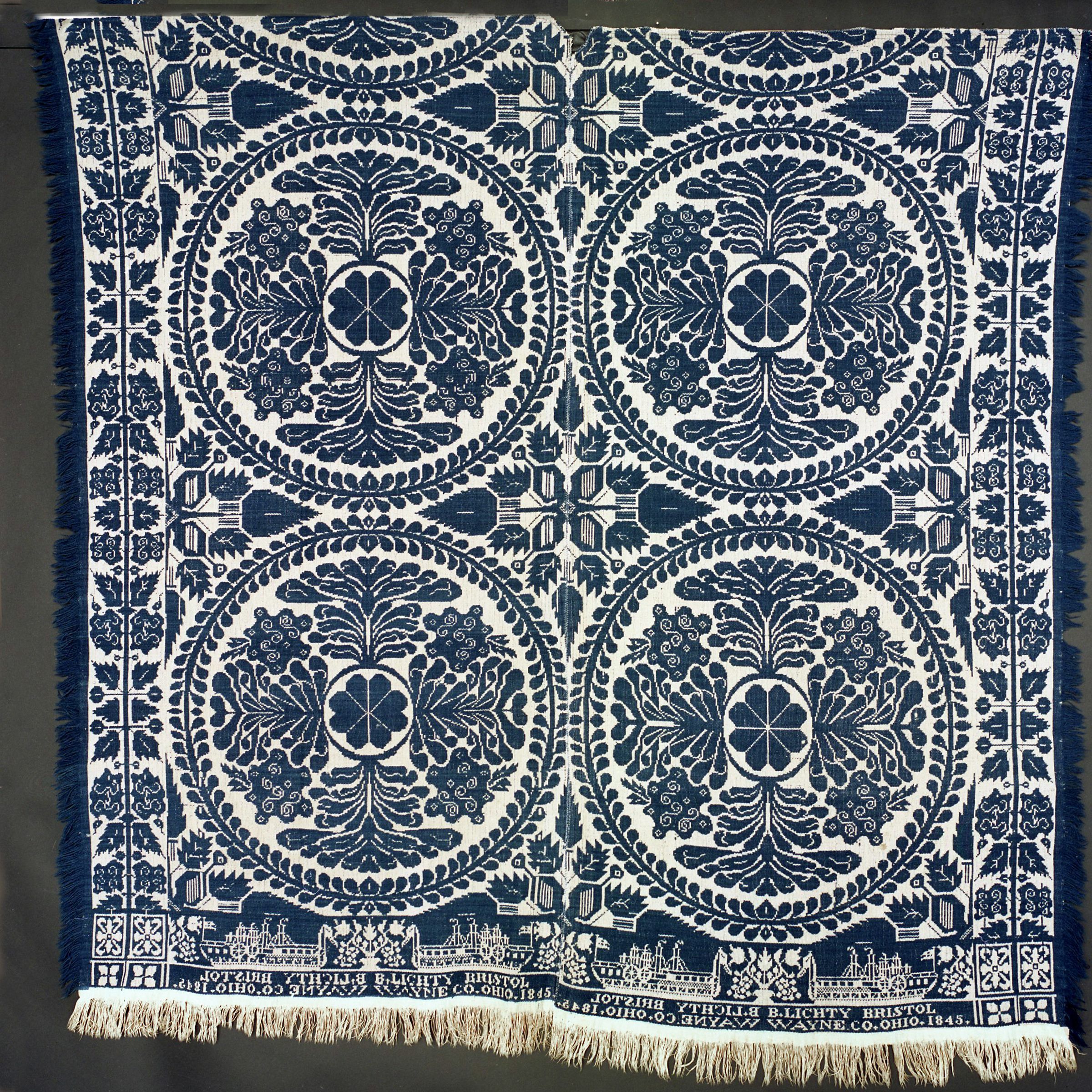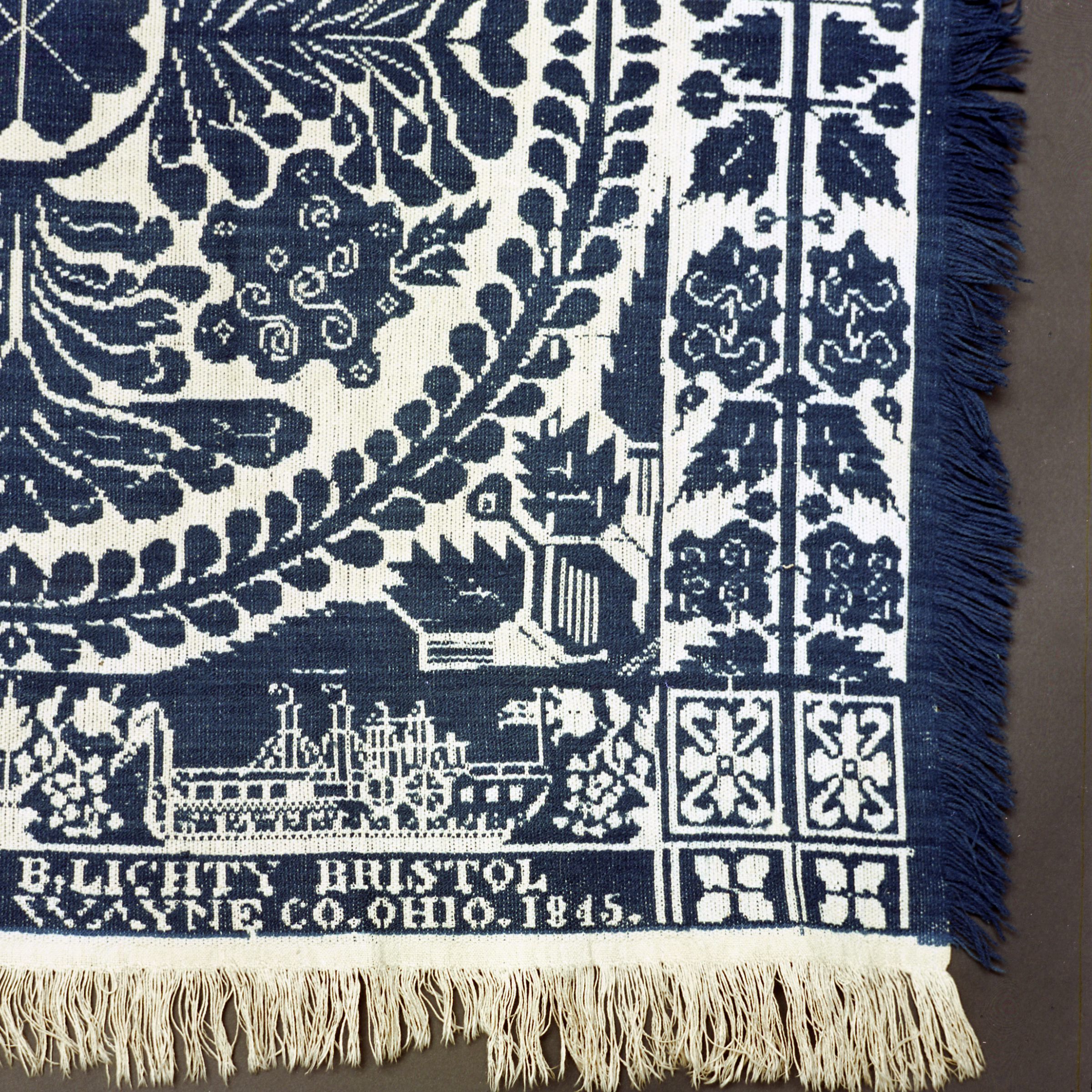 Beiderwand; two loom widths joined; natural, navy; fringe on 3 sides; two corner blocks with 4 flowers in each; border on 3 sides; long edges have two small rows of leaves; bottom border contain inscriptions and flowers and boats (steamships?); centerfield has 4 floral medallions with leaves in betweenCollection
