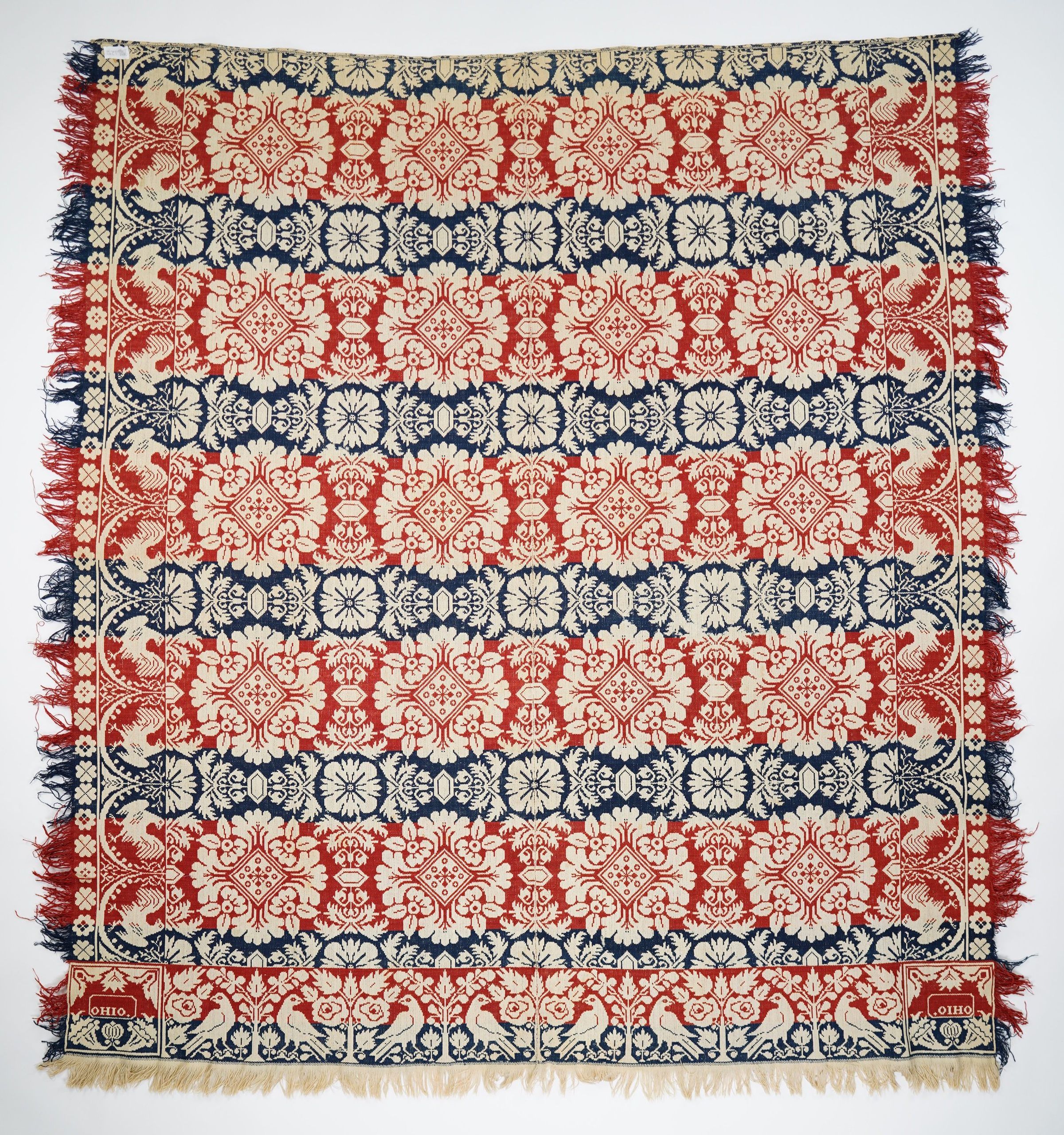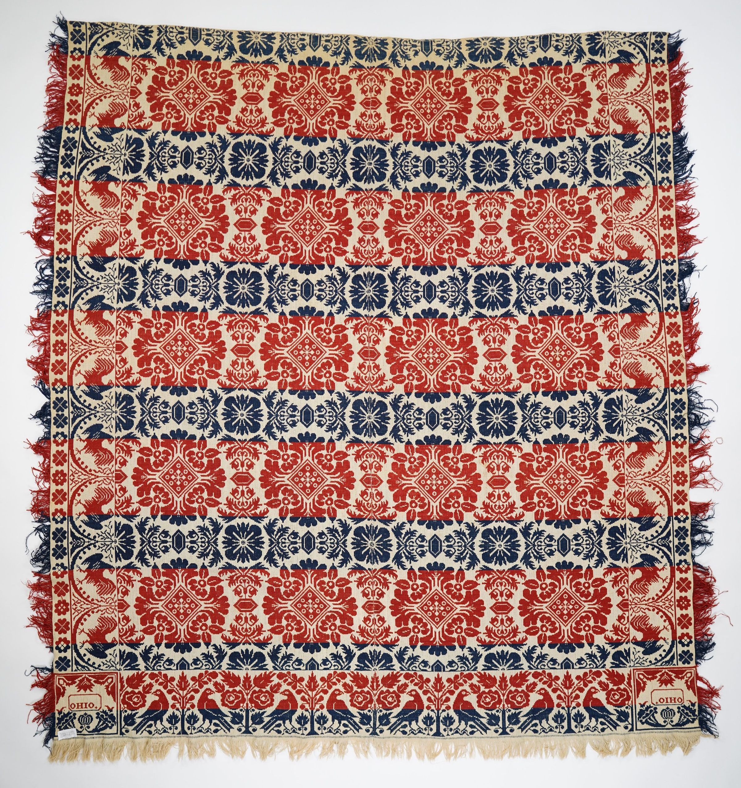 Beiderwand; red, navy, natural; two loom widths joined; self-fringe on 3 sides; border on 3 sides, two have eagles above banner like designs; bottom of double rosette trees and distelfinks; 2 corner blocks with inscription; centerfield of diamonds withing floral designs, strips of colorCollection
