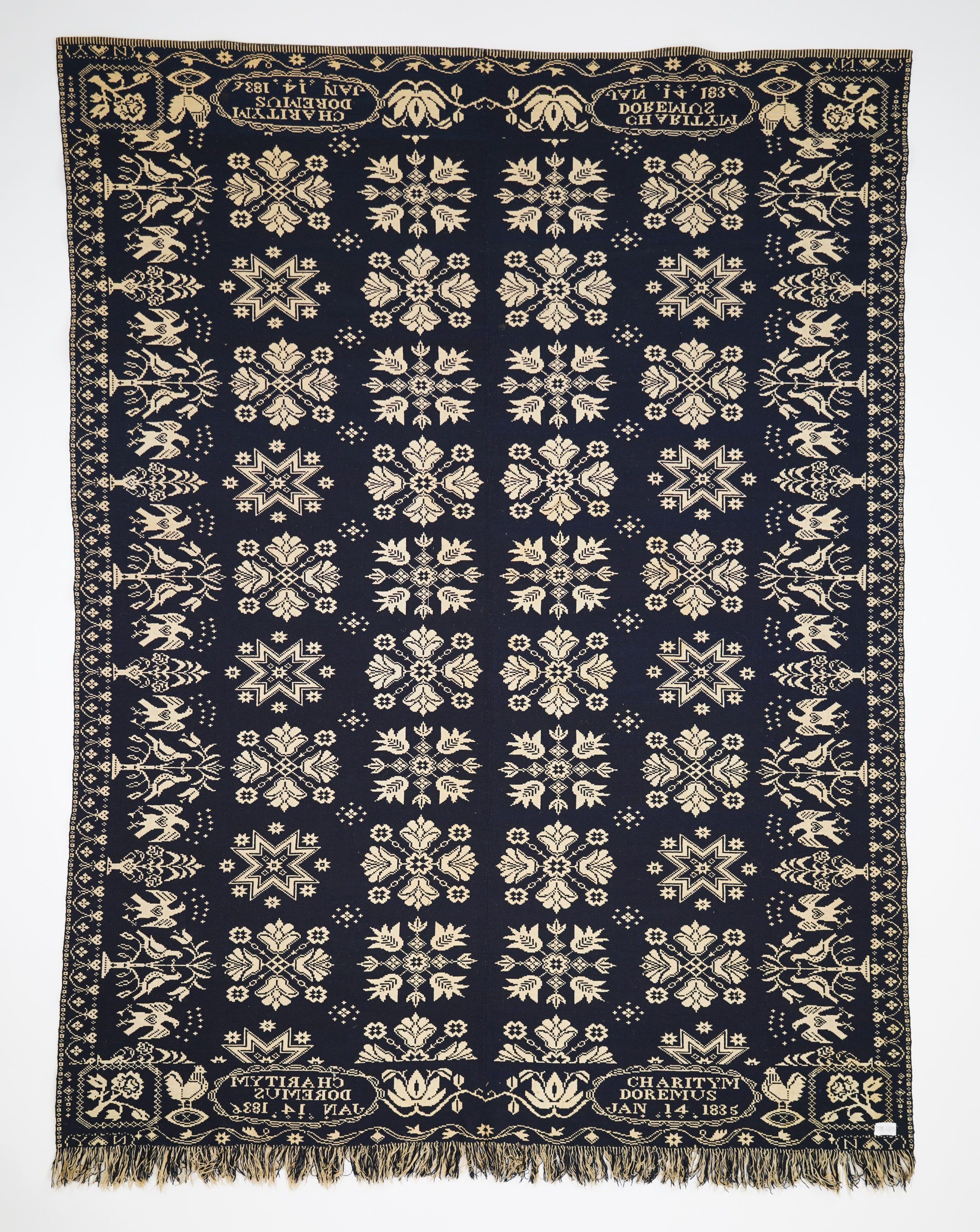 Double weave; navy, natural, seamless; self fringe on bottom, 2 loom widths; side outer borders have small hearts and swag; top and bottom outer border have leaves, stars, and swag; side inner borders of eagles, distelfinks, stars, and plants; top and bottom inner border has chickens, flowers and inscription; centerfield contains rows of floral and starry medallions; four corner blocks with flower inside square