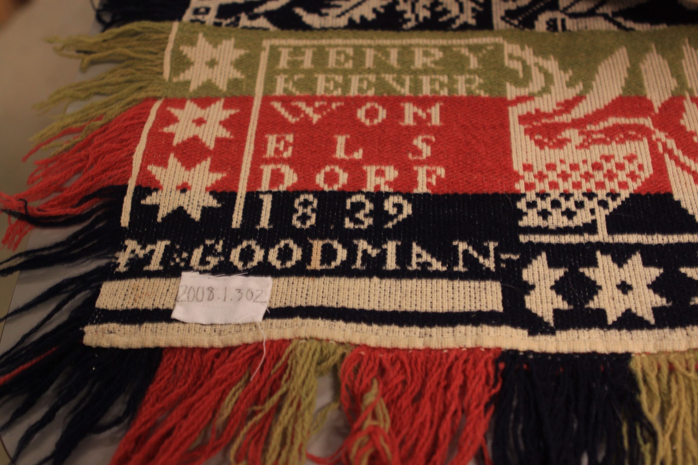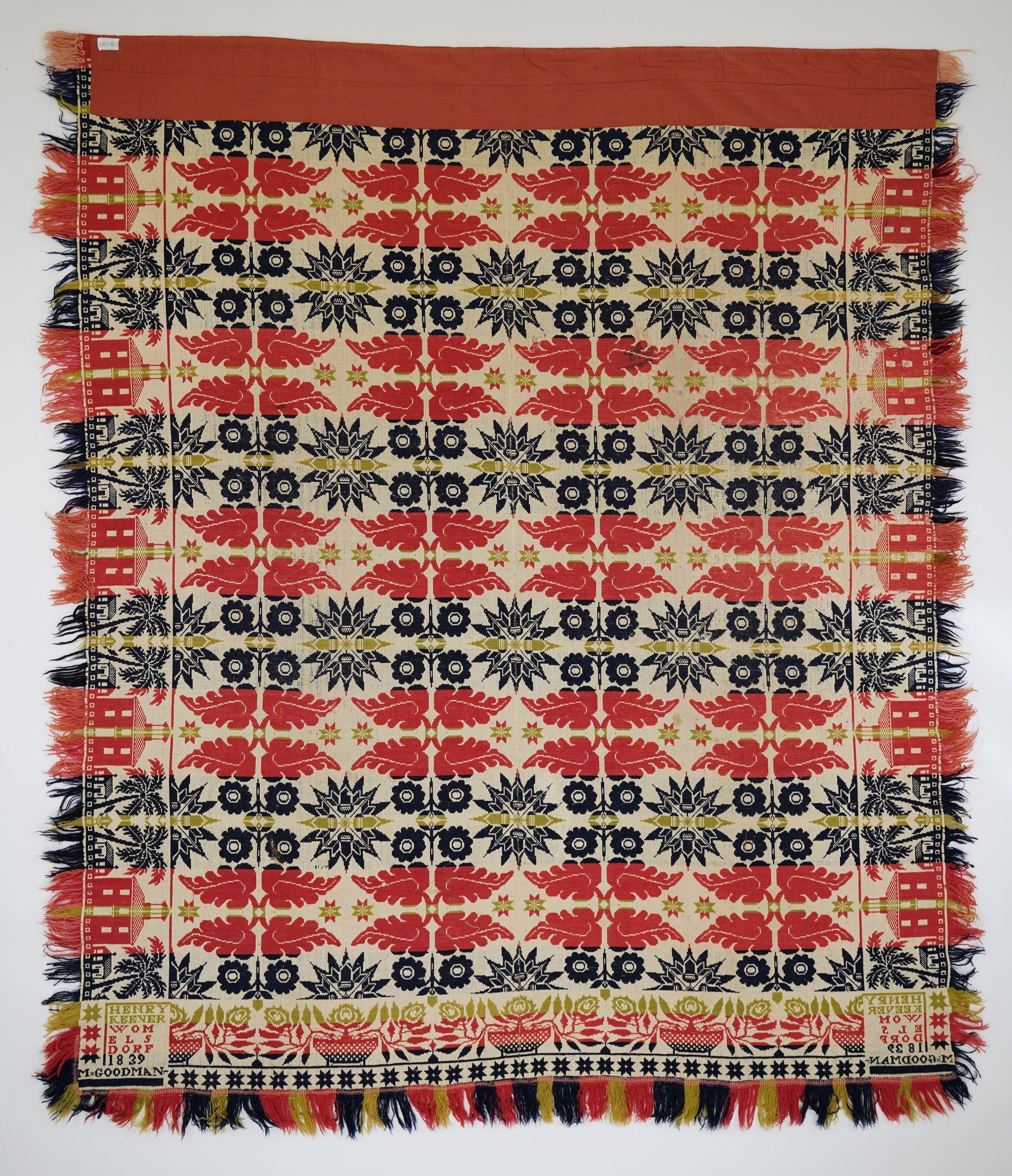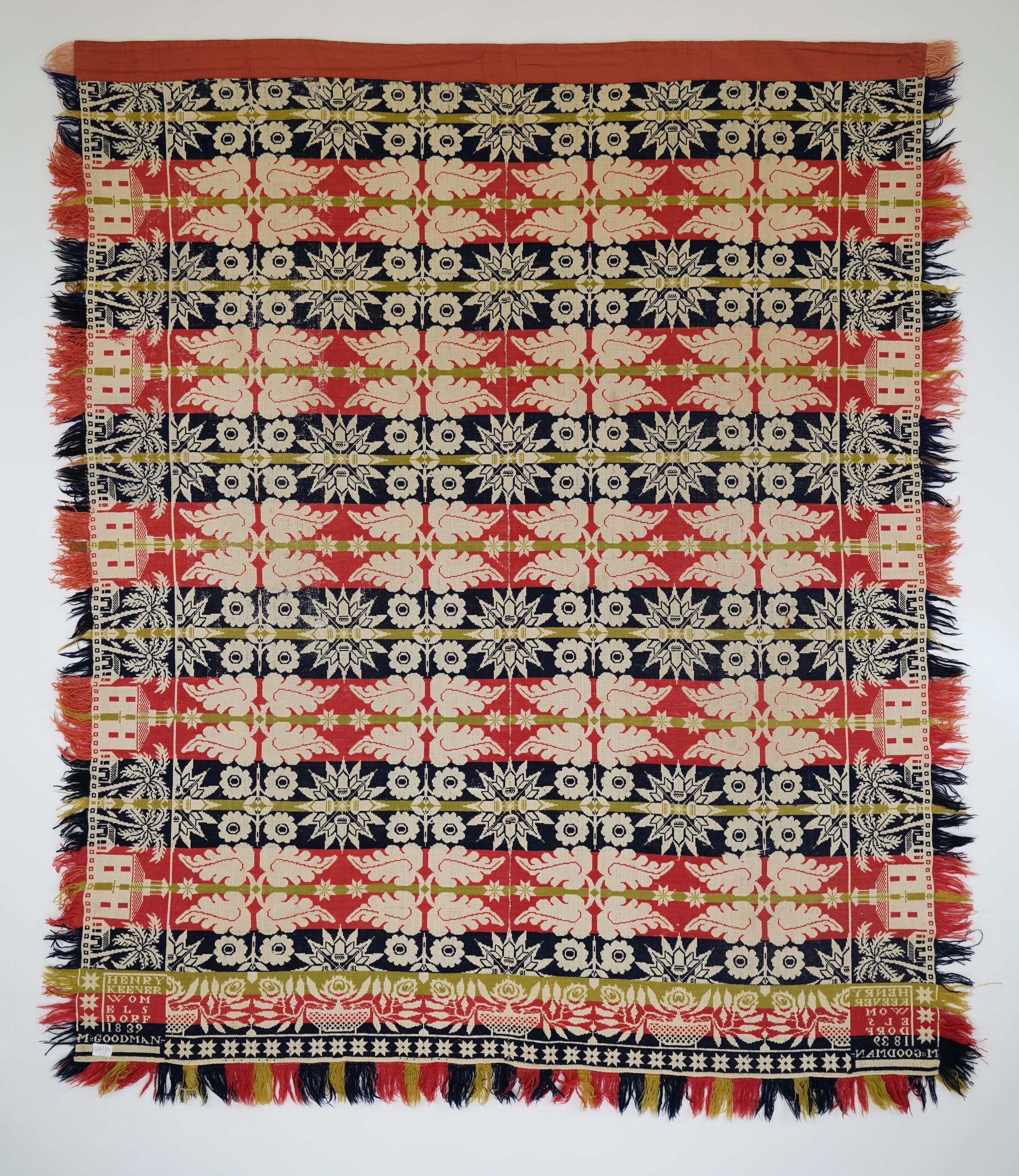 Beiderwand; navy, green, red, natural; two loom widths joined; self fringe on sides, applied fringe on bottom; side borders of palm trees, houses, school buildings or churches, plus 3 stars by each corner block; bottom border of stars under potted flowers; red cloth sewn to top border; rows of stars and leaves and flowers in centerfield, strips of colorCollection
