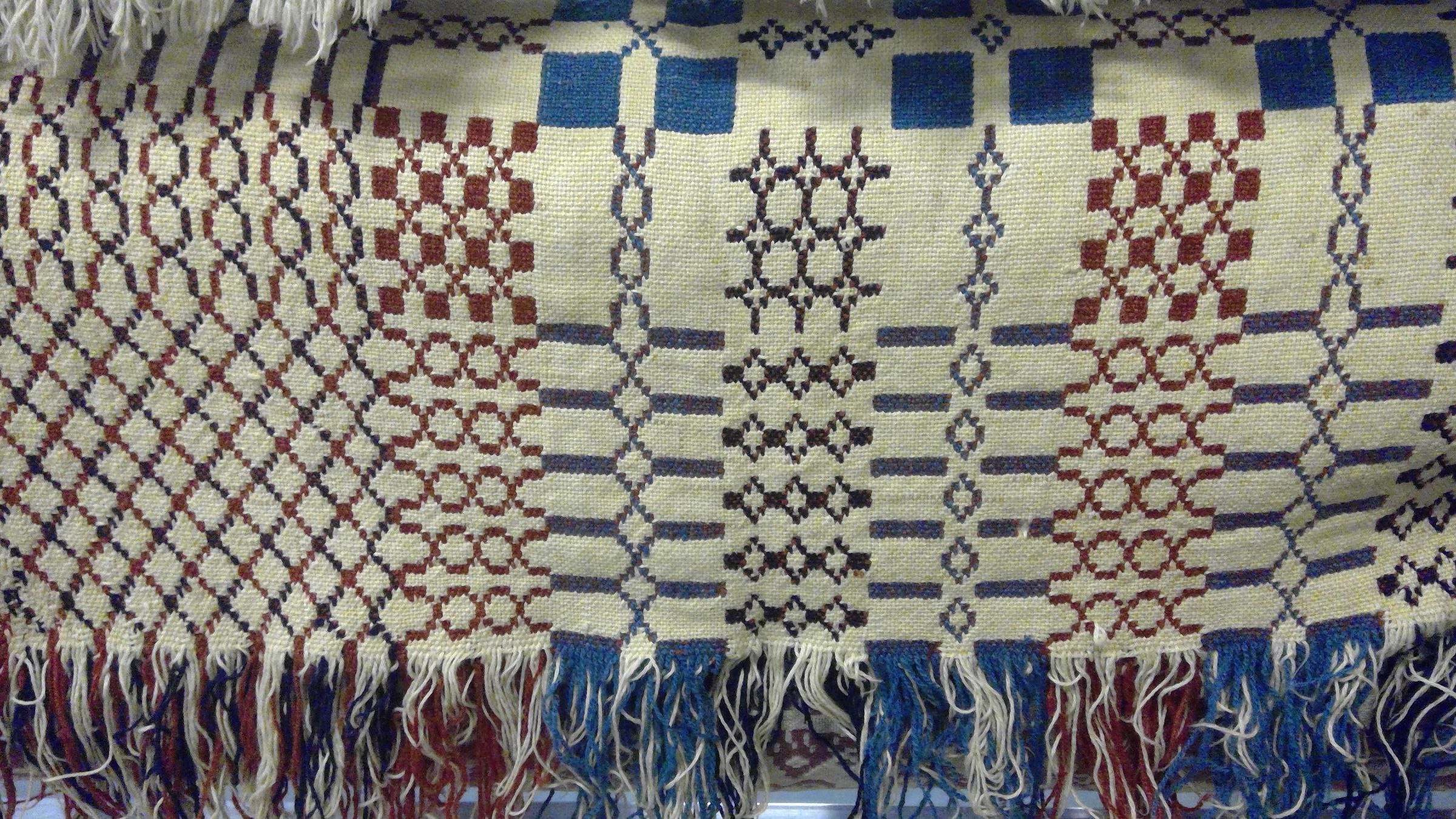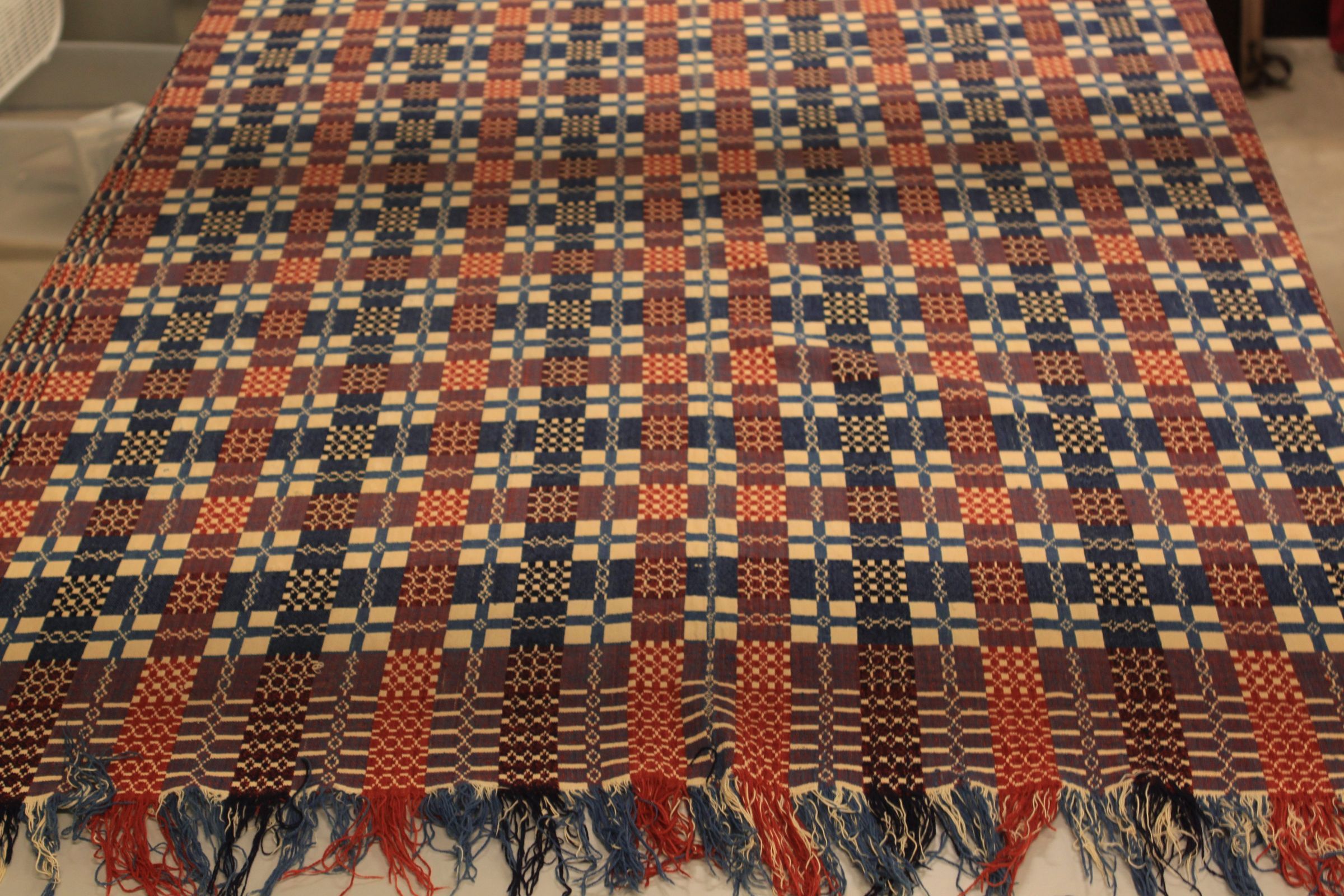 Double weave; geometric; light blue, navy, natural, red (purple mix); fringe on 3 sides; 2 loom widths joined; border on 3 sides where aspects of centerfield portion are repeated in large strips; centerfield of squares alternating various geometric patterns - checker, cross, diamond, etc.Collection