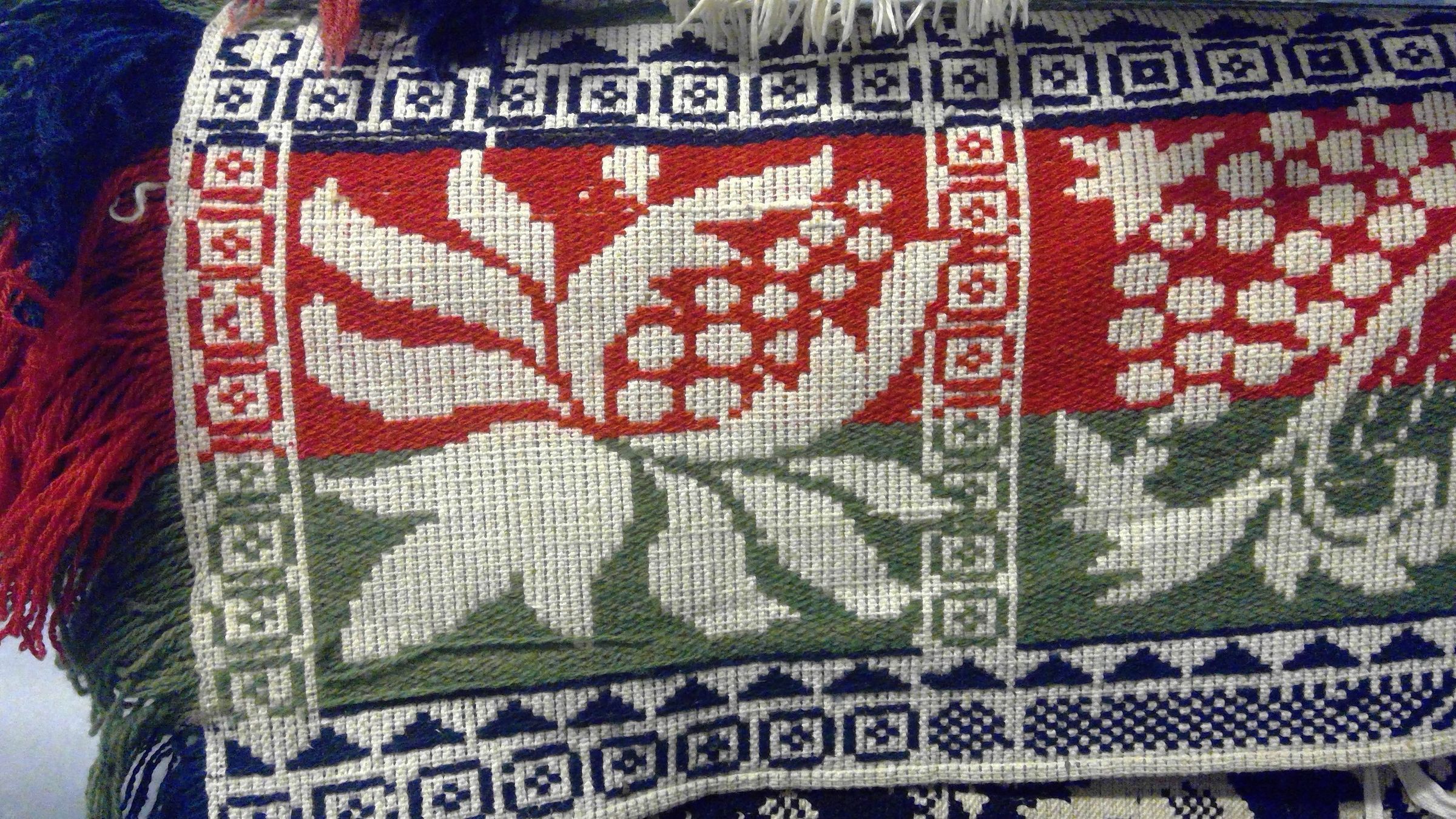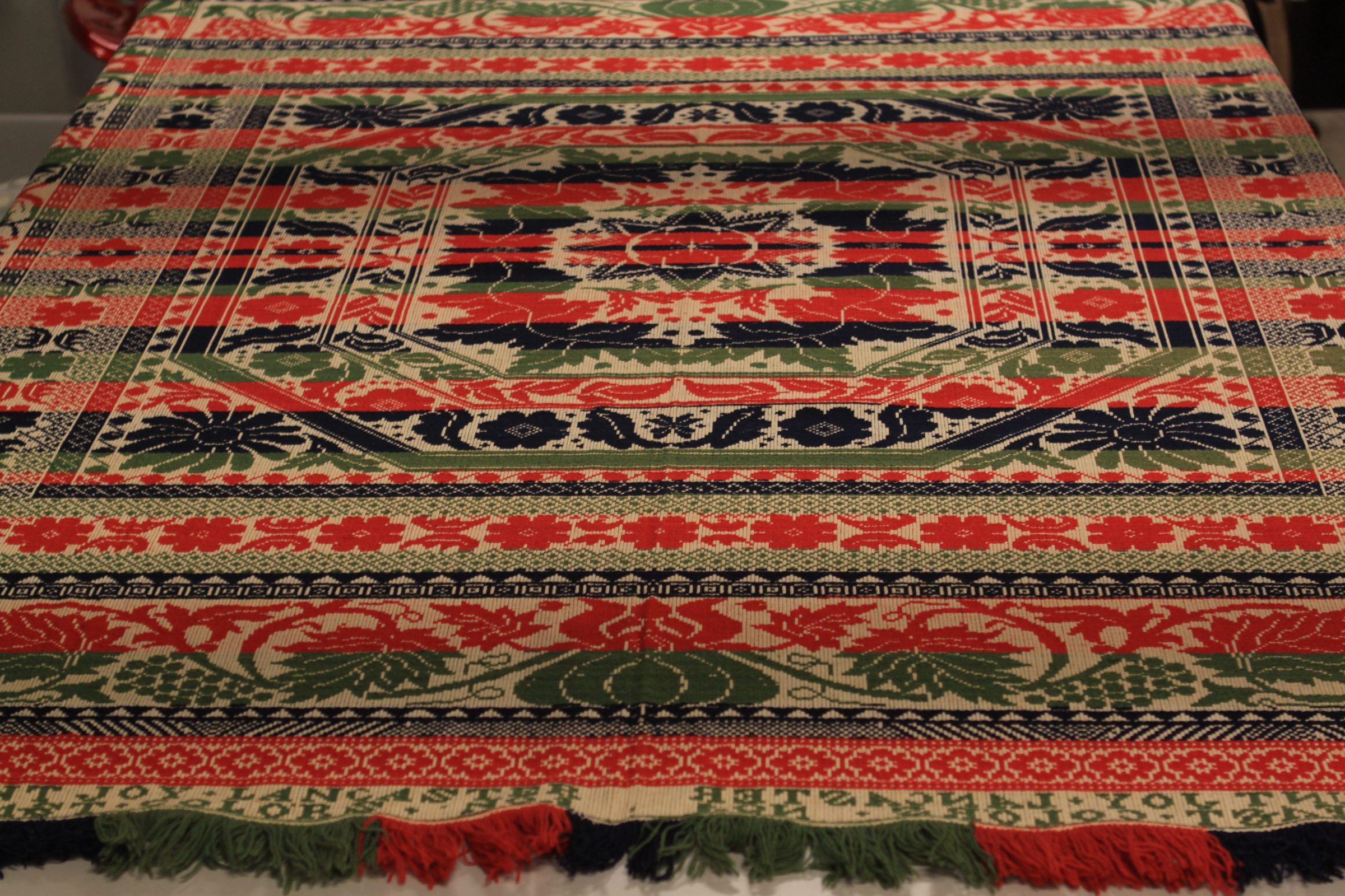 Beiderwand; red, navy, green, natural; seamless; fringe on 3 sides; border on 4 sides of grapevine; corner blocks (4) have berried inside; centerfield has center medallion star surrounded by leaves in octagon in square; other floral patterns within these; bottom strip with inscriptionCollection
