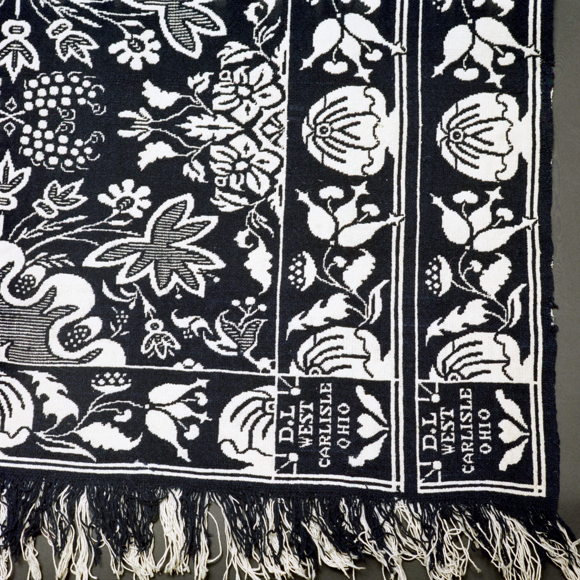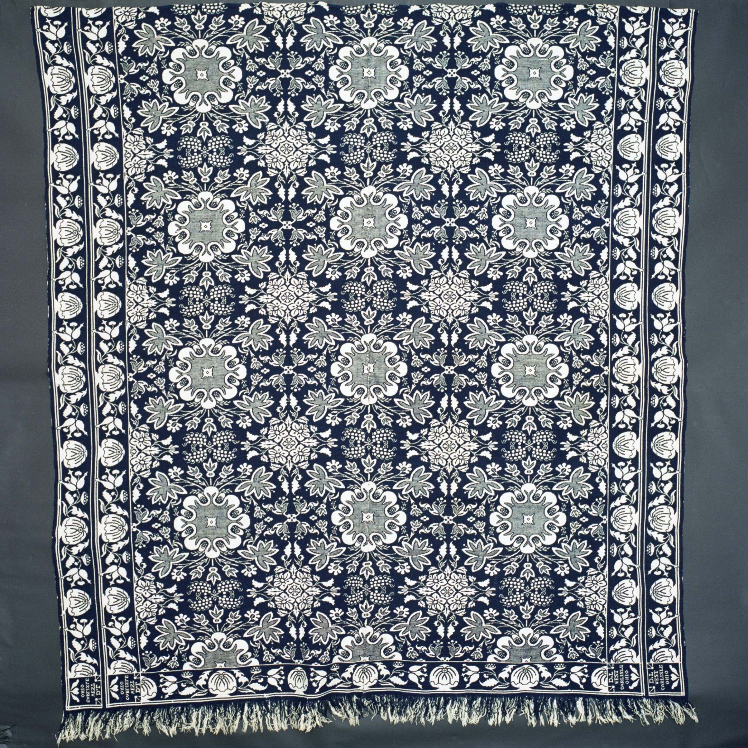 Double weave; navy, white; two loom widths joined; fringe on 2 sides; border on 3 sides; double border on sides of vegetable like shape with vines coming off the sides; centerfield of flower like blobs with many intricate leaves; flowers and squiggles surrounding; two corner blocksCollection