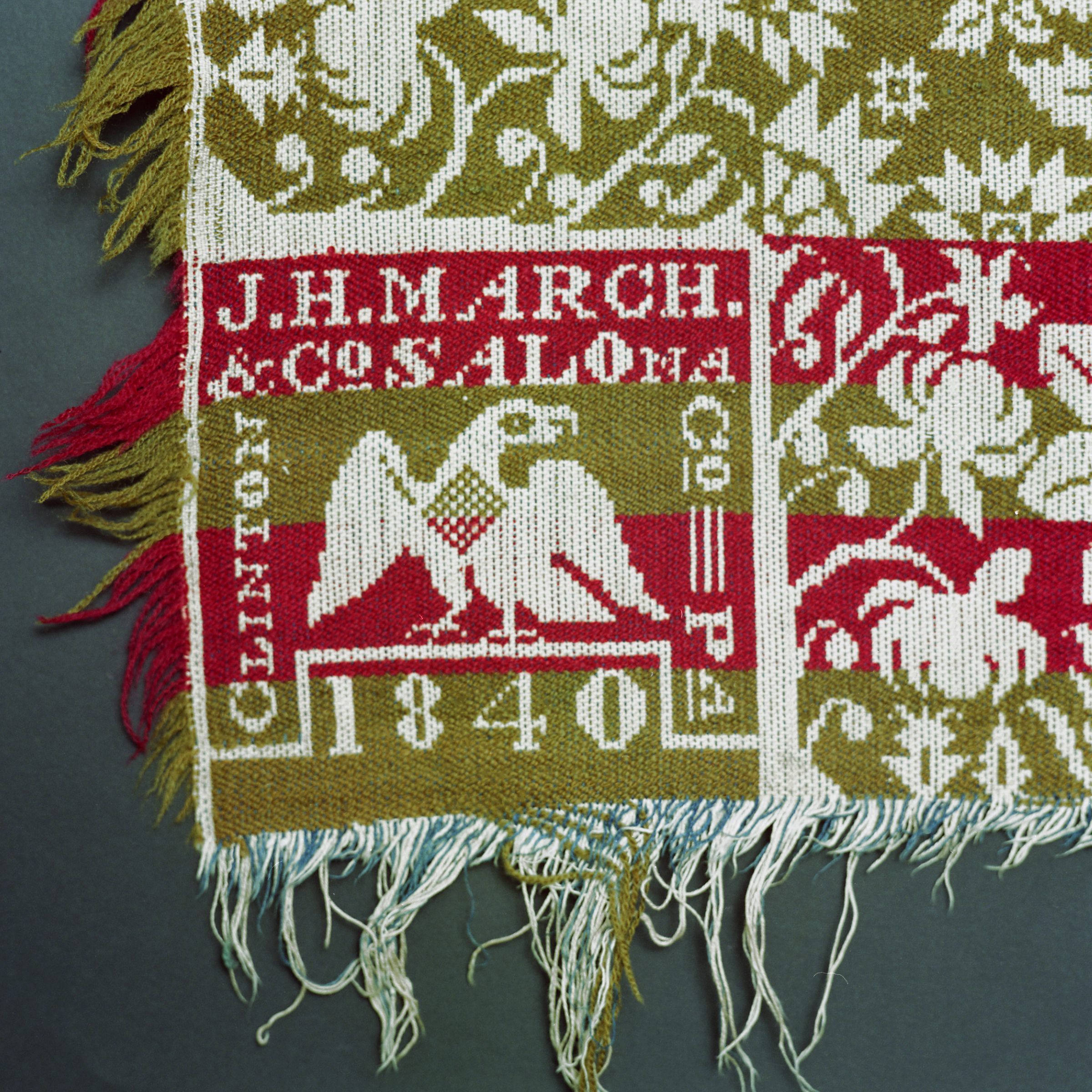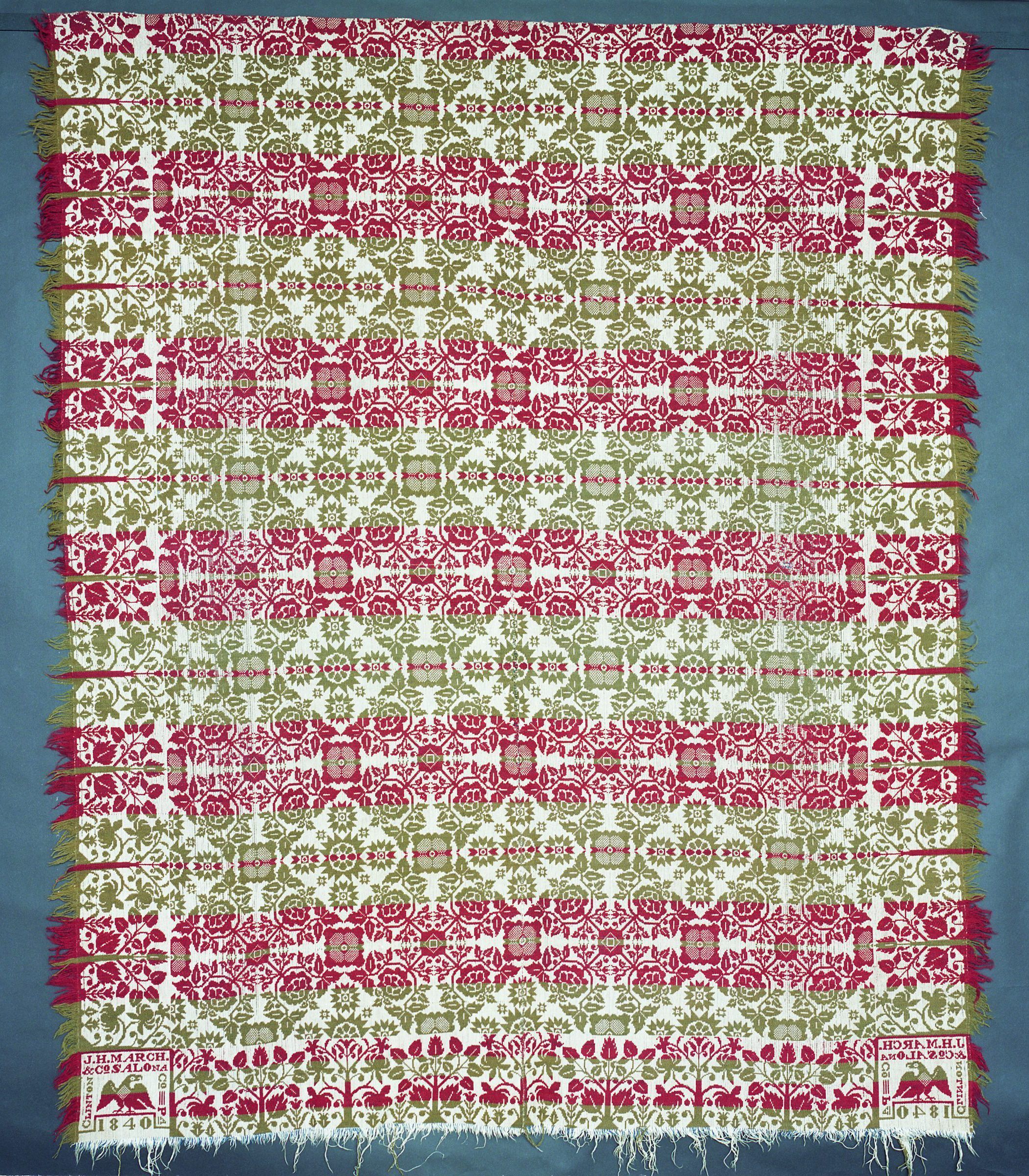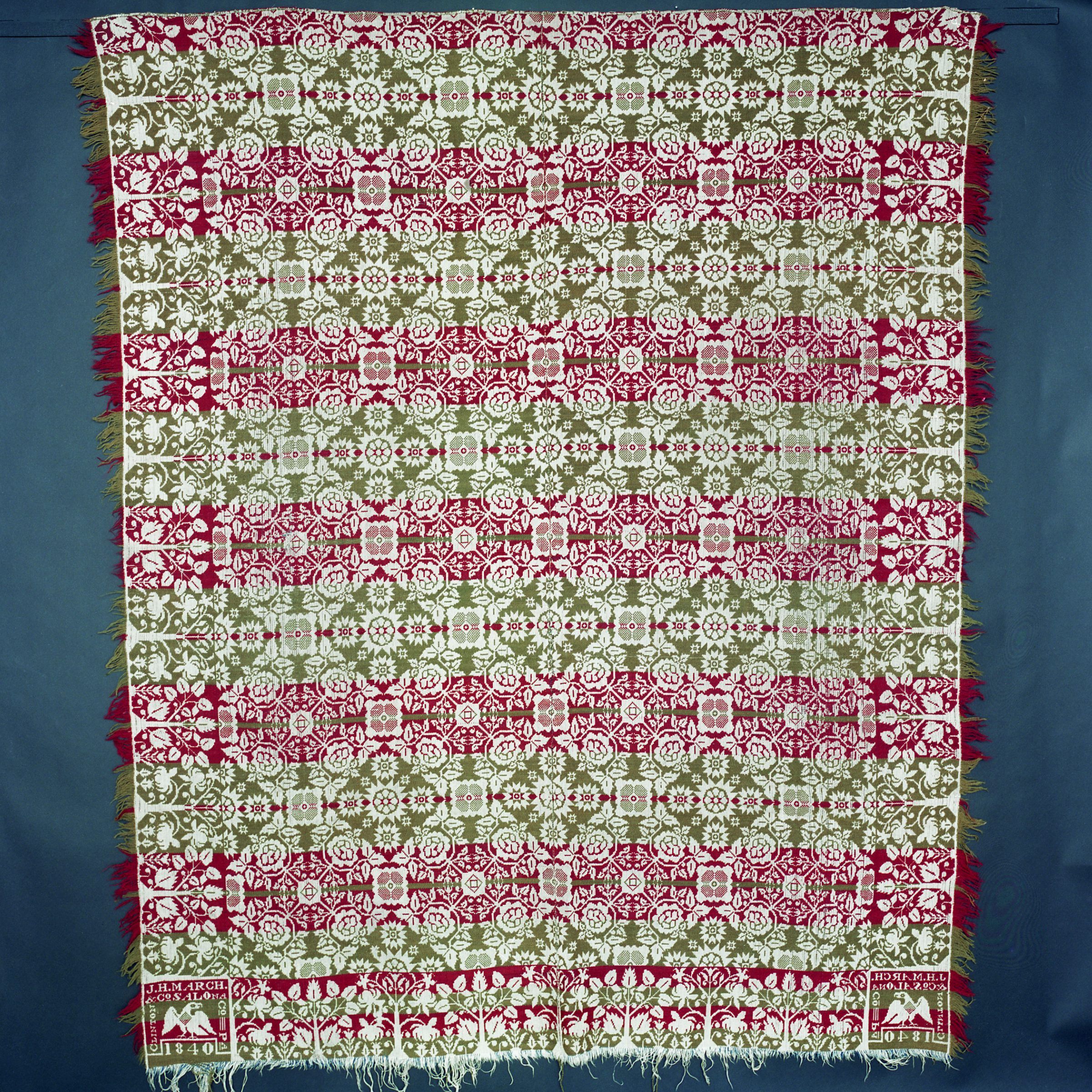 Beiderwand; two loom widths joined; red, green, natural; fringe on 3 sides; border on 3 sides of twiggy trees; centerfield of stars, snowflakes, and flowers; rows of color; 2 cornerblocks with inscription and eagleCollection