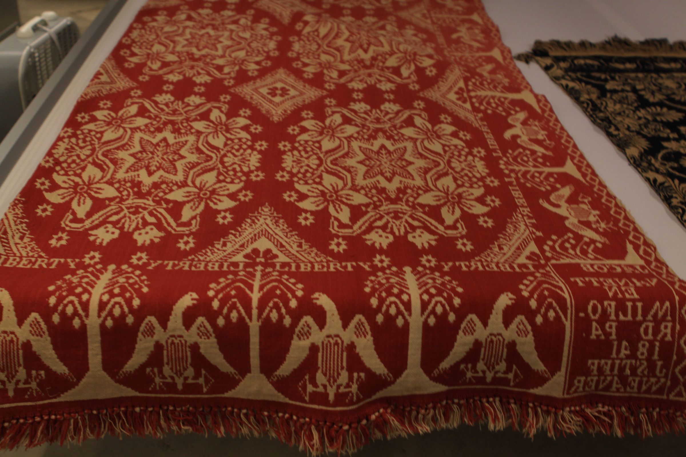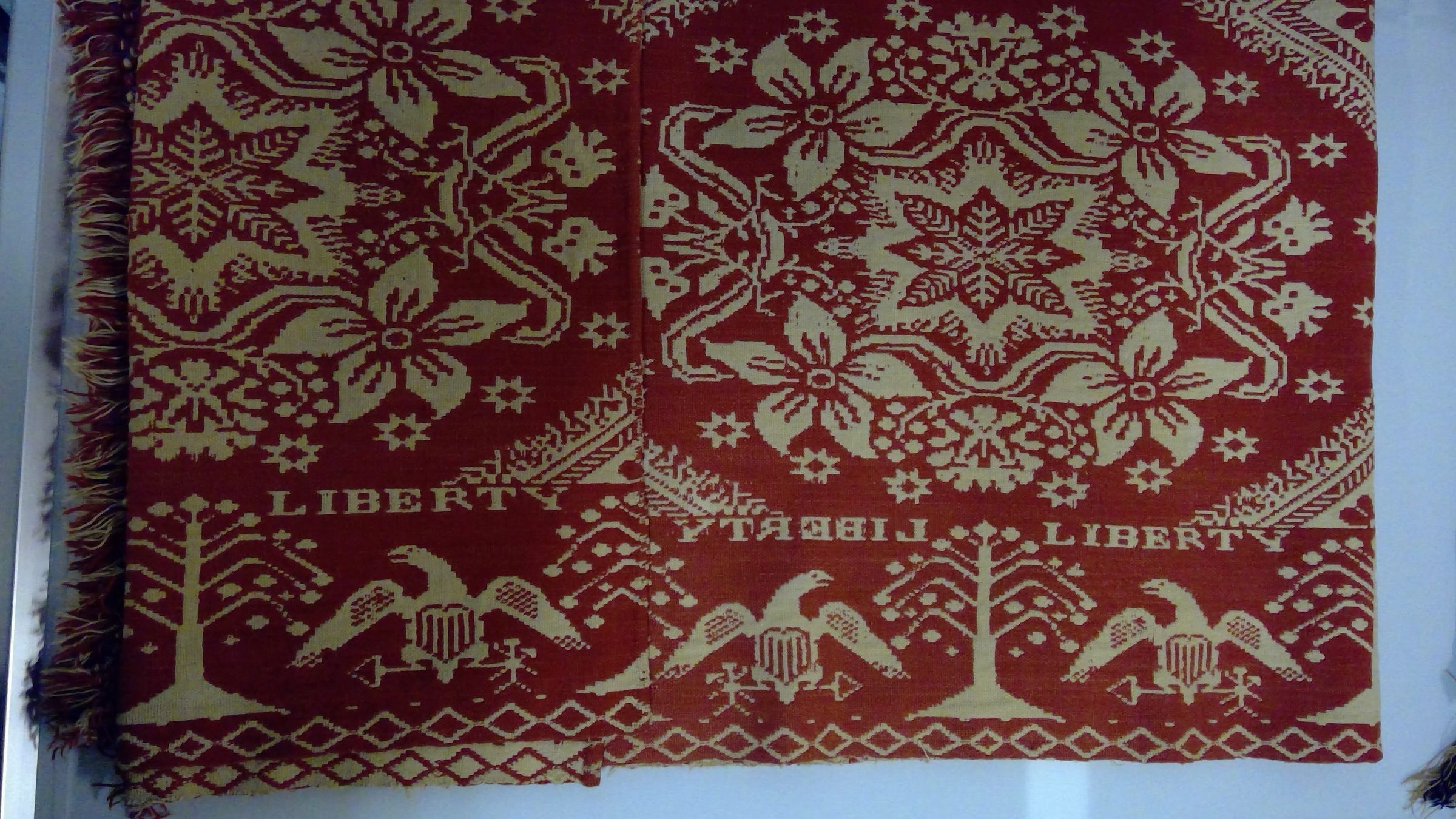 Double weave; red, natural; two loom widths joined; fringe on one side; two corner blocks; border on 3 sides of shielded eagles and trees beneath "liberty" inscription, centerfield of rows of floral and diamond medallions