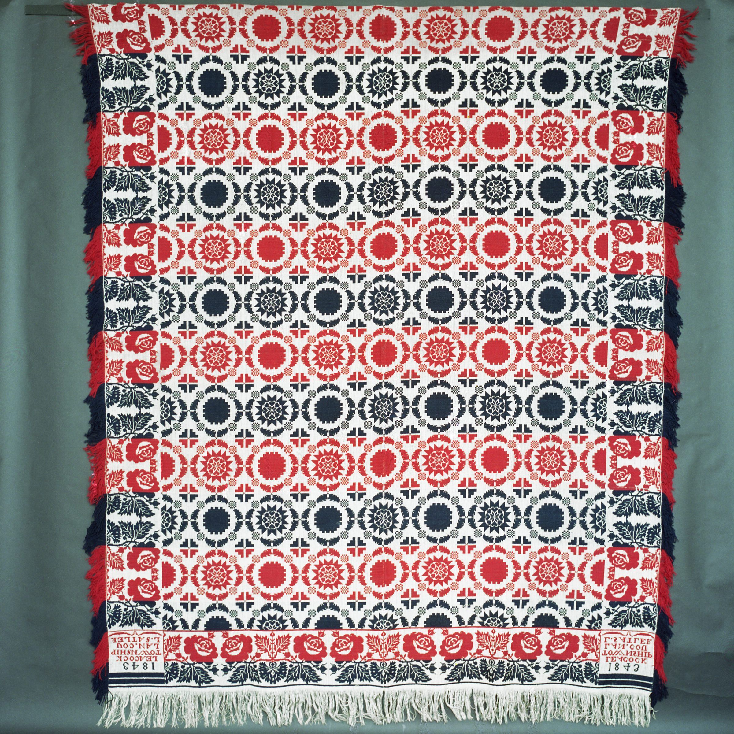 Beiderwand; navy, red, natural; two loom widths joined; border and fringe on 3 sides; border of flowers and leaves; 2 corner blocks; centerfield of rows of circular medallions; strips of colorCollection