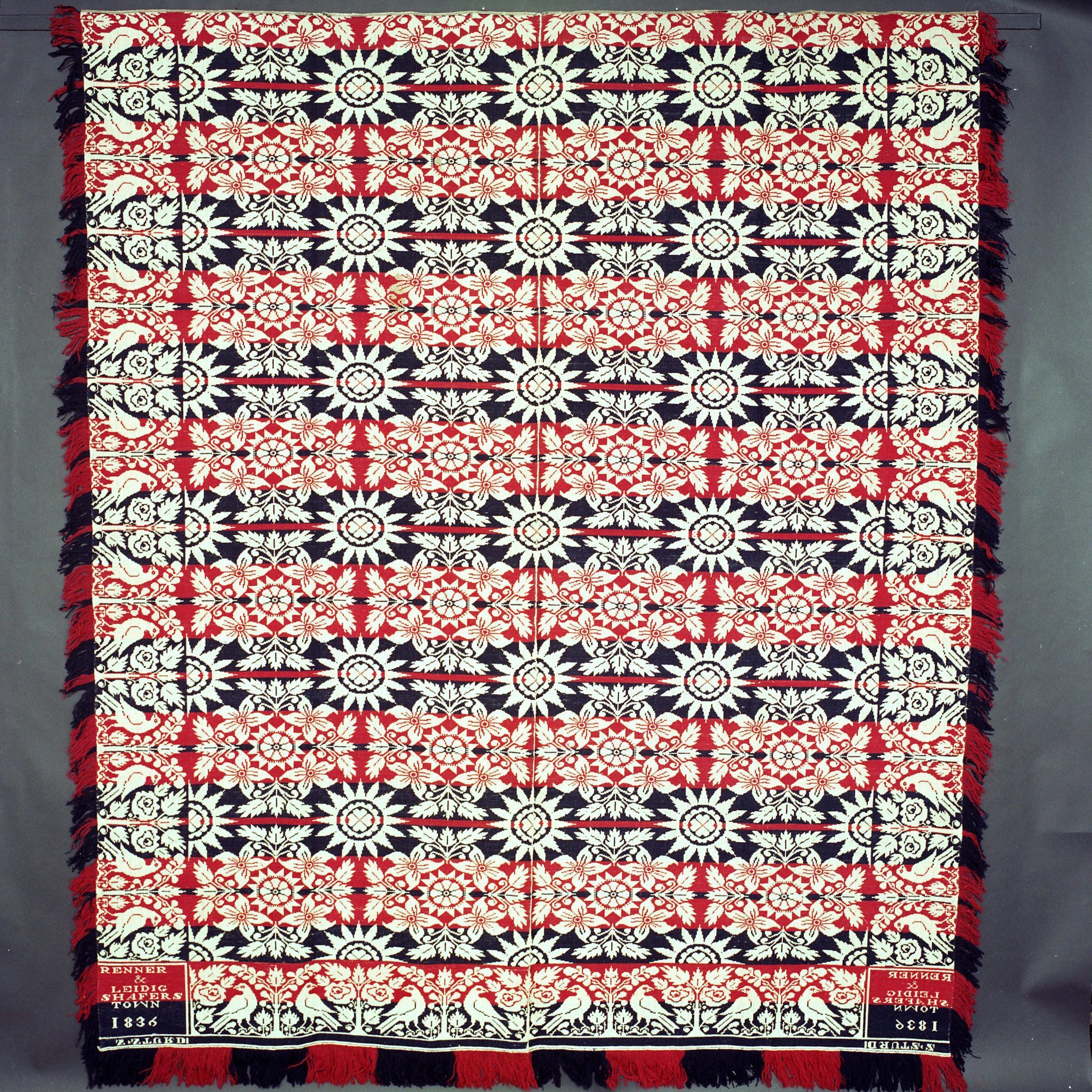 Beiderwand; navy, red, natural; two loom widths joined; fringe and border on 3 sides; border of birds, flowers, and leaves; centerfield of rows of floral and sunburst medallions; strips of color; two corner blocksCollection