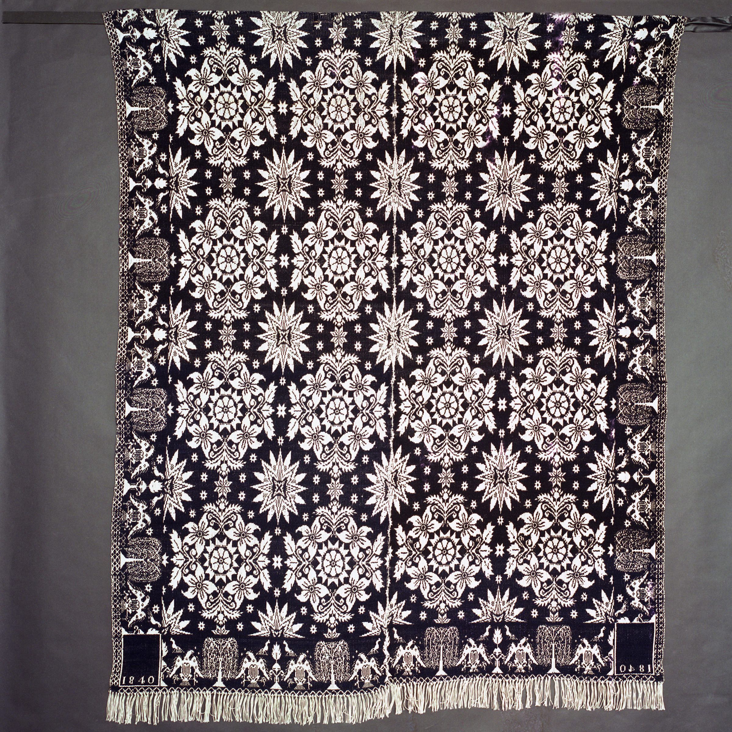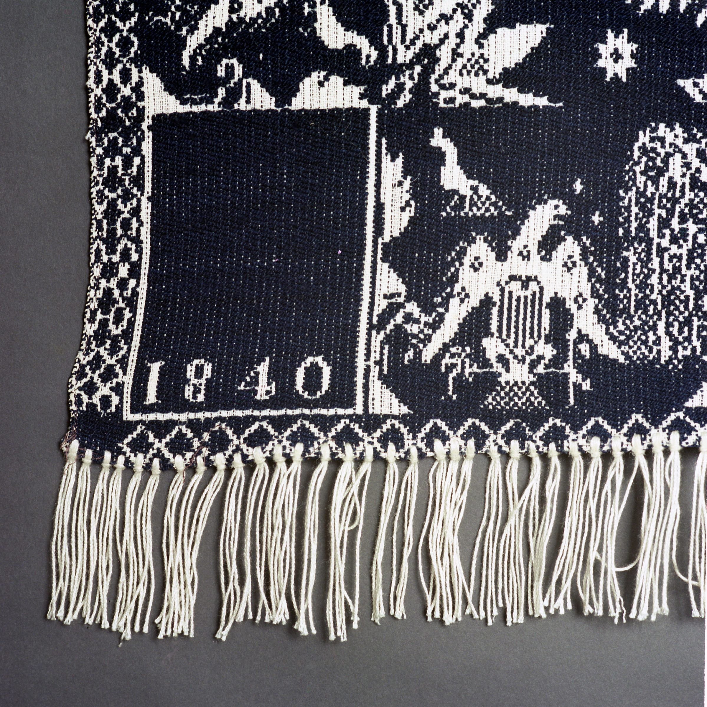 Beiderwand; navy, natural; two loom widths joined; fringe on bottom only; border of shielded eagles and willow trees on 3 sides; centerfield of stars and floral medallions; two corner blocksCollection