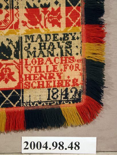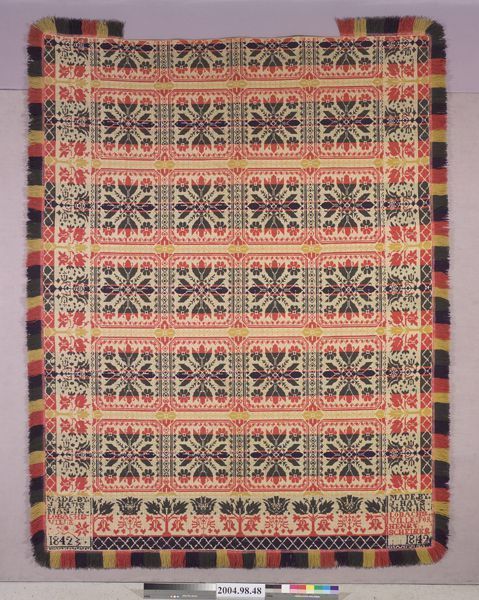 Figured coverlet; undyed cotton and blue, red, green, and gold wool, tied double clogh (Beiderwand). Hemmed top and bottom. Fringe is attached to three sides plus it rounds corner at top and extends a quarter of the way. Central motif consists of square blocks which contain a four flower medallion and has four additional flowers at each corner. Framing the squares is a chain of diamonds, each diamond has a dot at its center. This framing is accentuated by a fleurette where the chain of diamonds intersect. Horizontal bands of color run through coverlet. Border on sides and bottom have an alternating tree and floral motif. Secondary border on sides and bottom consists of interlocking diamonds.Collection