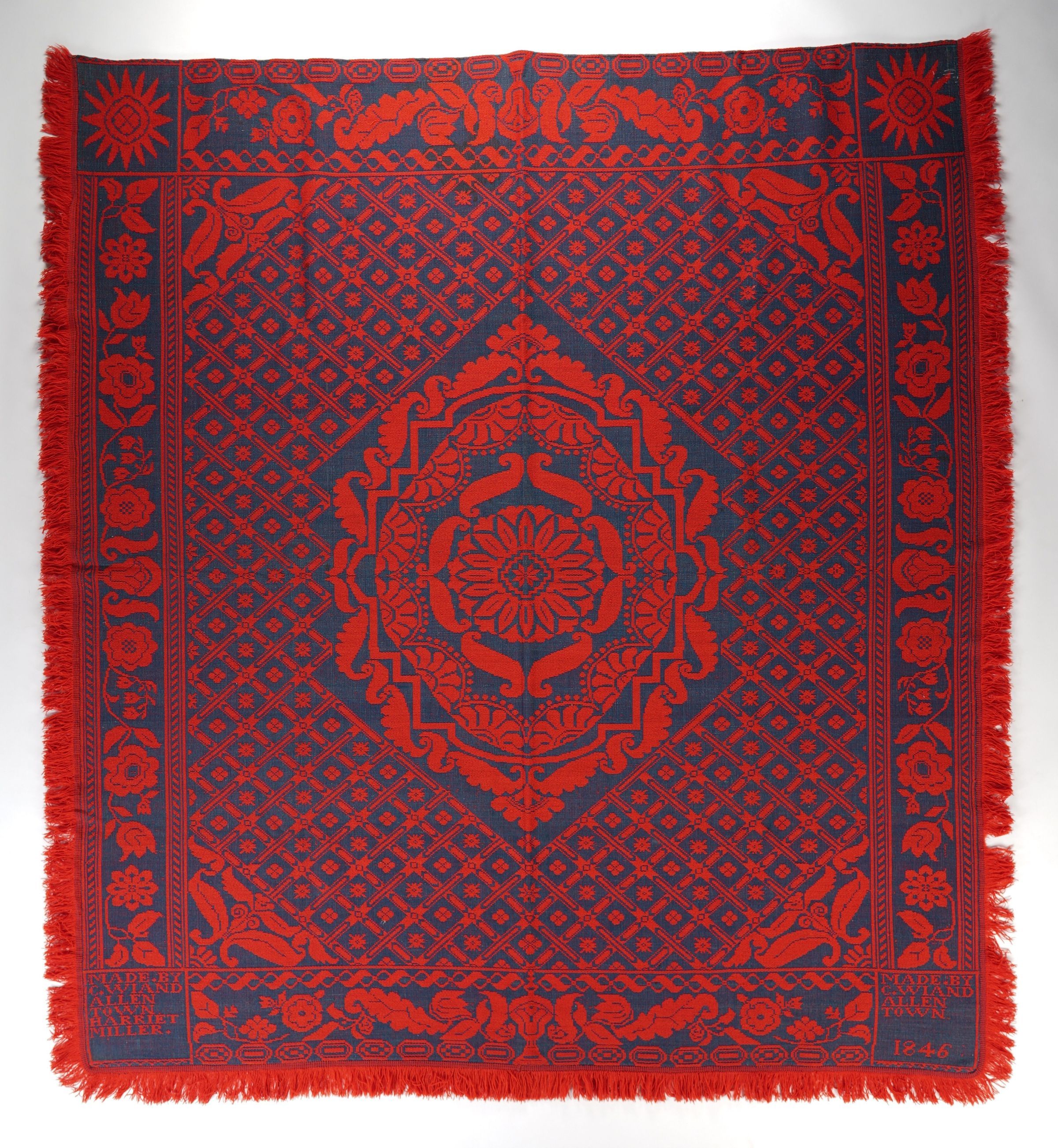 Figured and fancy coverlet tied double cloth (Beiderwand). Hemmed top, sides and bottom fringed. Central motif is a center diamond shaped medallion with a floral motif and a tiled centerfeld. Two panels joined by a center seam. Blue cotton with Red wool. Floral borders on four sides. Woven by Charles Wiand for Harriet Miller in 1846.Collection