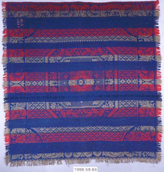 Figured coverlet; blue cotton and red, and olive wool, double cloth. Hemmed top and bottom, self-fringe on sides and applied fringe on bottom hem. Central motif is an octagonal center medallion. In the center of the medallion is a large floral motif surrounded smaller floral motifs. This is framed by a chain of leaves. The ground both inside and outside of the octagonal frame is a diamond pattern. Borders are on all sides and contain scrolling plumes. At each corner of the border, a vase of flowers and plumes punctures the field, creating curved corners. The border is trimmed on the inside with a rope-like edging.Collection