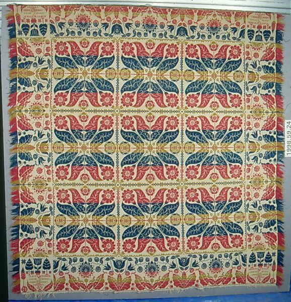 Figured coverlet; undyed and blue cotton and blue, red, and olive wool, tied double cloth (Beiderwand). Top hemmed sides and bottom fringed. Central motif consists of nine squares running three across and three down. Each square has four leafy flowers emanating from a small central star. Rosettes on straight stems fill the spaces between the leaves. Dividing the squares is a narrow diamond shapes geometric border. The border alternates a tulip style flower with a circular flower. These flowers rise from oak-like leaves with stylized acorns running along the inner edge of the leaf. The leaves with the circular flower have birds standing on the inner edge.Collection