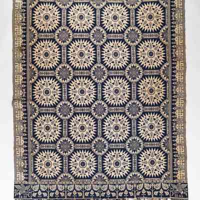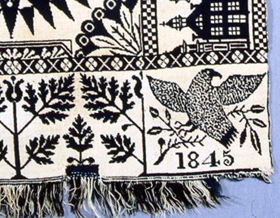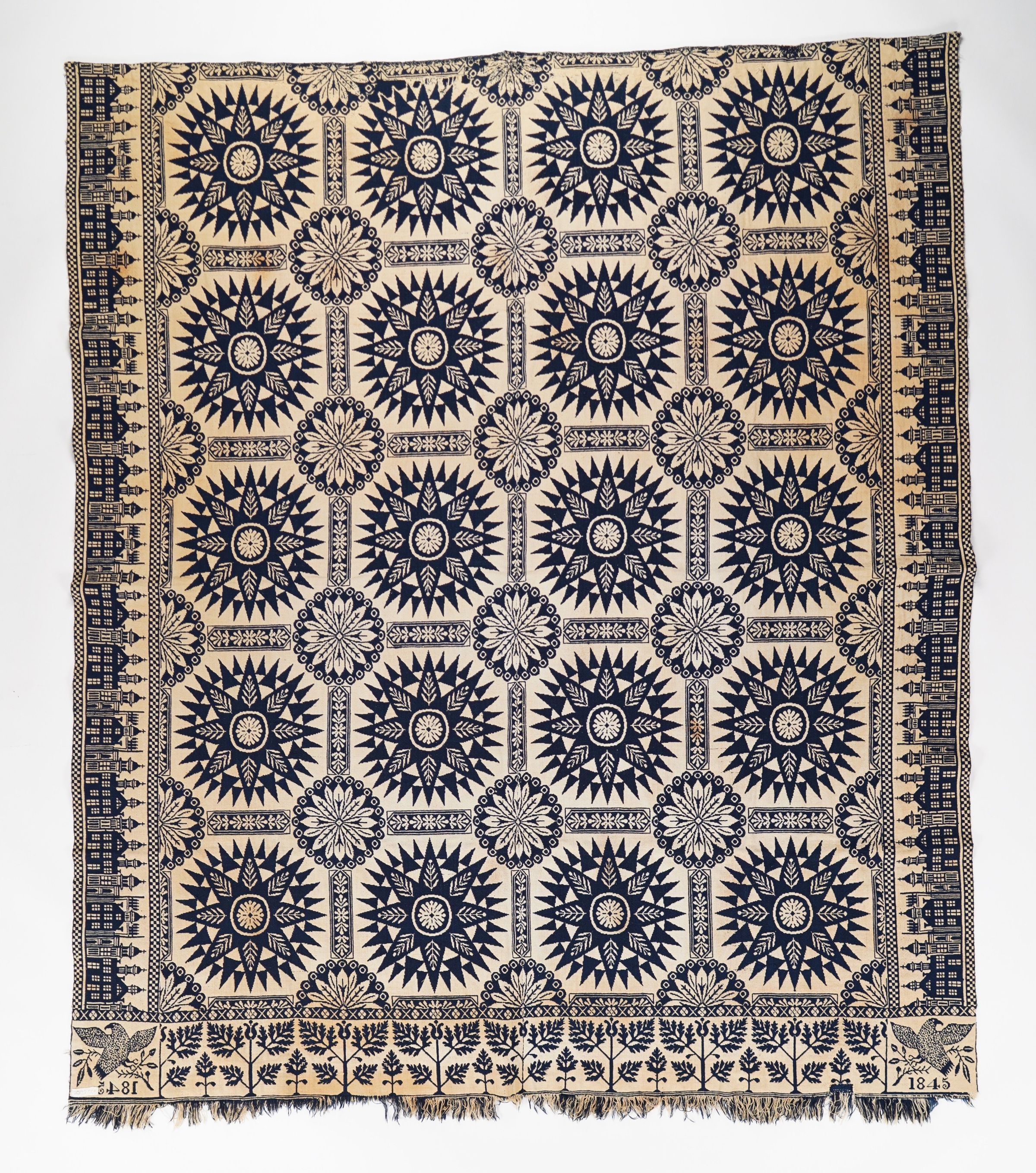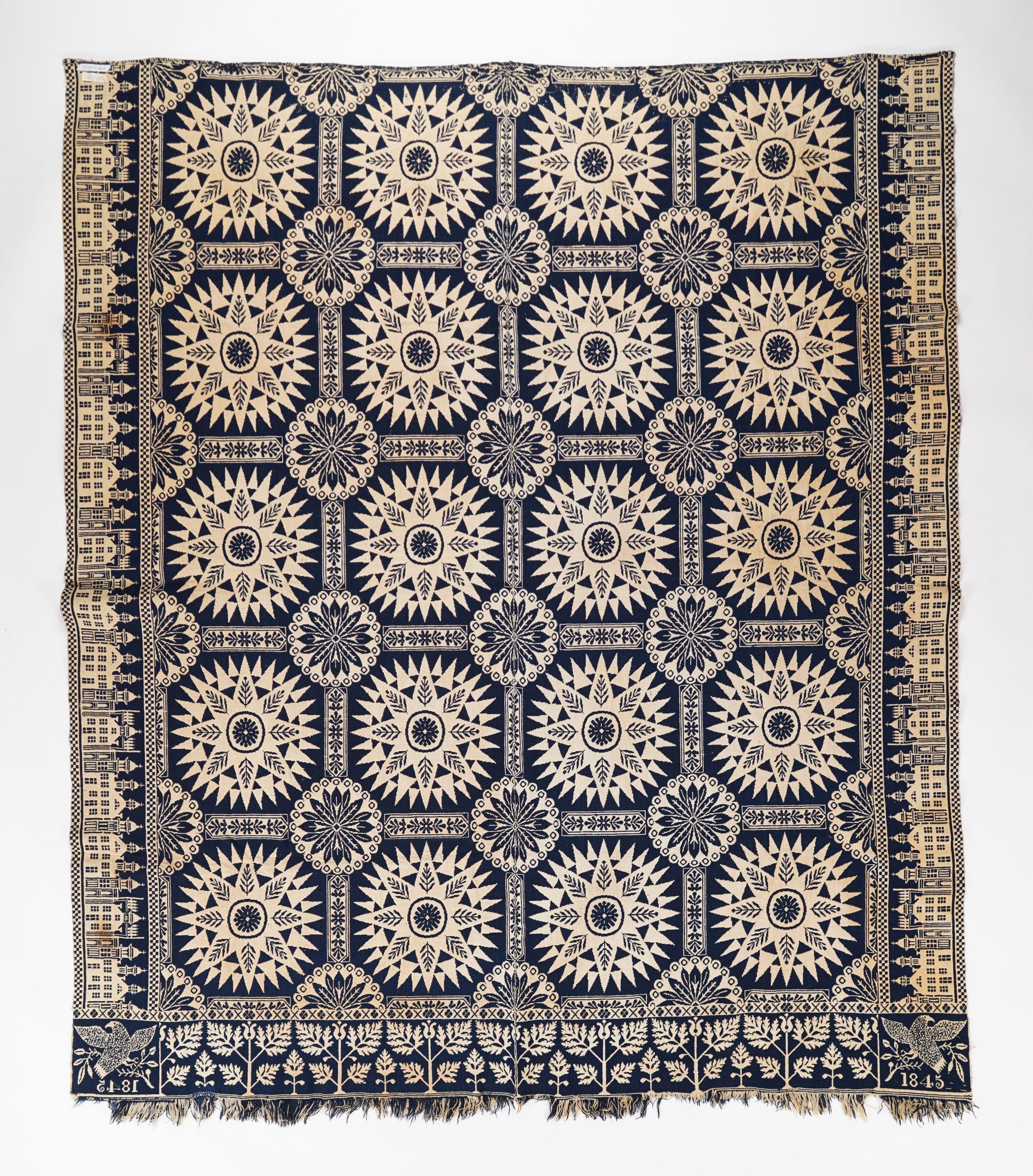 Figured coverlet; undyed cotton and blue wool, double cloth. Center seam joins two panels. Selvedges on either side. Hemmed top, fringed bottom. Central motif consists of blocks with large starbursts inside. Each starburst is decorated with a floral motif. Blocks are separated by narrow bands containing stylized floral motifs. At each intersection there is a scalloped circular motif with a flower at its center. The bottom border contains stylized trees, wheras the side borders consist of a line of buildings. Corner blocks contain the eagle logo of Samuel Graham.Collection