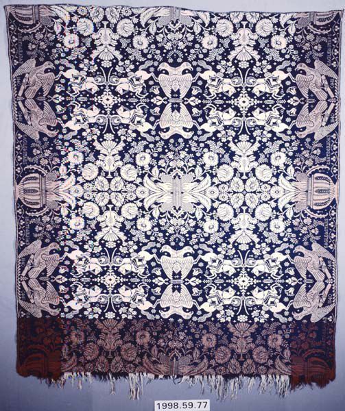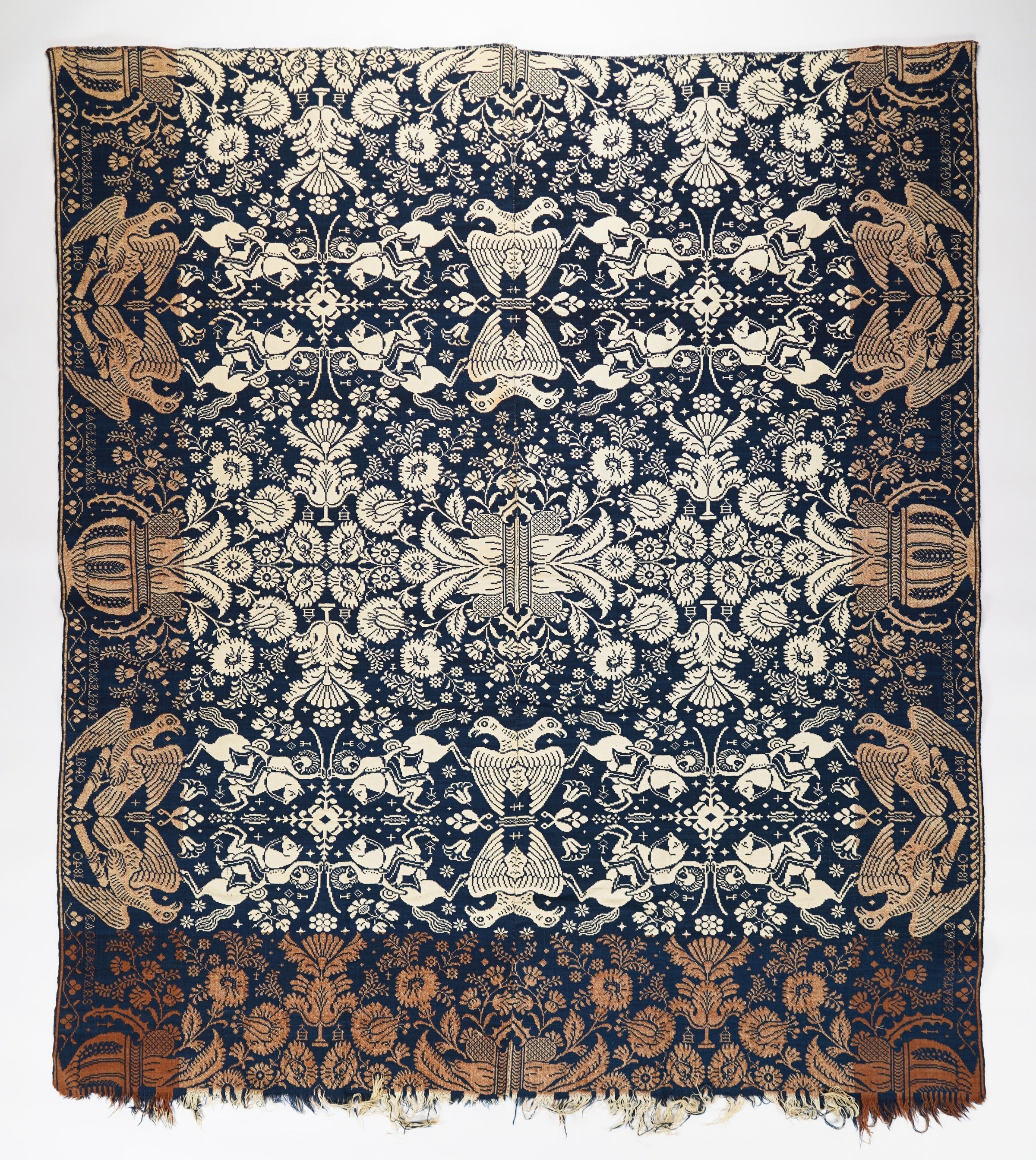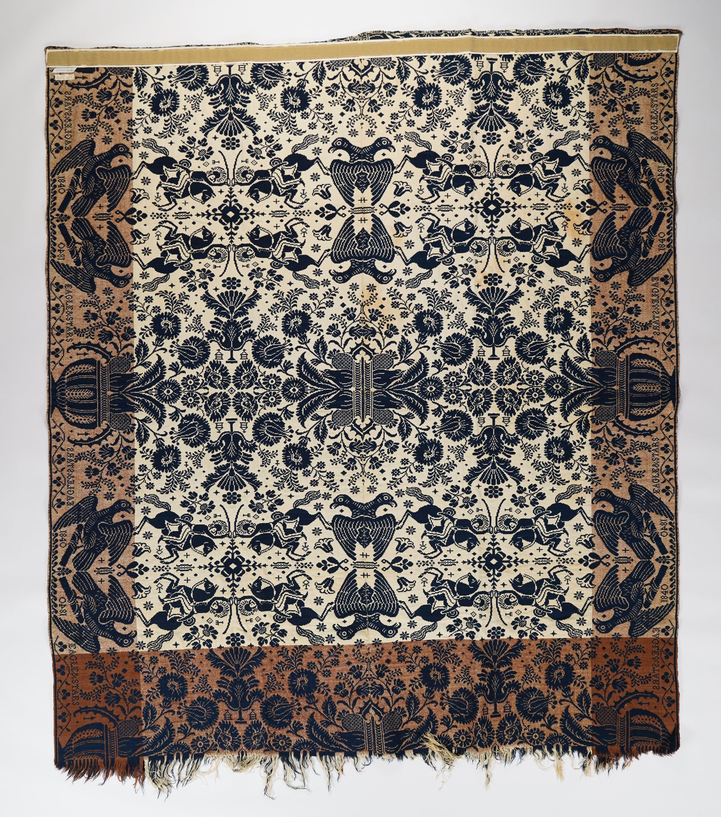 Figured coverlet; undyed cotton and blue and brown wool, double cloth. Center seam joins two panels. Selvedges on either side. Hemmed top, fringed bottom. Central motif is a densely clustered design with flower-filled urns, double headed eagles, and soldiers with drawn swords on rearing horses. The borders are defined by the brown wool while the center field is blue and natural. The design; however, is a continuation of the center field and therefore not technically a border.Collection