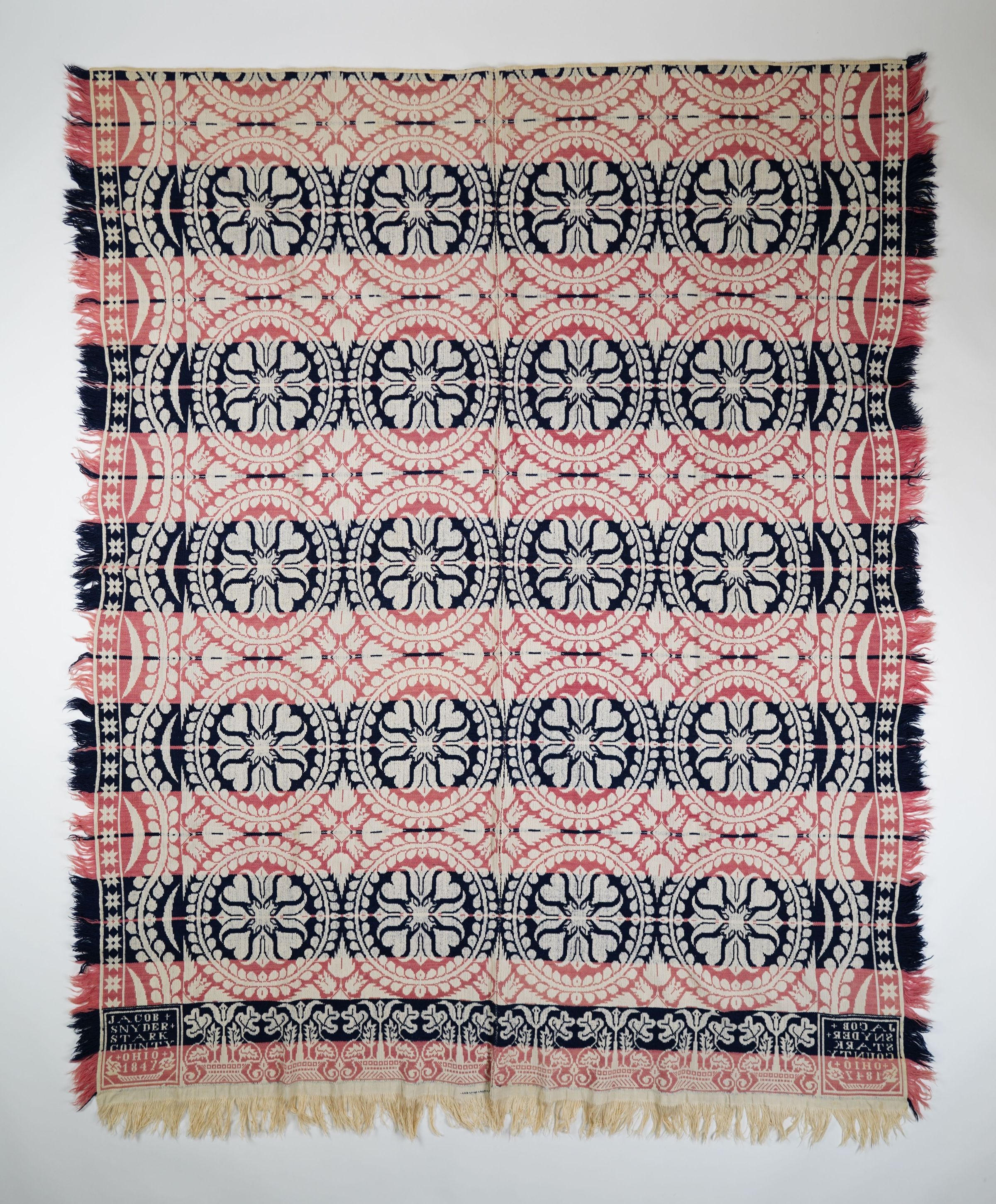 Navy and pink figured tied Beiderwand coverlet; two panels joined by a center seam; self-fringe on three sides; floral border on bottom; vine and crescent border on sides with star edge; centerfield pattern has wreaths with tulip and heart medallions.Collection
