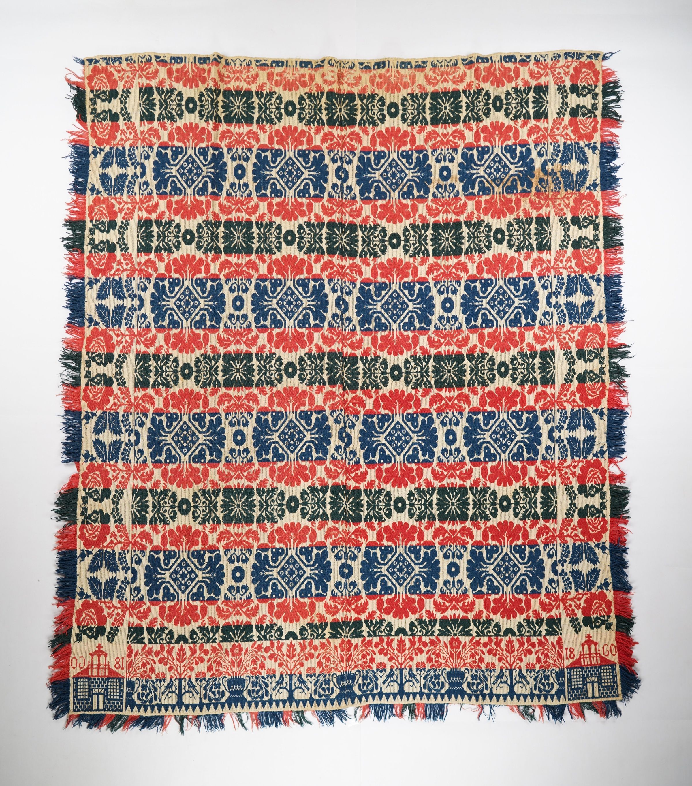 Figured and fancy tied beiderwand coverlet with borders on three sides, self-fringe on sides, and applied fringe on bottom. Two panels joined by a center seam. Navy, dark green, and red wool with undyed cotton. Floral medallion centerfield pattern; rose border on sides; flower urn border on bottom. Unknown weaver in 1860 with courthouse cornerblock.Context