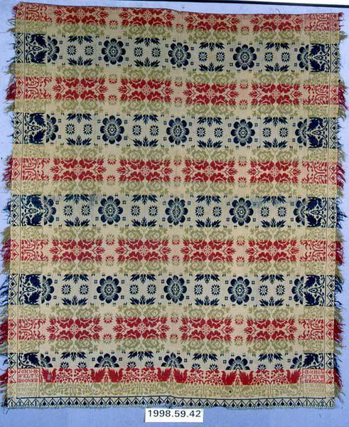 Figured coverlet; undyed cotton and red, blue, light blue, and olive wool, tied double cloth (Beiderwand). Center seam joins two panels. Hemmed on top, sides and bottom fringed. The central motif consists of medallions of four roses alternating with an eight-pedaled floral motif. The coverlet is woven with varying horizontal bands of color. Border is along three sides and has a meandering grapevine motif. Secondary borders contain diamonds with a "bulb" shape hanging from the upper corner of the diamond.Collection