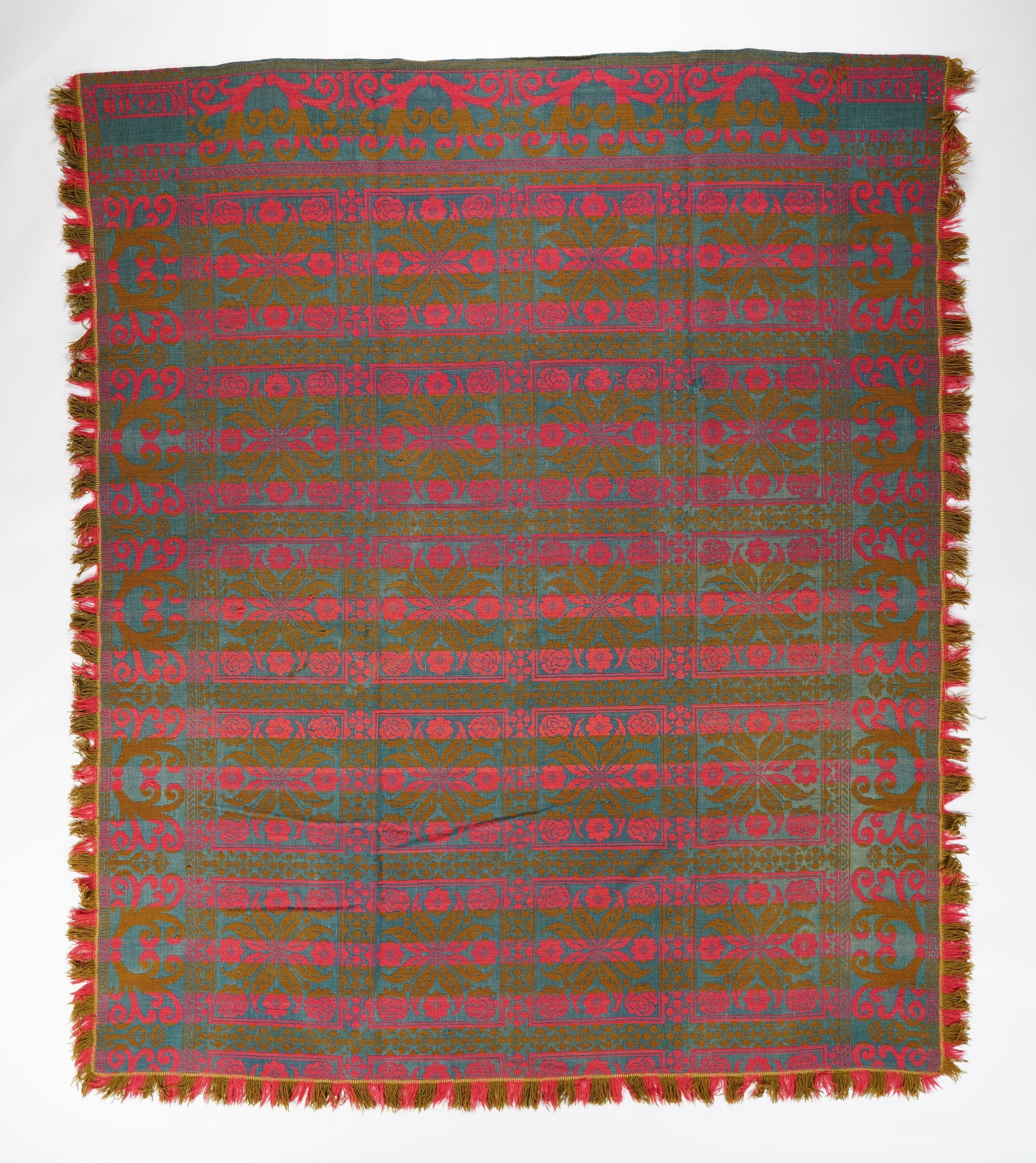 Figured coverlet; blue cotton and olive and pink wool, tied double cloth (Beiderwand). Hemmed top, fringed sides and bottom. Central motif consist of square medallions that contain a four flower cross and four roses in each corner. The squares are framed with floral motifs. The overall design of the coverlet contains horizontal bands of pink and olive. The border is on the top and sides of the coverlet and has a spiraling vine motif.Collection