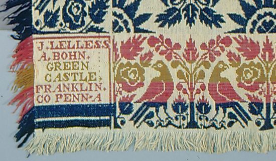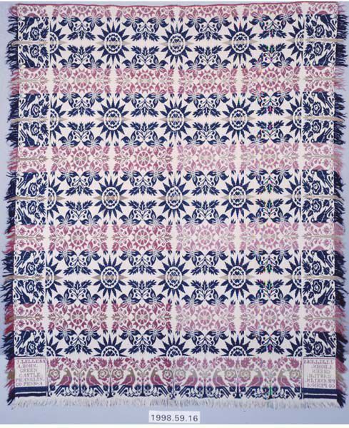Figured coverlet; undyed and blue cotton and blue, rose, and ochre wool, tied double cloth (Beiderwand). Center seam joins two panels. Top edge is bound with a rose colored tape, fringed sides and bottom. Central motif consists of a row of star bursts alternating with a row of lily medallions. Each lily medallion has four lilies arranged in a circle around a small starburst. The borders along the sides and bottom show two birds facing each other with roses and foliage in between them.Collection