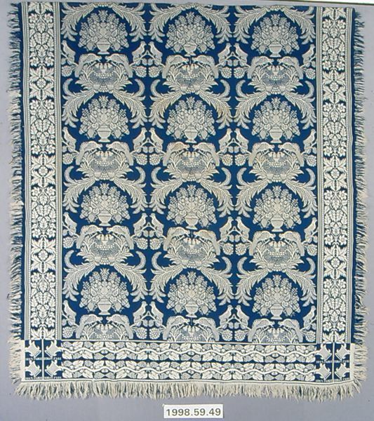 Figured coverlet; undyed cotton and blue wool, double cloth. Center seam joins two panels. Hemmed top; fringed sides and bottom. Central motif consists of images of two birds feeding their young in an elaborate nest surrounded by stylized foliage. This design alternates with an urn of fruit and flowers. Dividing the rows of the above designs are two birds facing each other standing on branches. The border on the lower edge shows two rows of a grapevine design growing from one of the pots in the corner block. The side borders have a stylized floral and foliage design enclosed within three stripes.Collection