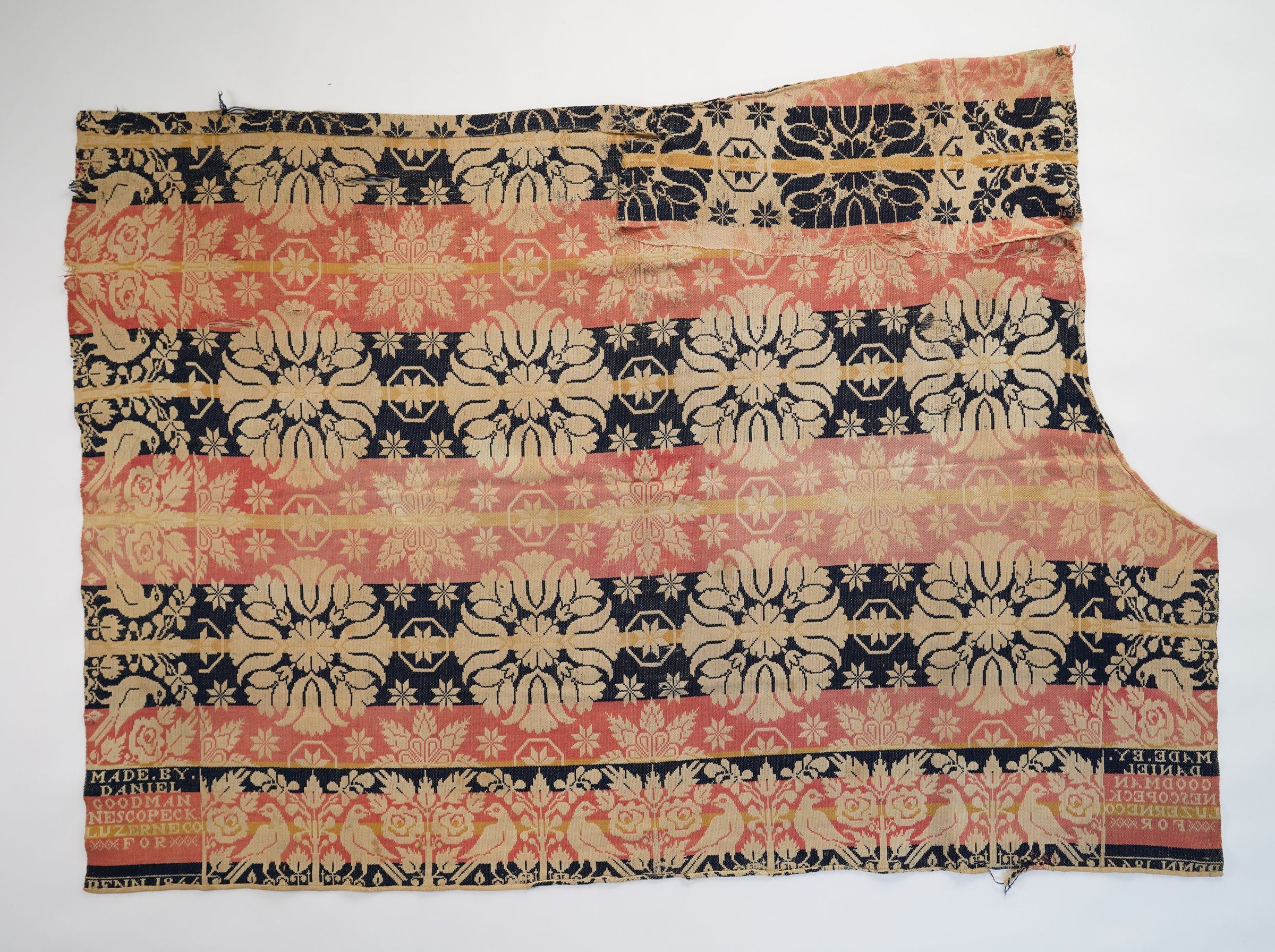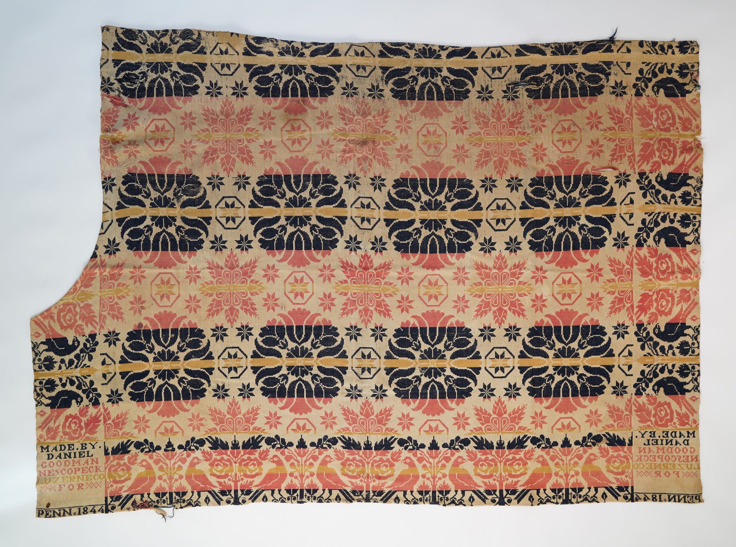 Navy, pink, and yellow figured Tied Beiderwand coverlet fragment; seamless; worn and mended; no fringe; distelfink border on three sides; tulip medallion and acorn centerfield pattern with stars;