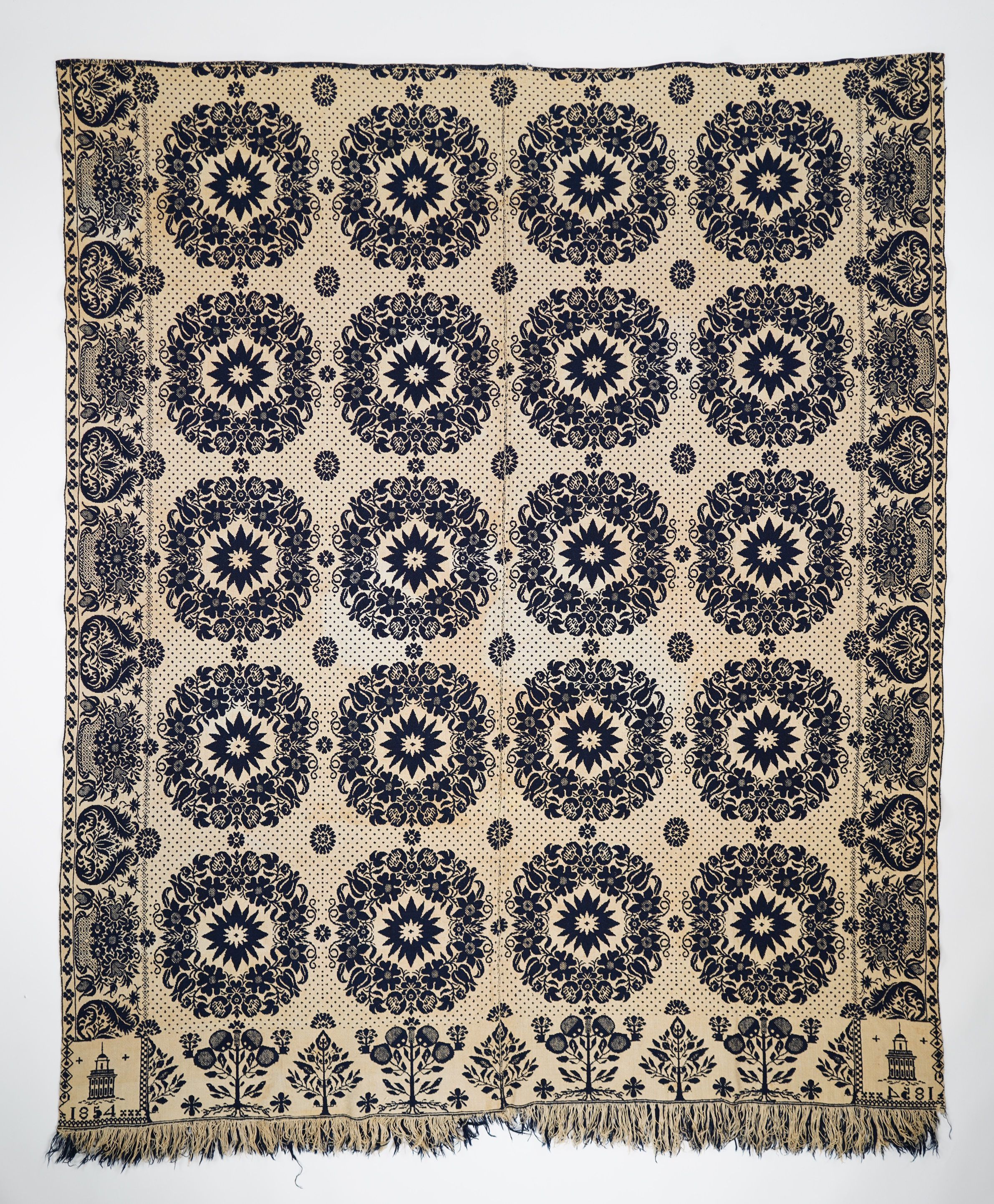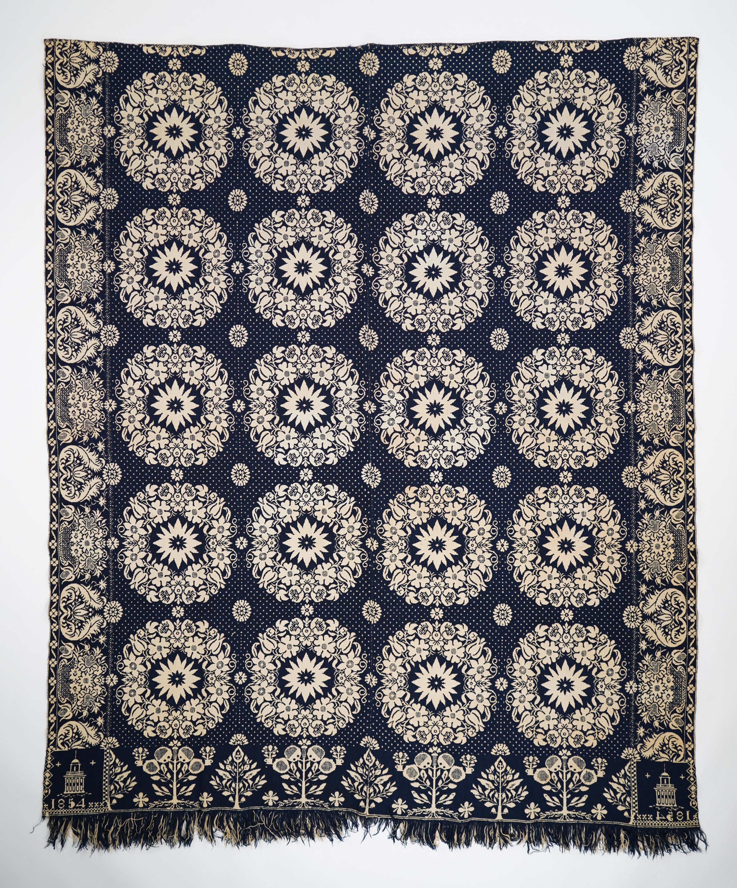 Navy and natural figured double weave coverlet; two panels joined by center seam; floral side borders and tree bottom border; self-fringe on bottom; floral medallion centerfield pattern.Collection
