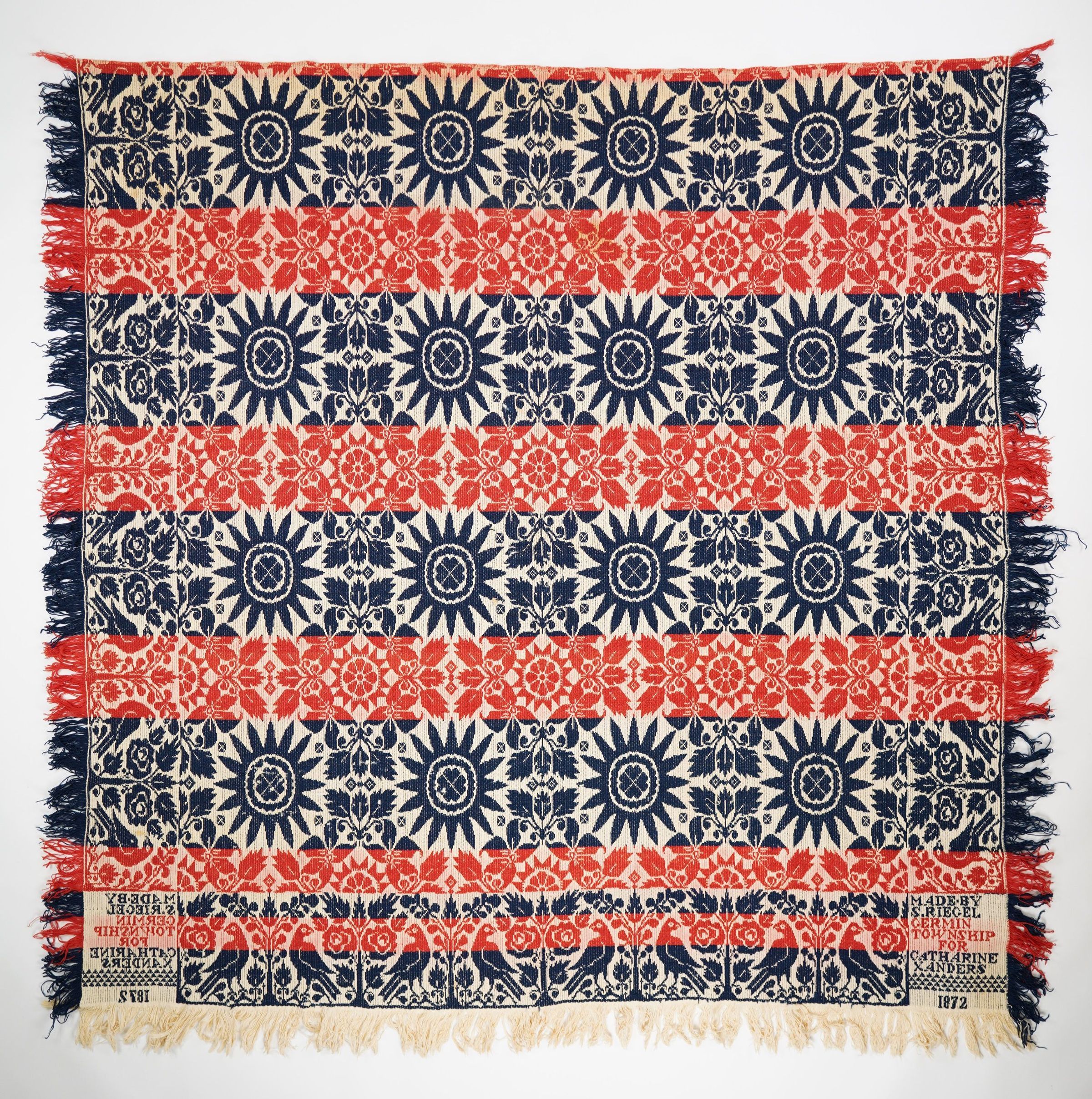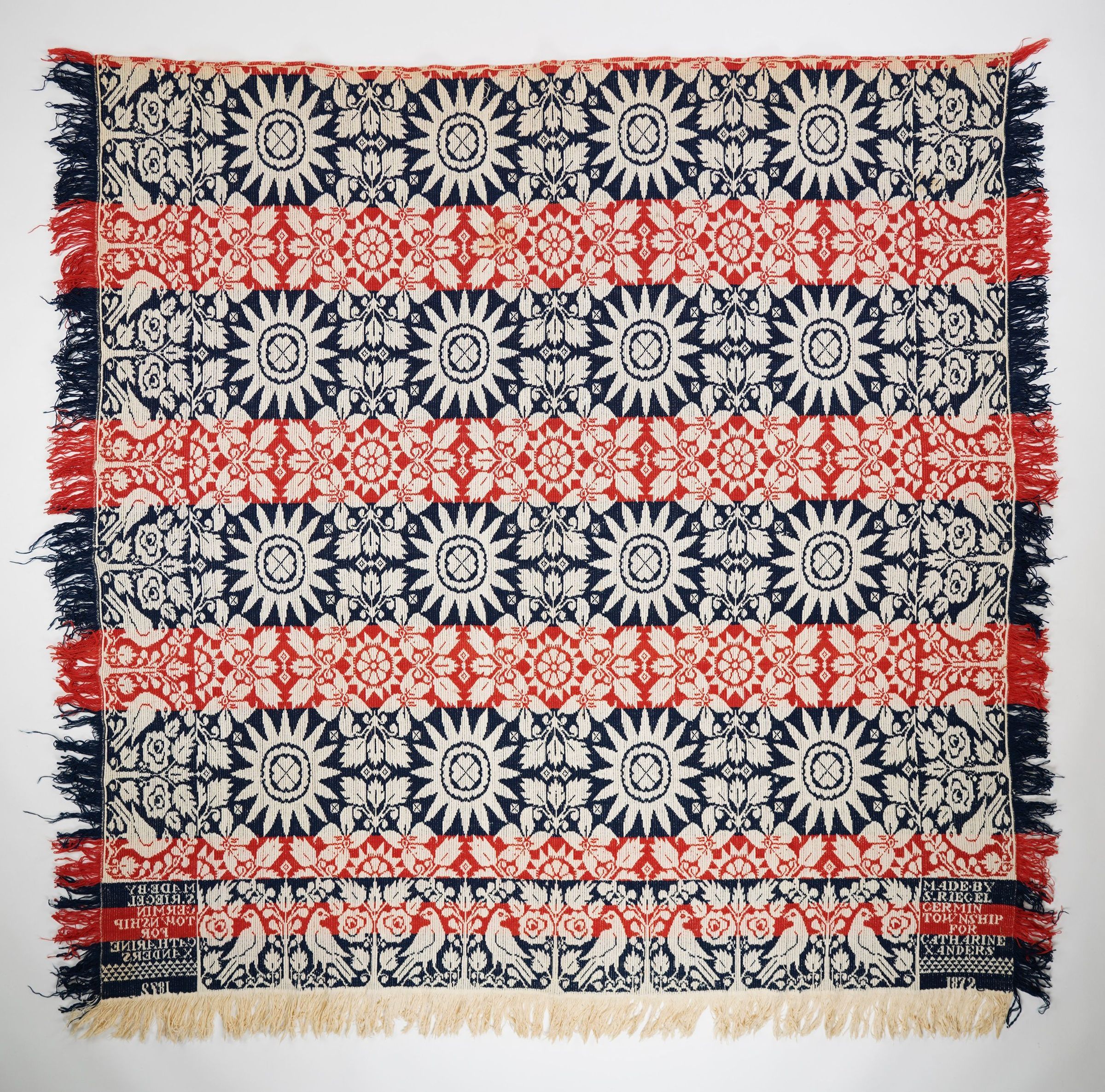 Red, navy, and natural figured Beiderwand coverlet; seamless; self-fringe on three sides; distelfink border on three sides; Lilies of France & sunburst centerfield pattern.Collection