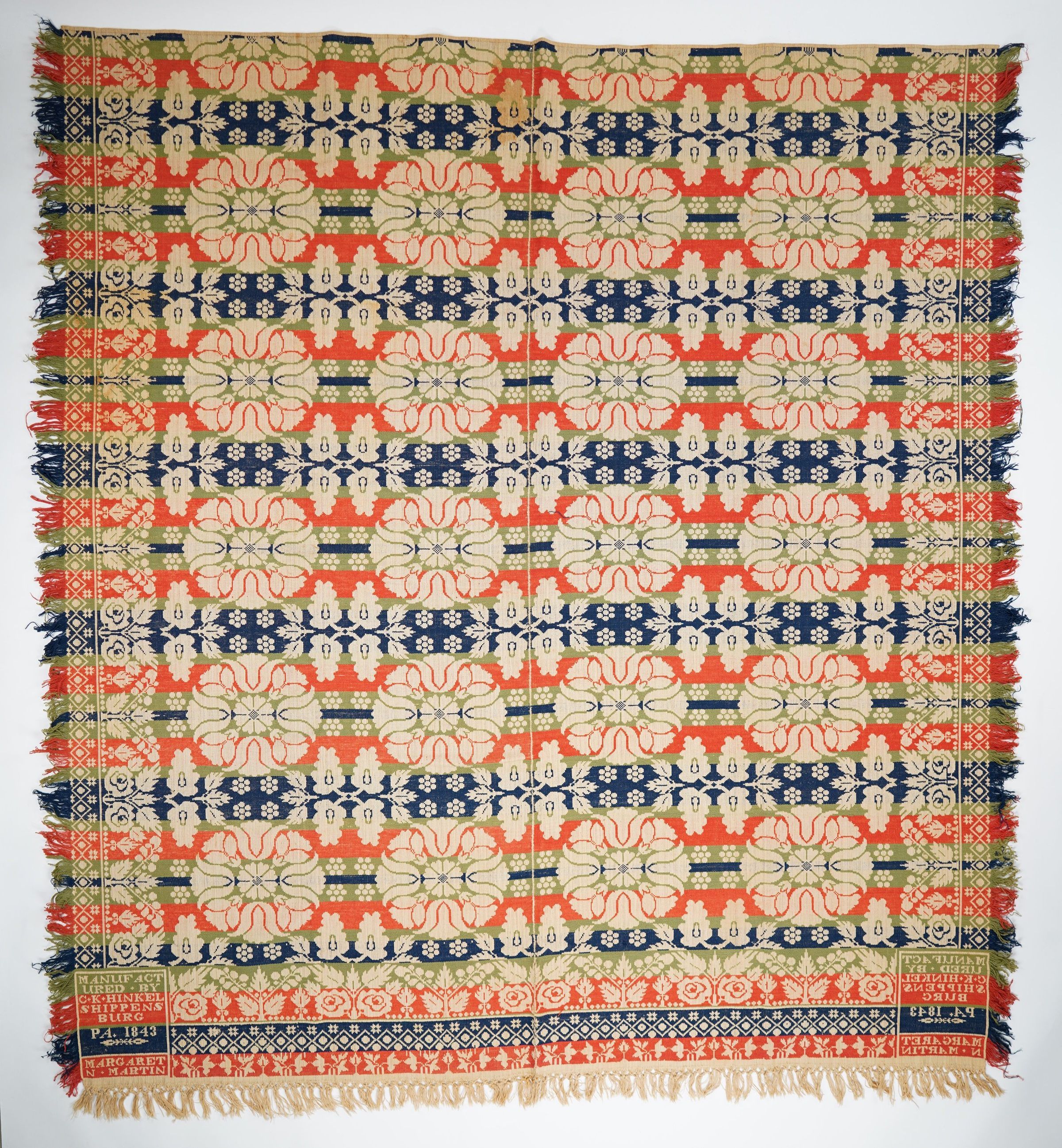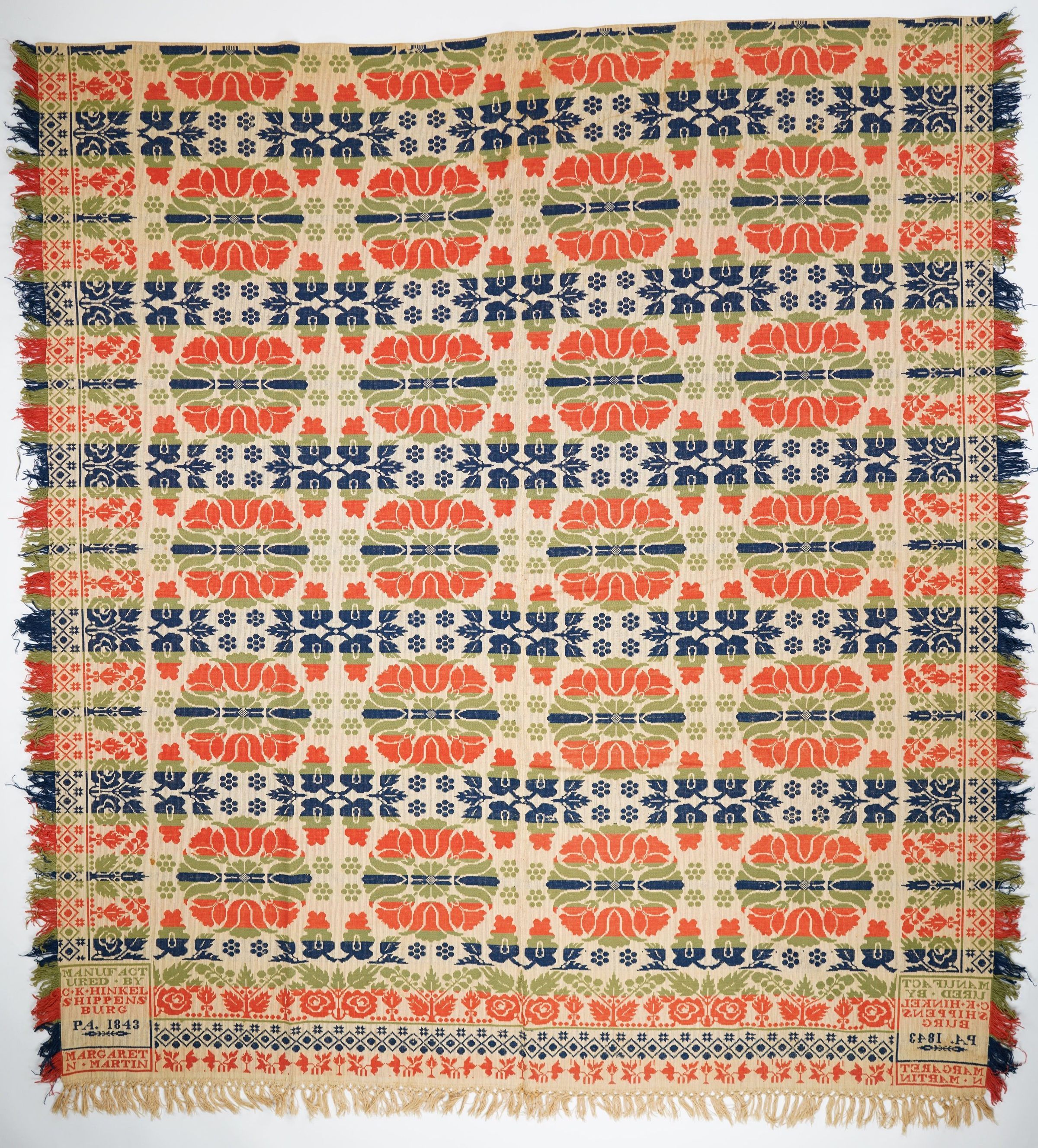 Red, navy, green figured tied Beiderwand coverlet; two panels joined by a center seam; self-fringe on three sides, double-knotted on bottom edge; double rose border edged with dotted diamonds on three sides; tulip medallion centerfield.Collection
