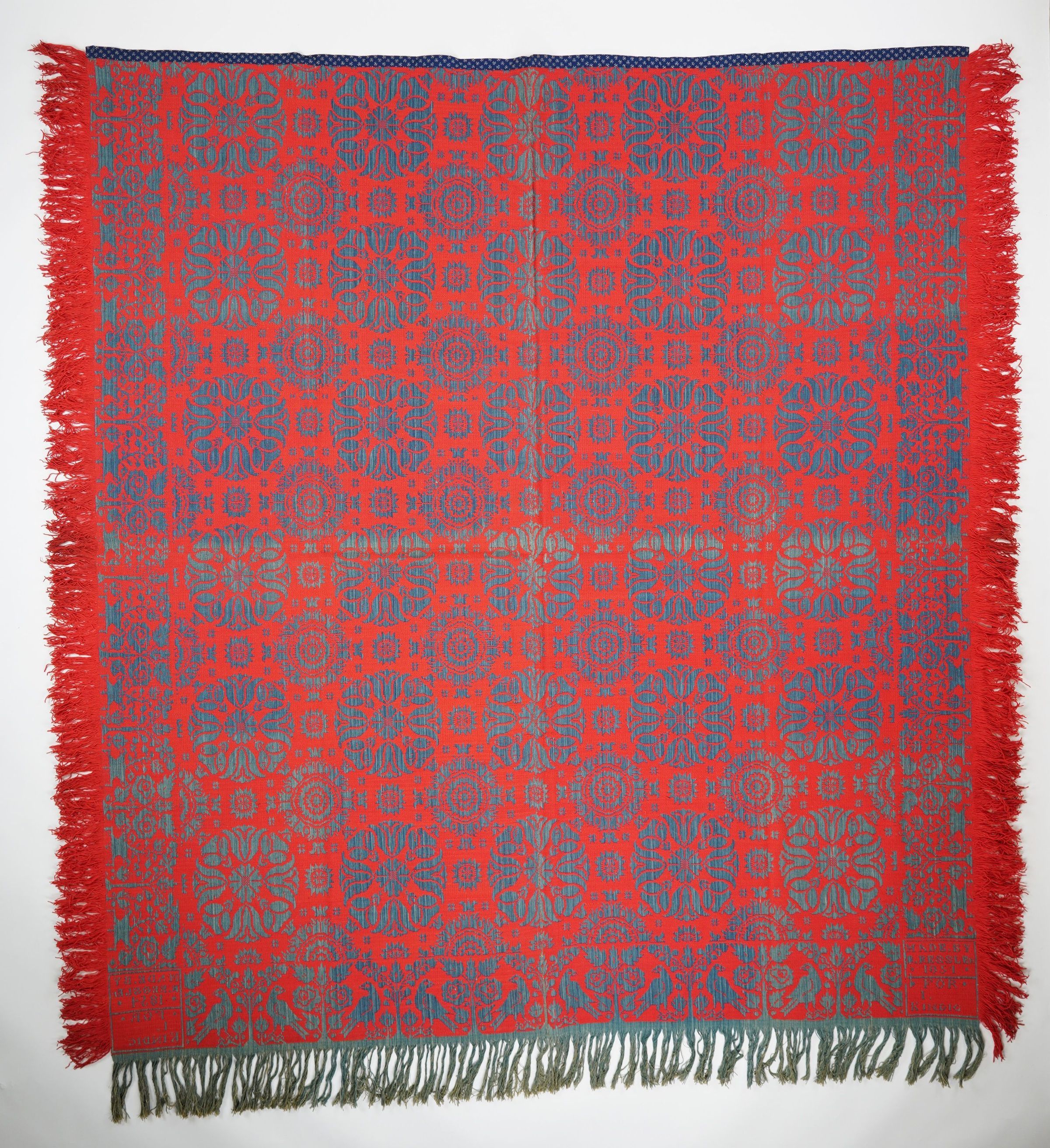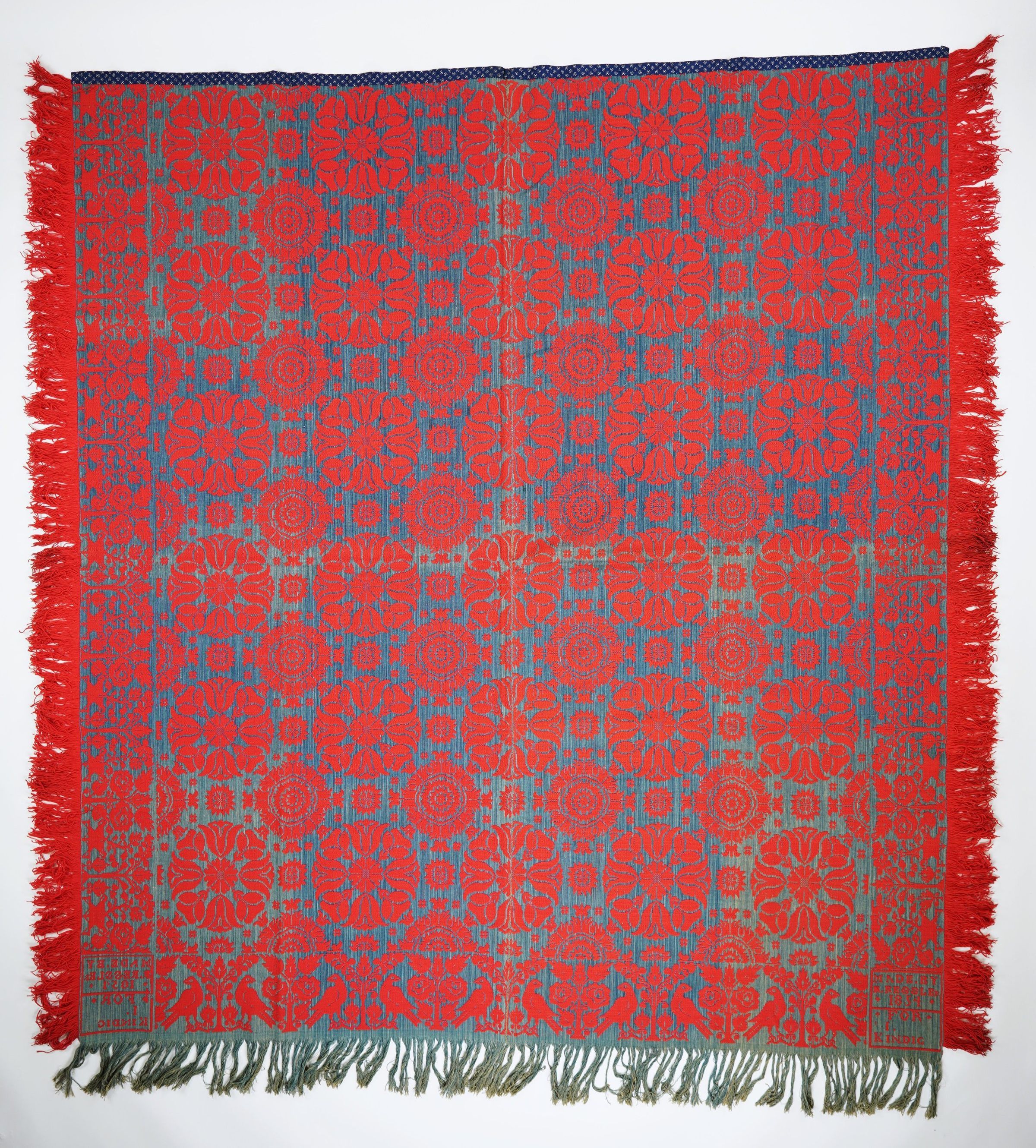 Red and denim blue figured Beiderwand coverlet; two panels joined by center seam; self-fringe on three sides; distelfink border on three sides; tulip medallion centerfield pattern.Collection