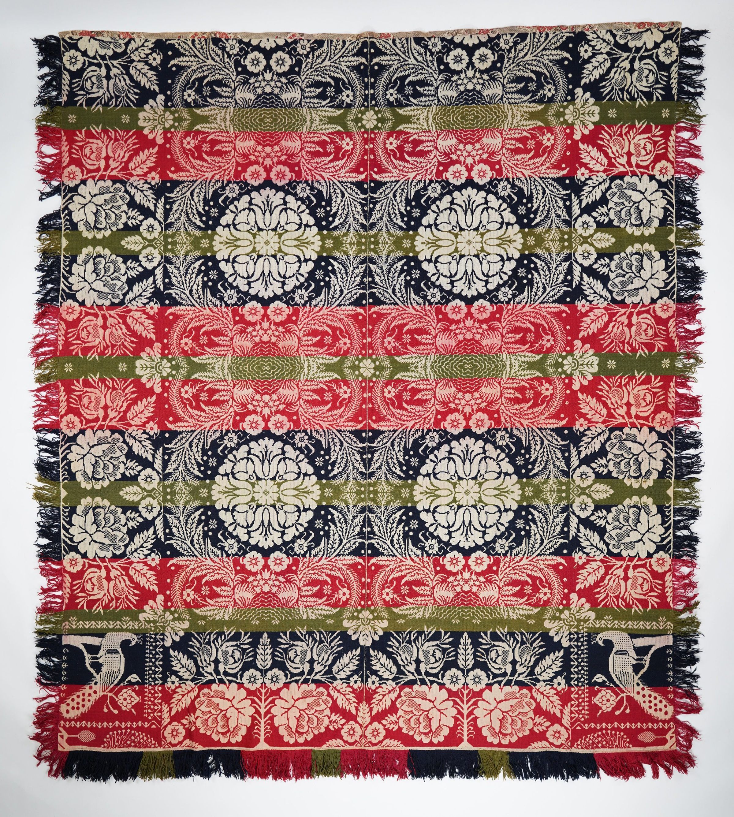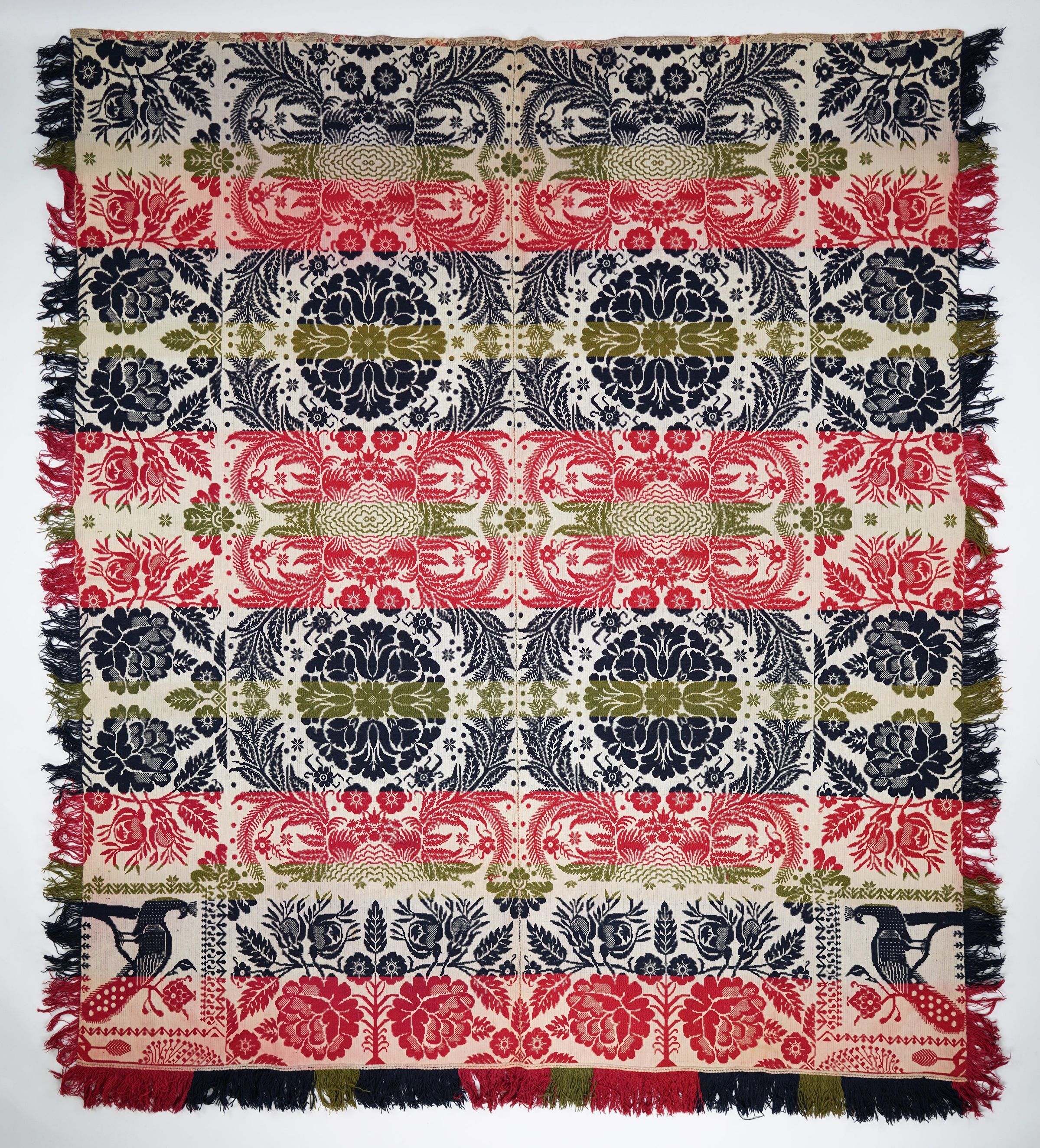 Red, navy, green figured Tied Beiderwand coverlet; two panels joined by a center seam; self-fringe on sides; applied fringe on bottom; peacock cornerblock; roses and buds border on three sides; tulip medallion centerfield pattern with vines and abstract motif.Collection
