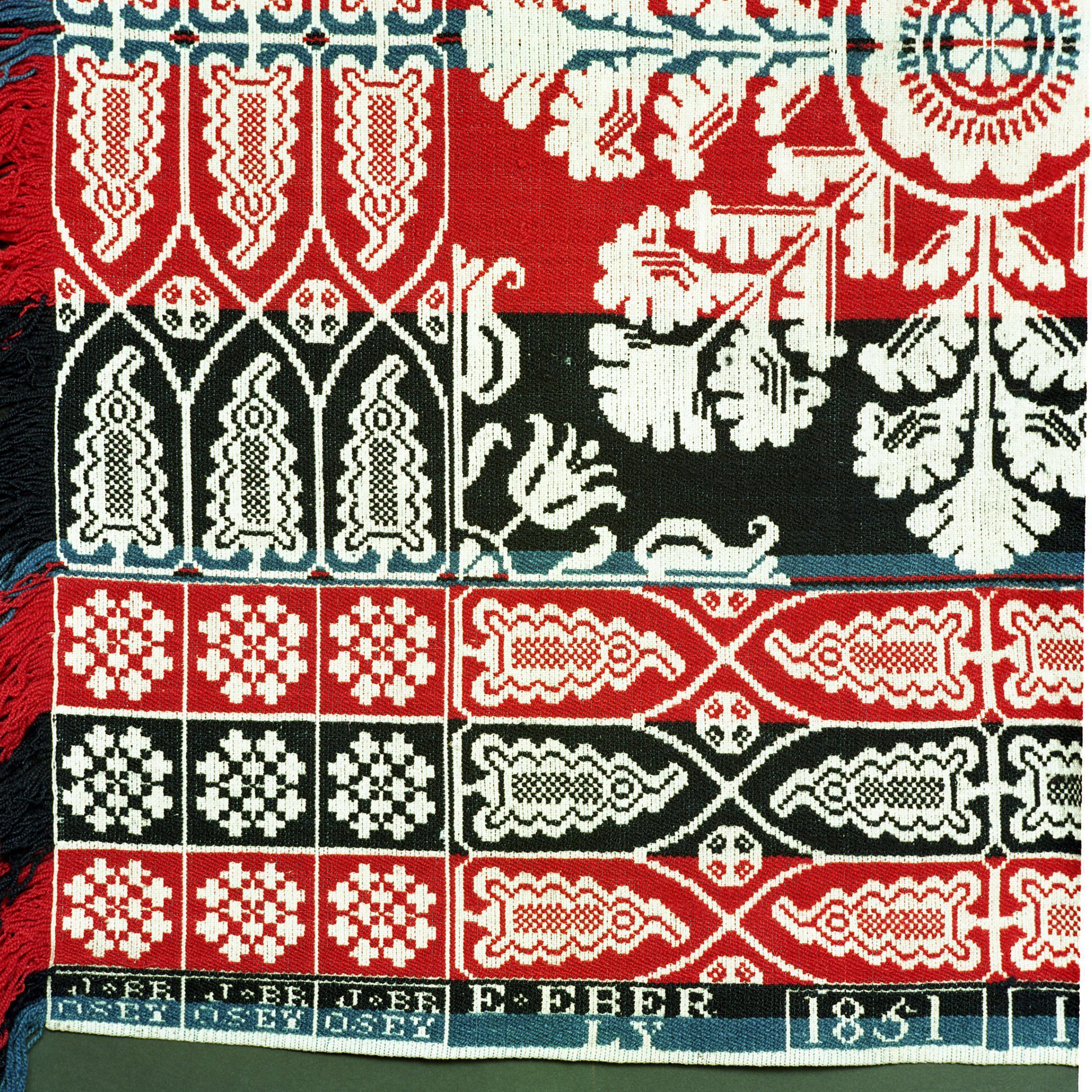 Beiderwand; blue, red, black; two loom widths joined; fringe on 2 sides; 2 corner blocks (inscription on bottom edge); corner blocks have 9 Greek cross spots; long sides have border of three rows of pod-like design; floral centerfieldCollection