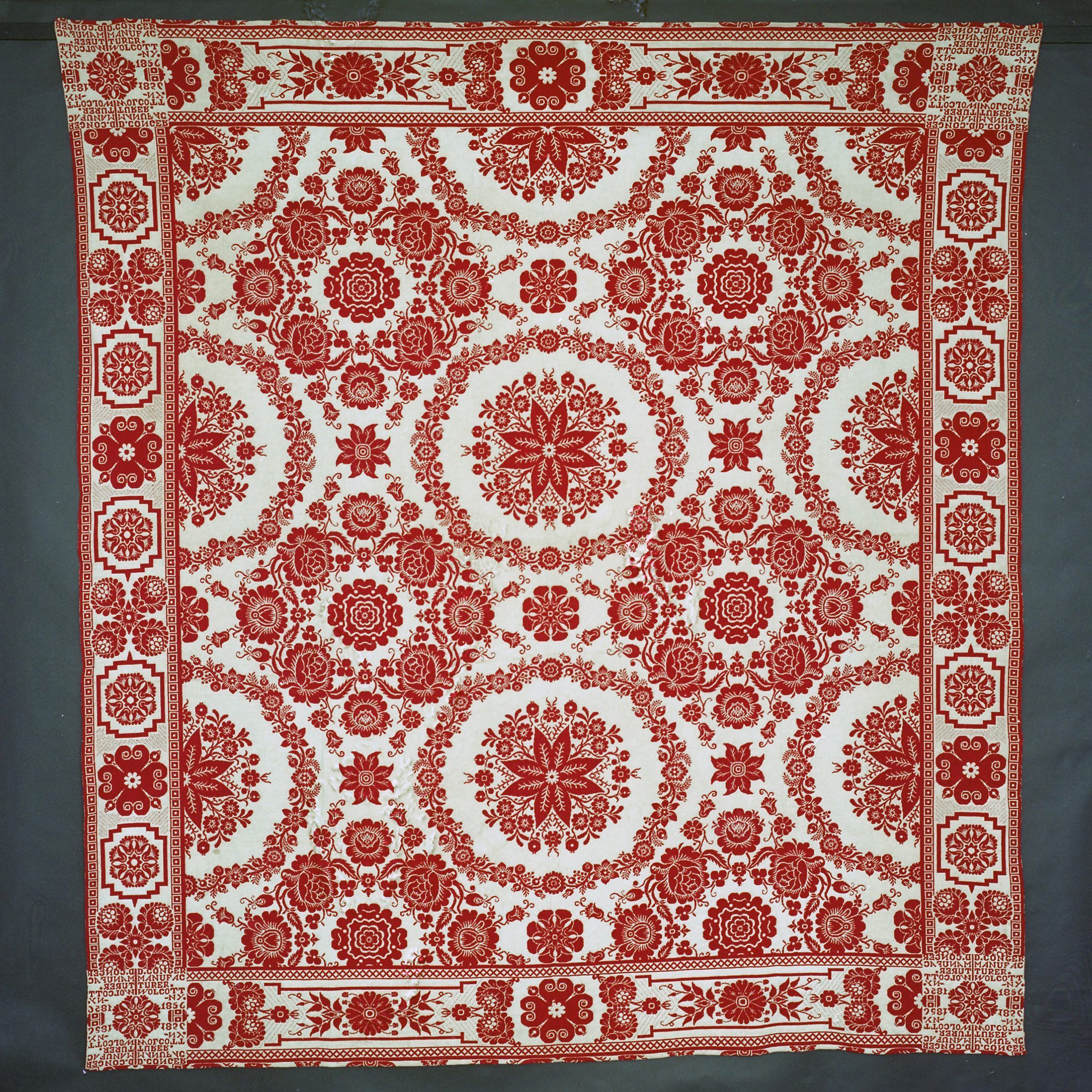 Double weave; red, natural; seamless; no fringe; two different borders, both of flowers; 4 corner blocks with inscriptions and flowers; centerfield of flowers surrounded by circles of flowersCollection