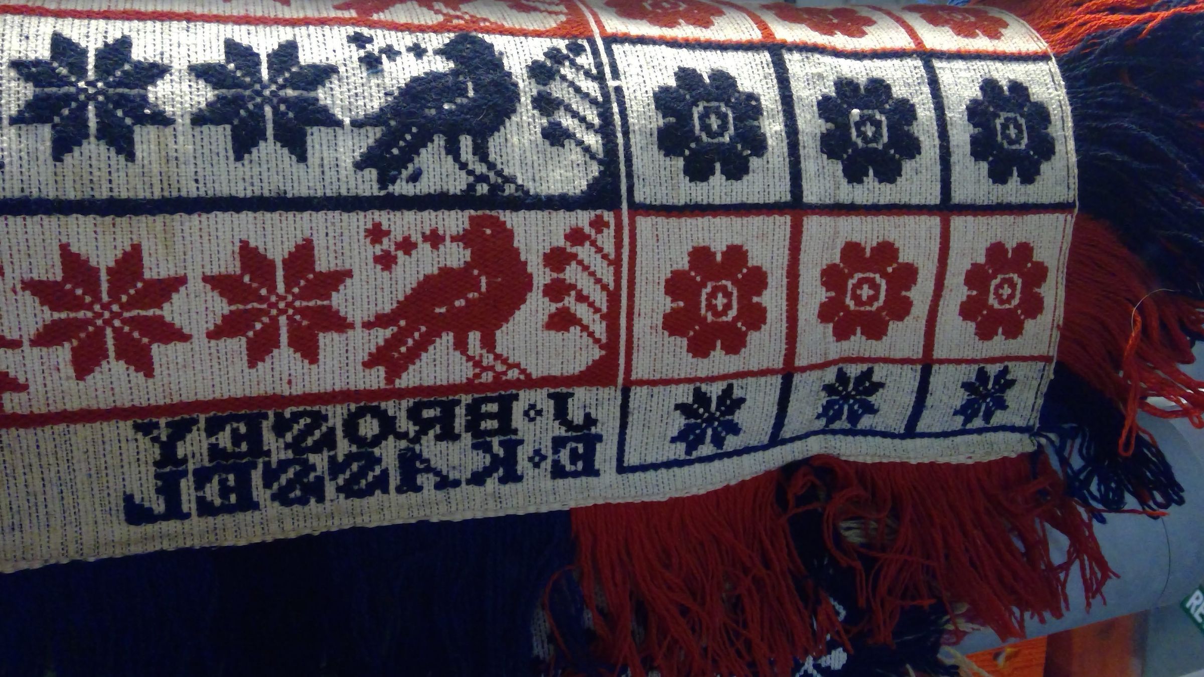 Beiderwand; navy, red, blue, natural; fringe on 3 sides; 2 loom widths joined; 2 corner blocks (inscription on bottom edge); corner blocks have 9 flowers, long sides have border of 3 rows of birds, stars, and trees; floral centerfield with starsCollection