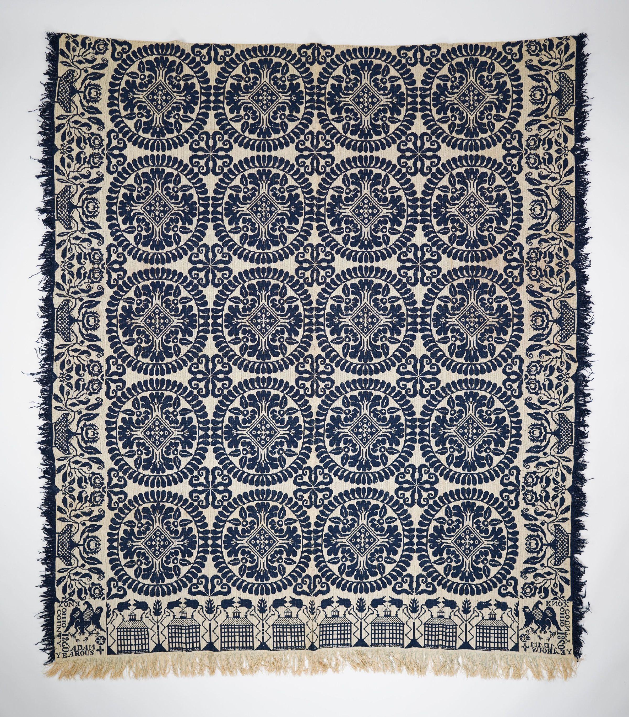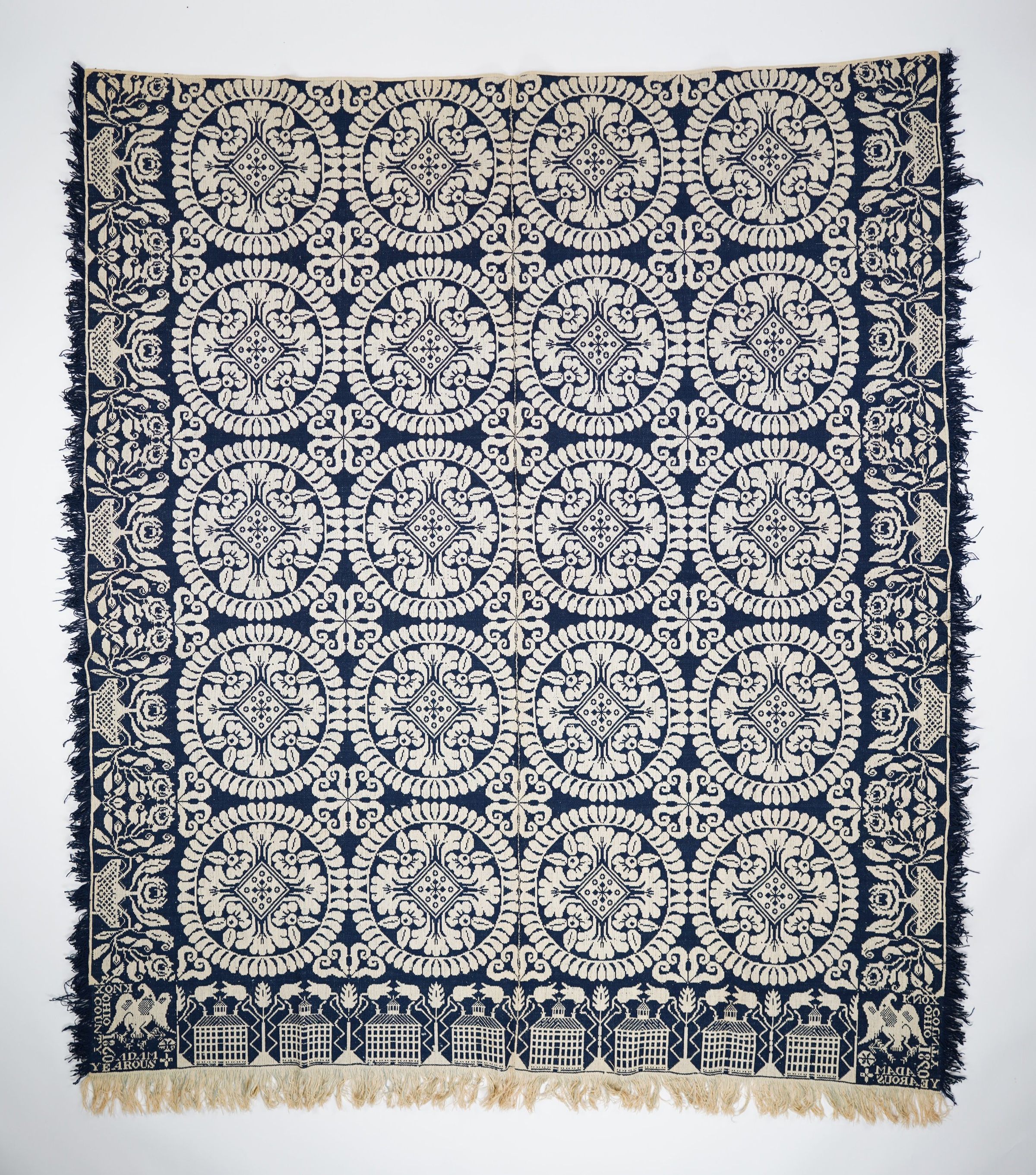 Navy and natural figured tied Beiderwand coverlet; two panels joined by a center seam; architectural border on bottom; floral border on sides; self-fringe on three sides; floral cross in wreath centerfield pattern.Collection