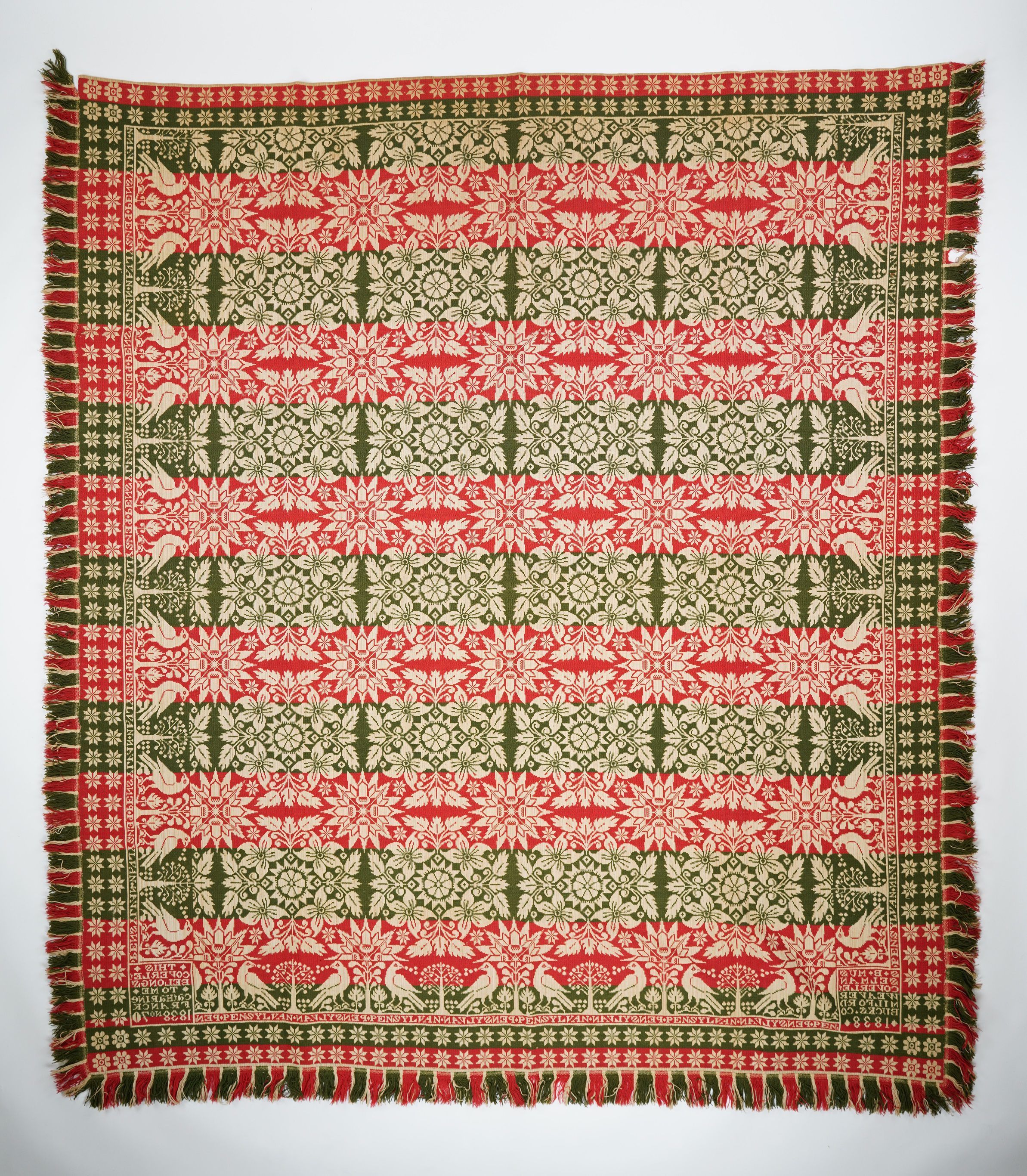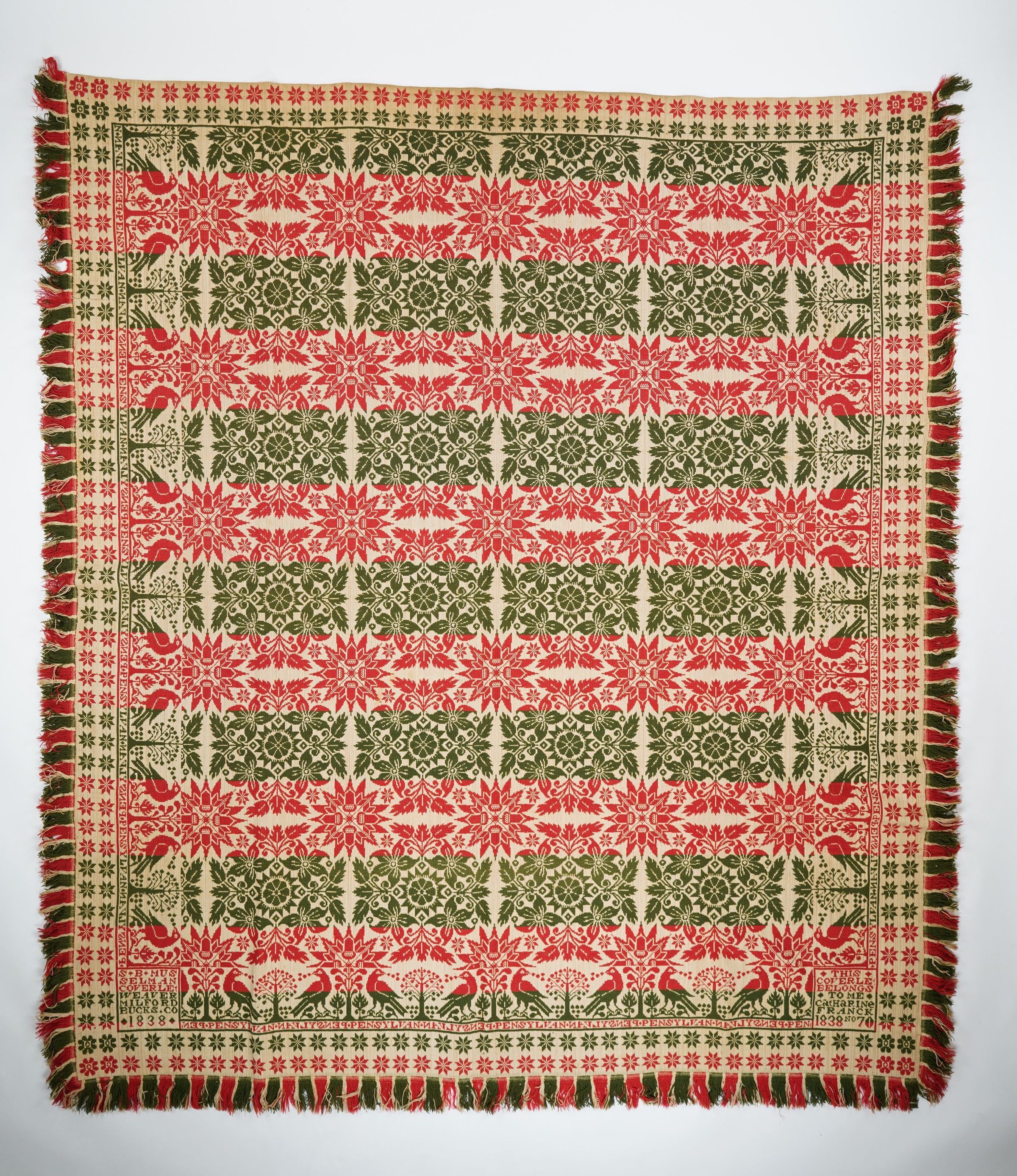 Samuel Beidler Musselman (c. 1802-1874) wove coverlets from 1837 to 1860 in Bucks County, Pennsylvania. At no. 70, this is one of his earlier coverlets; the highest number recorded on an extant coverlet is no. 878, woven in 1853.Collection