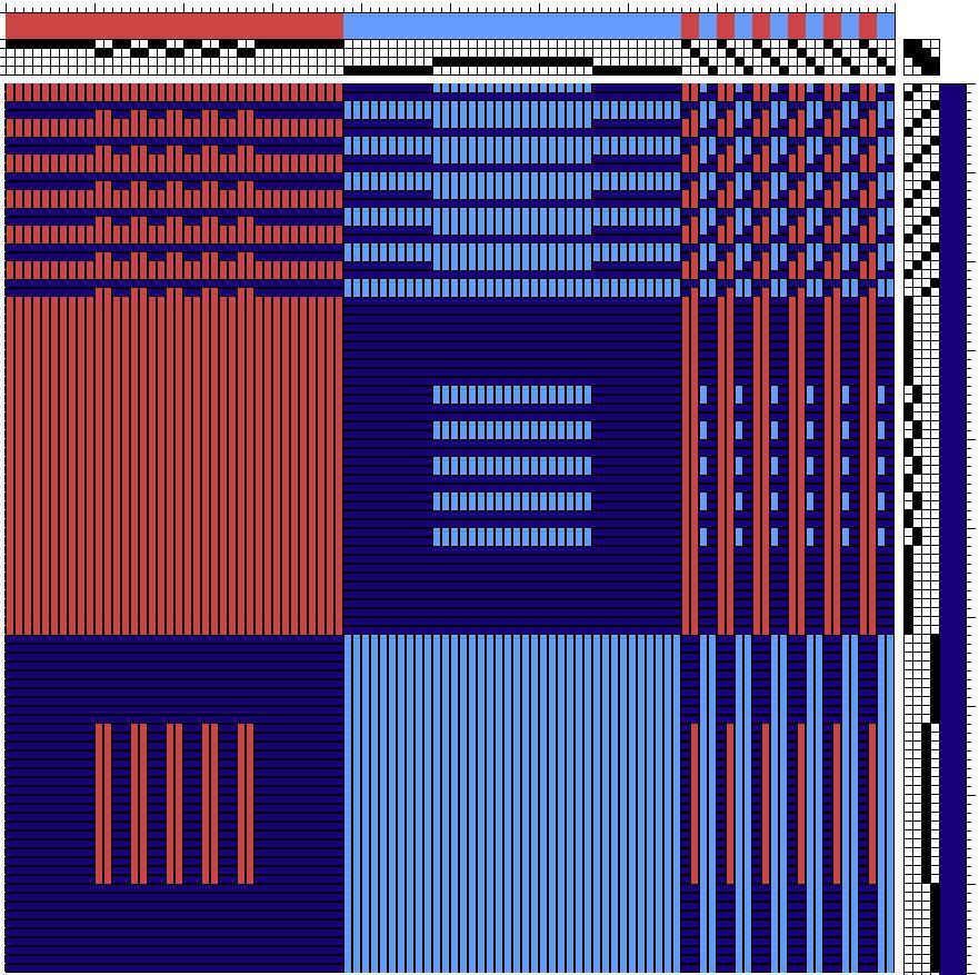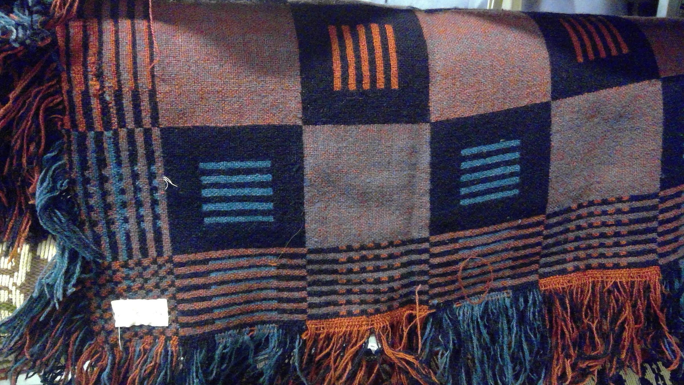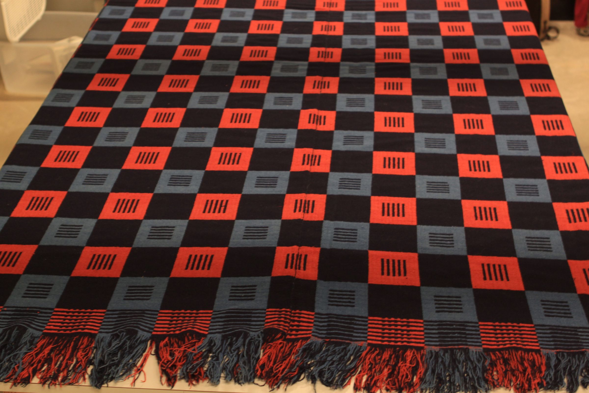 Double weave; geometric design of squares with 3 lines inside; two loom widths joined; fringe on 3 sides