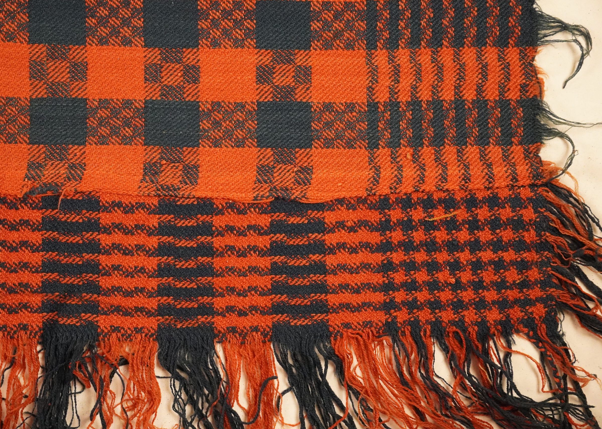 Red and navy geometric twill blocks coverlet; two panels joined by a center seam. Border and fringe on three sides.