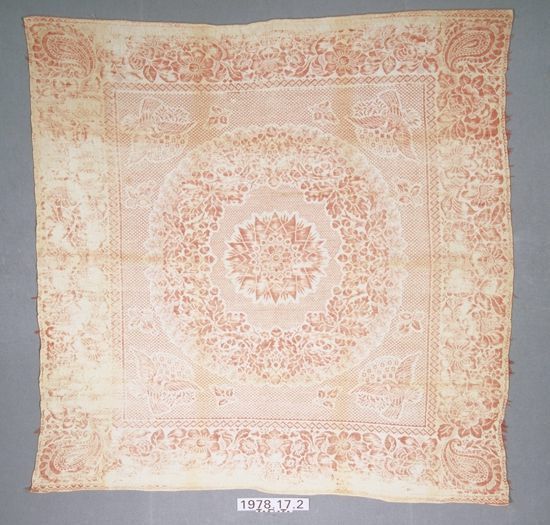 Figured Coverlet; undyed cotton and pink wool, double cloth. Selvedge on either side has a weft fringe; top and bottom edges are hemmed. Central motif in field is one non-repeating design with a central meadallion. Medallion is a stylized flower centering a starburst surrounded by a wreath of acorns and leaves. Each corner shows an eagle with a shield at its breast, holding arrows and an olive branch, with stars above its head. A flower sprig appears to the left and right of each eagle. The central area has a diapered ground. The central area is bounded by a plain border, a border of interlocking diamonds, and a wide floral border. A paisley motif appears in each corner. An additional diamond border appears outside the floral border and corner block at top and bottom.Collection